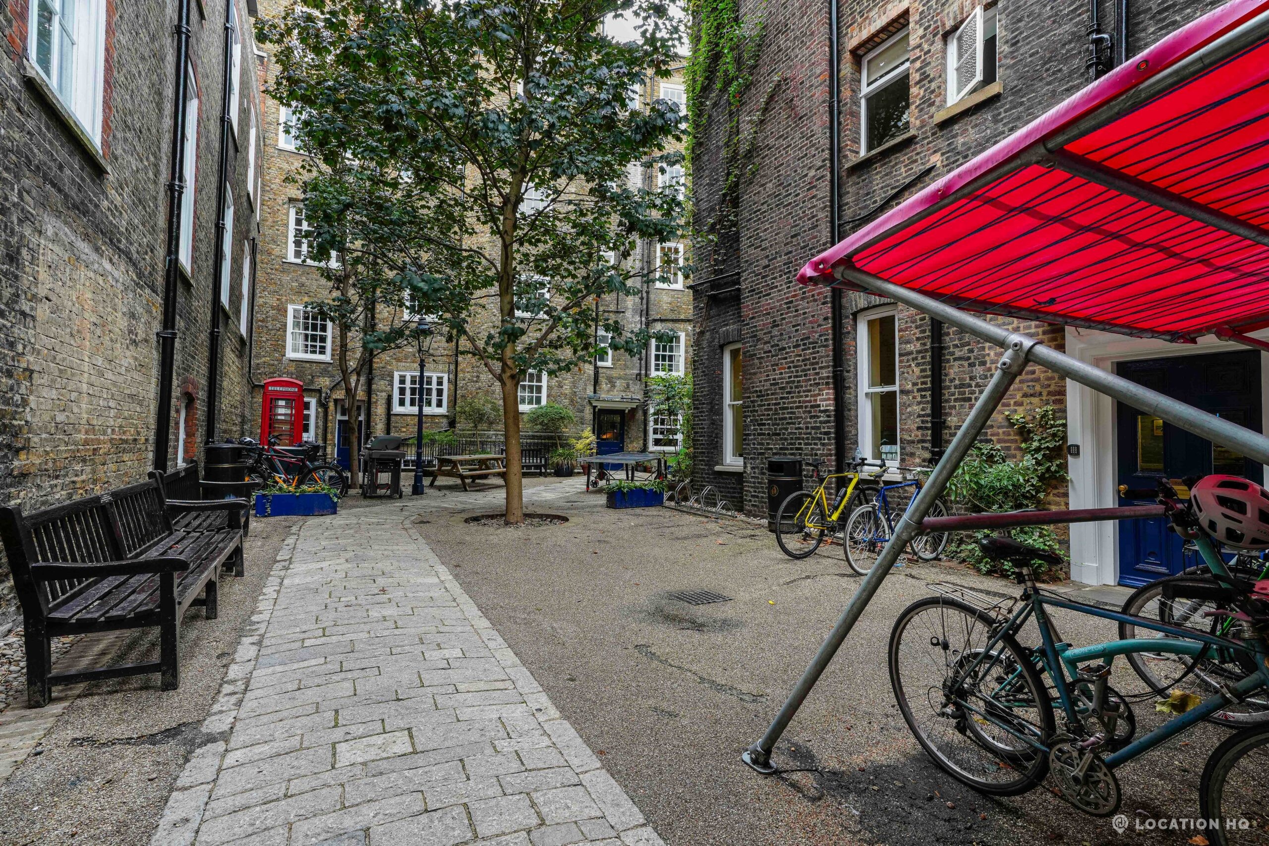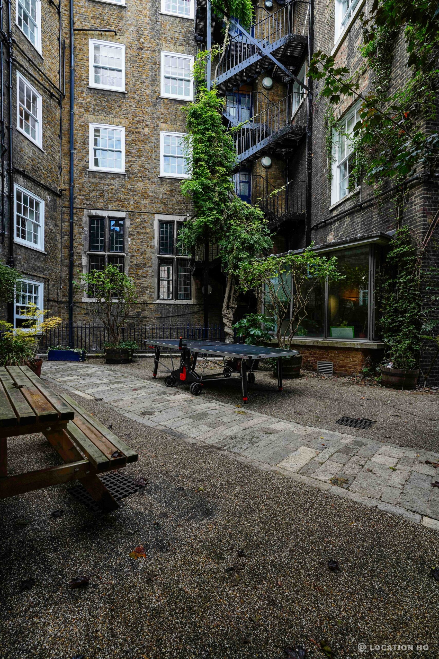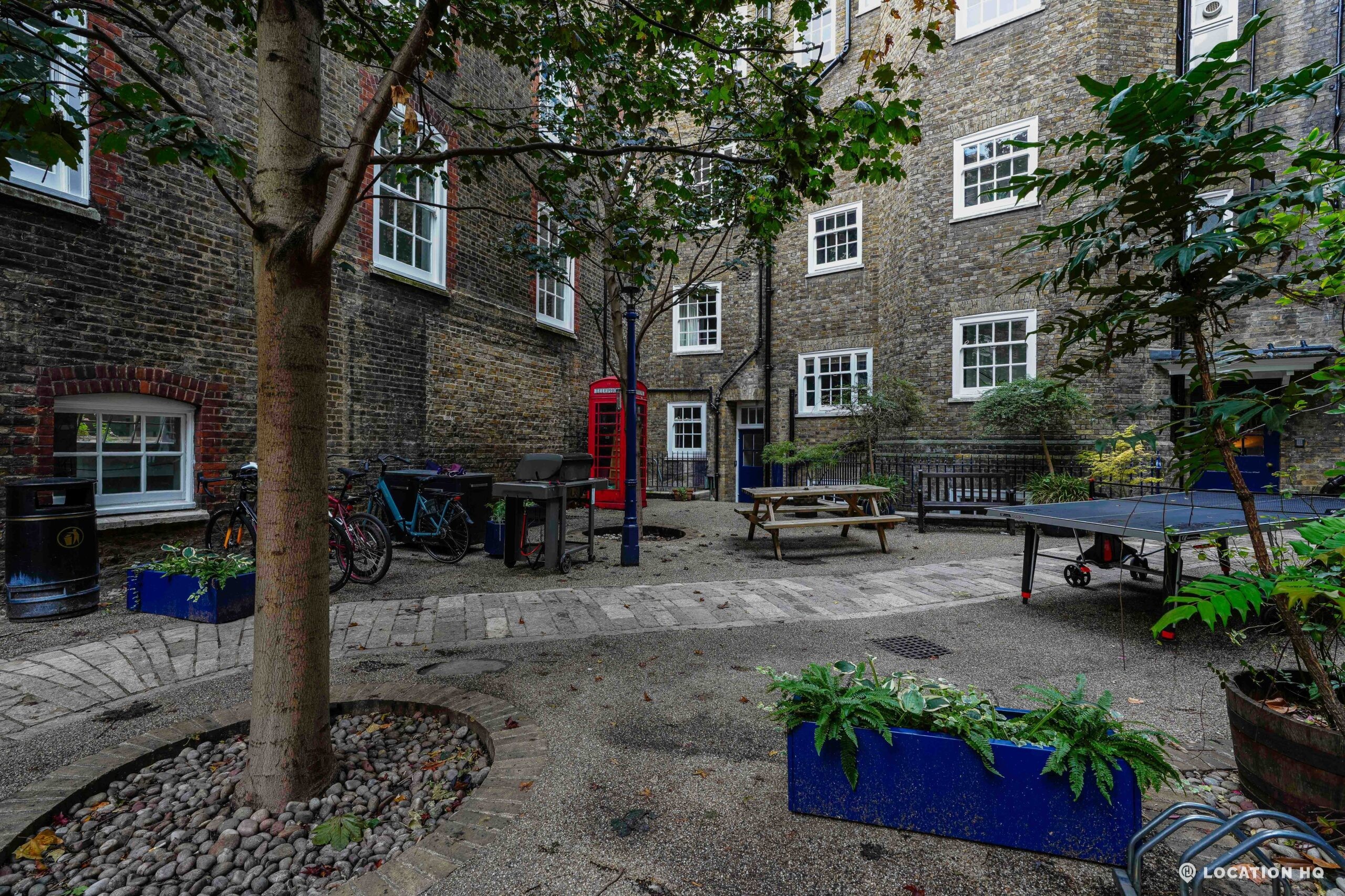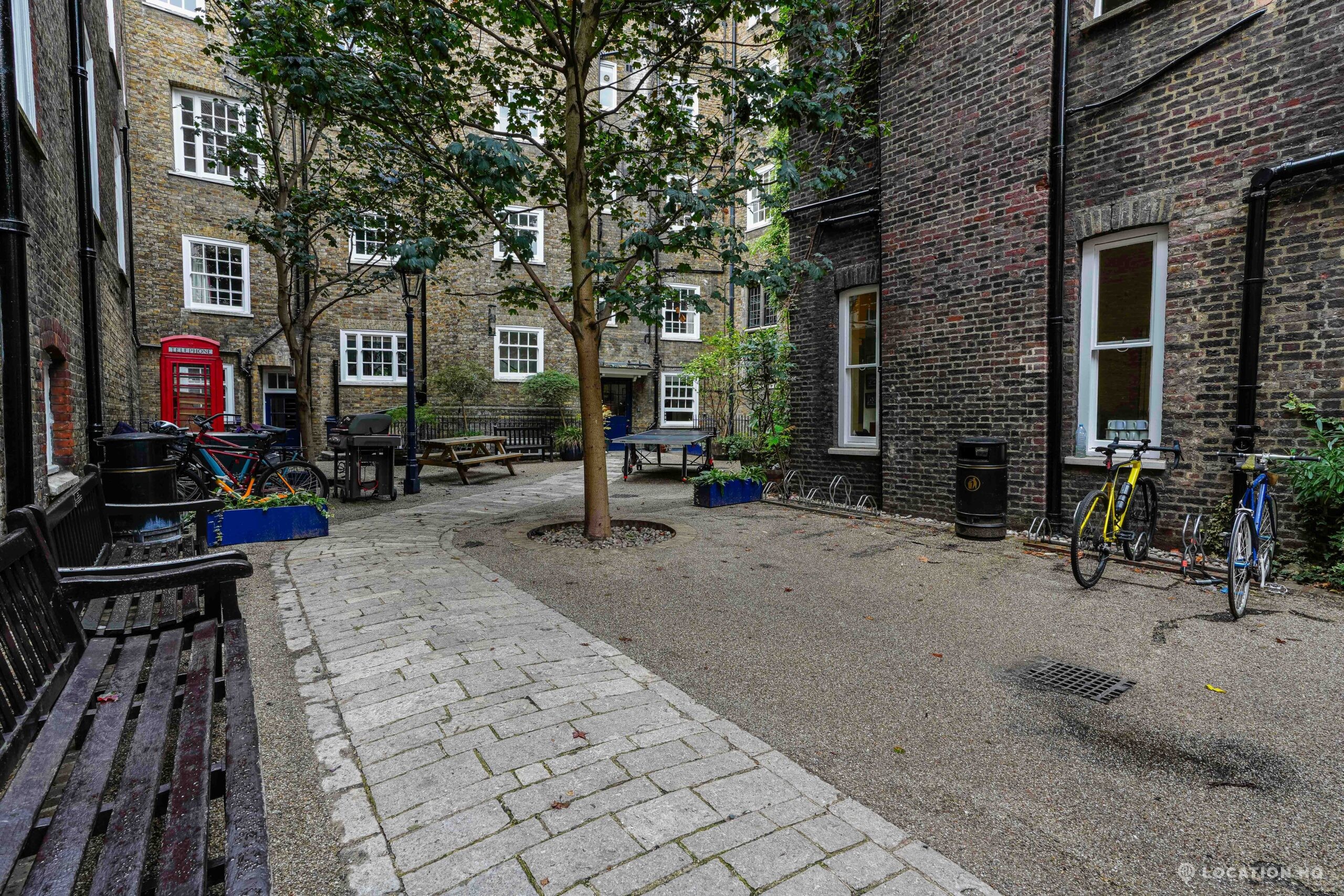 This Courtyard offers a softer, greener feel within a historic setting. Mature trees, simple benches and paved walkways surrounded by period brickwork and tall windows. Somehow romantic. Could be a double for a council flat block courtyard if you hang a little washing, all owned by one owner.