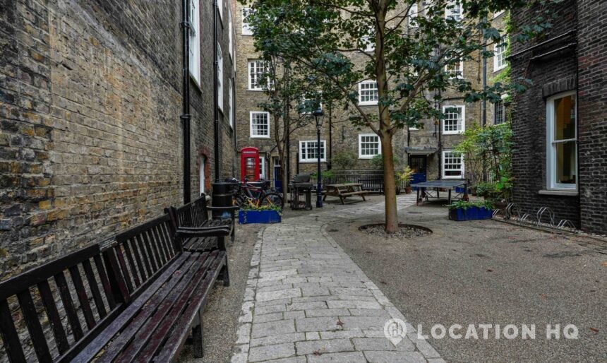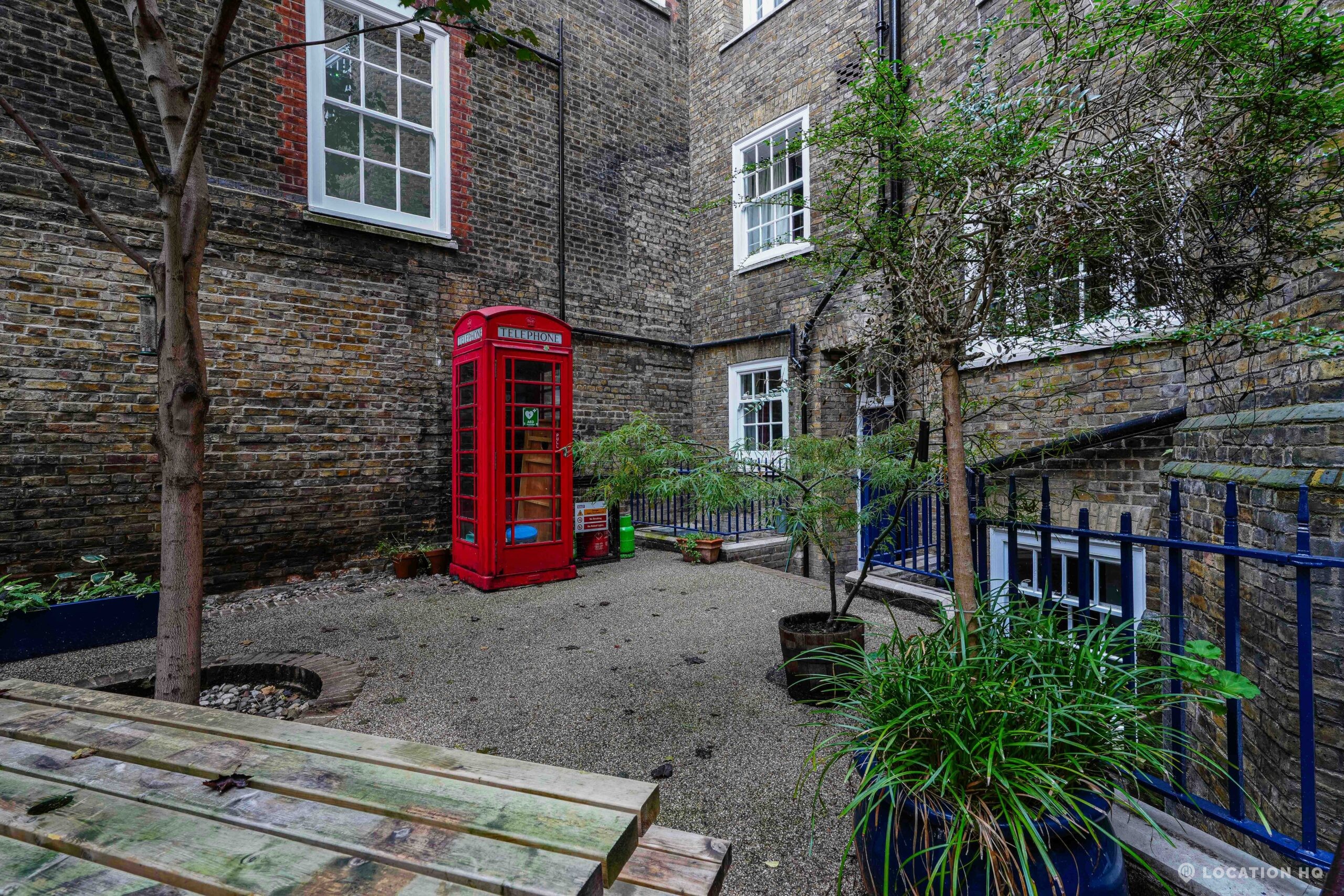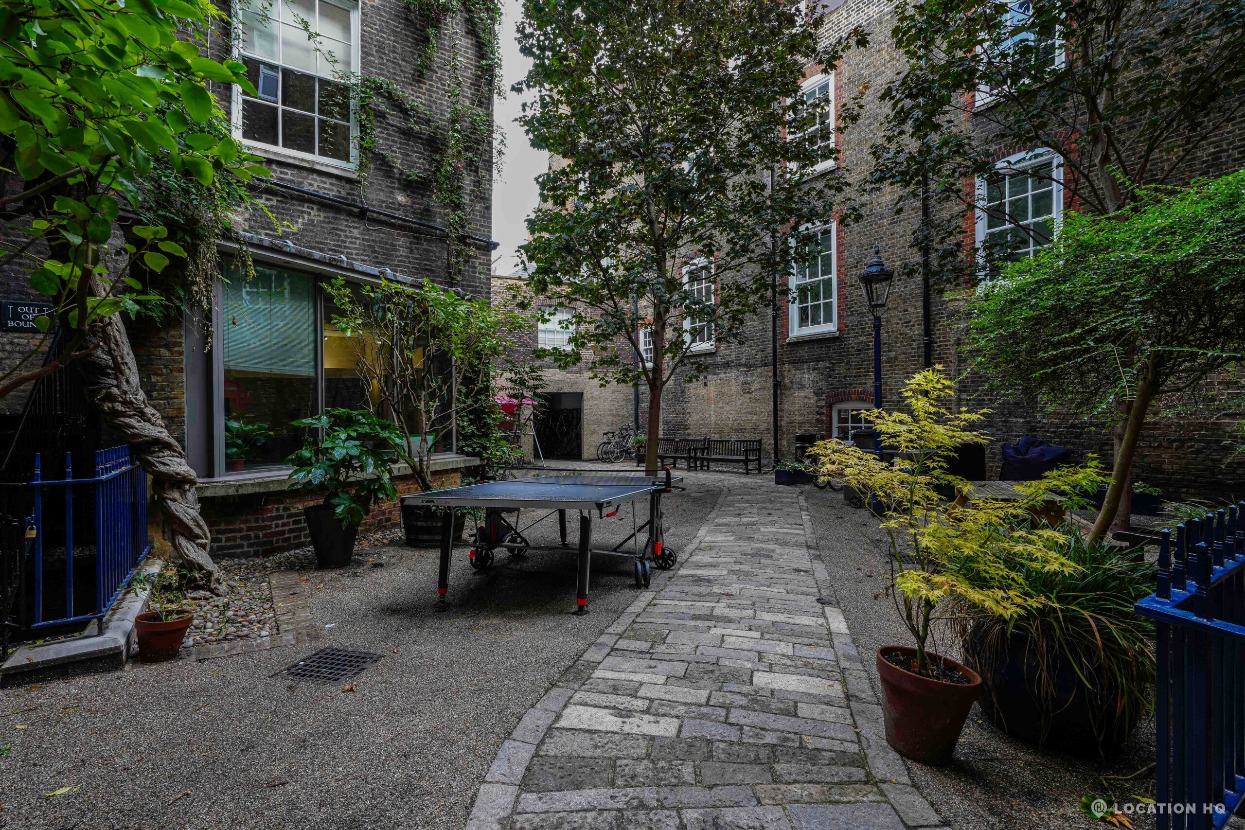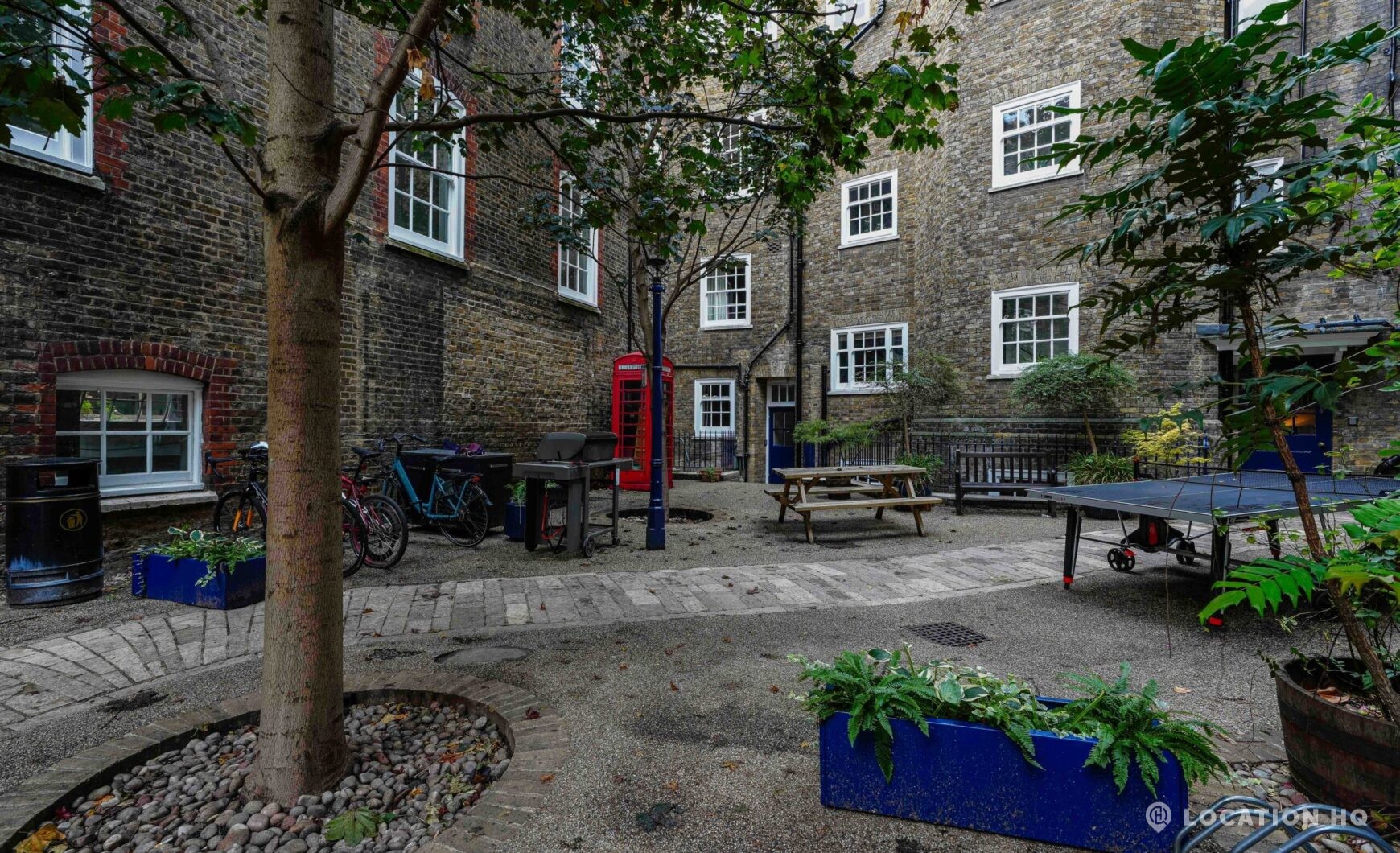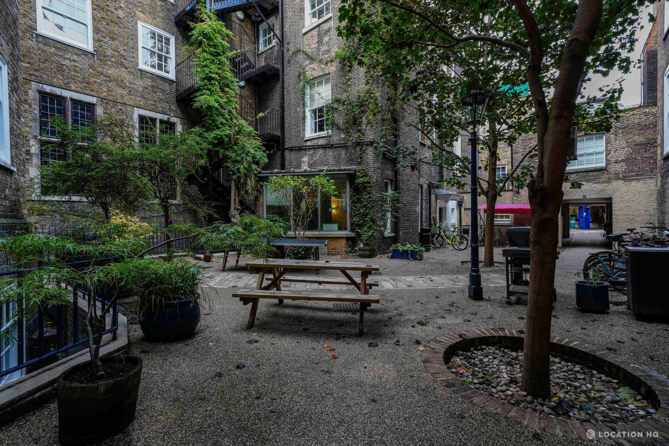 This Courtyard offers a softer, greener feel within a historic setting. Mature trees, simple benches and paved walkways surrounded by period brickwork and tall windows. Somehow romantic. Could be a double for a council flat block courtyard if you hang a little washing, all owned by one owner.