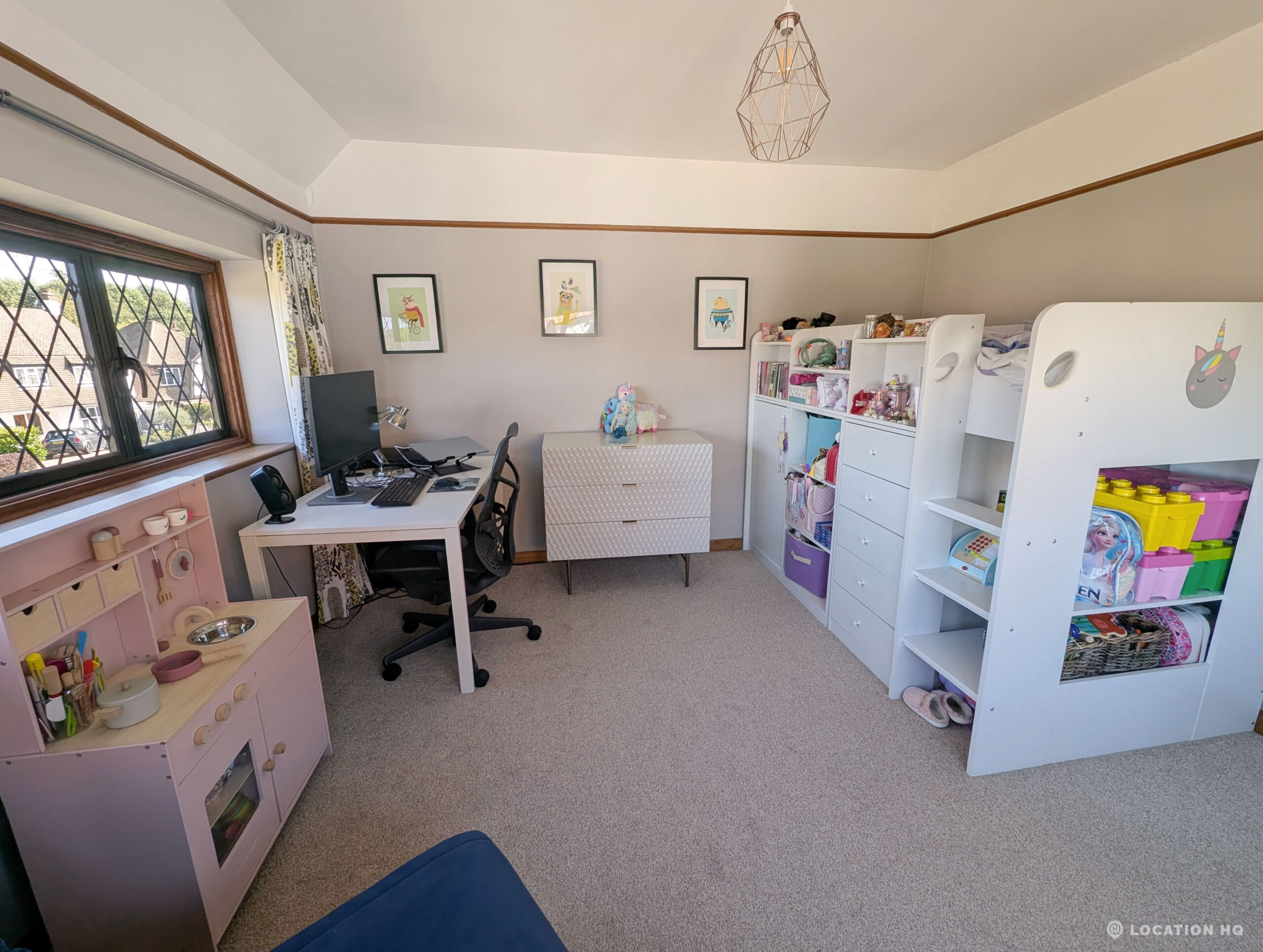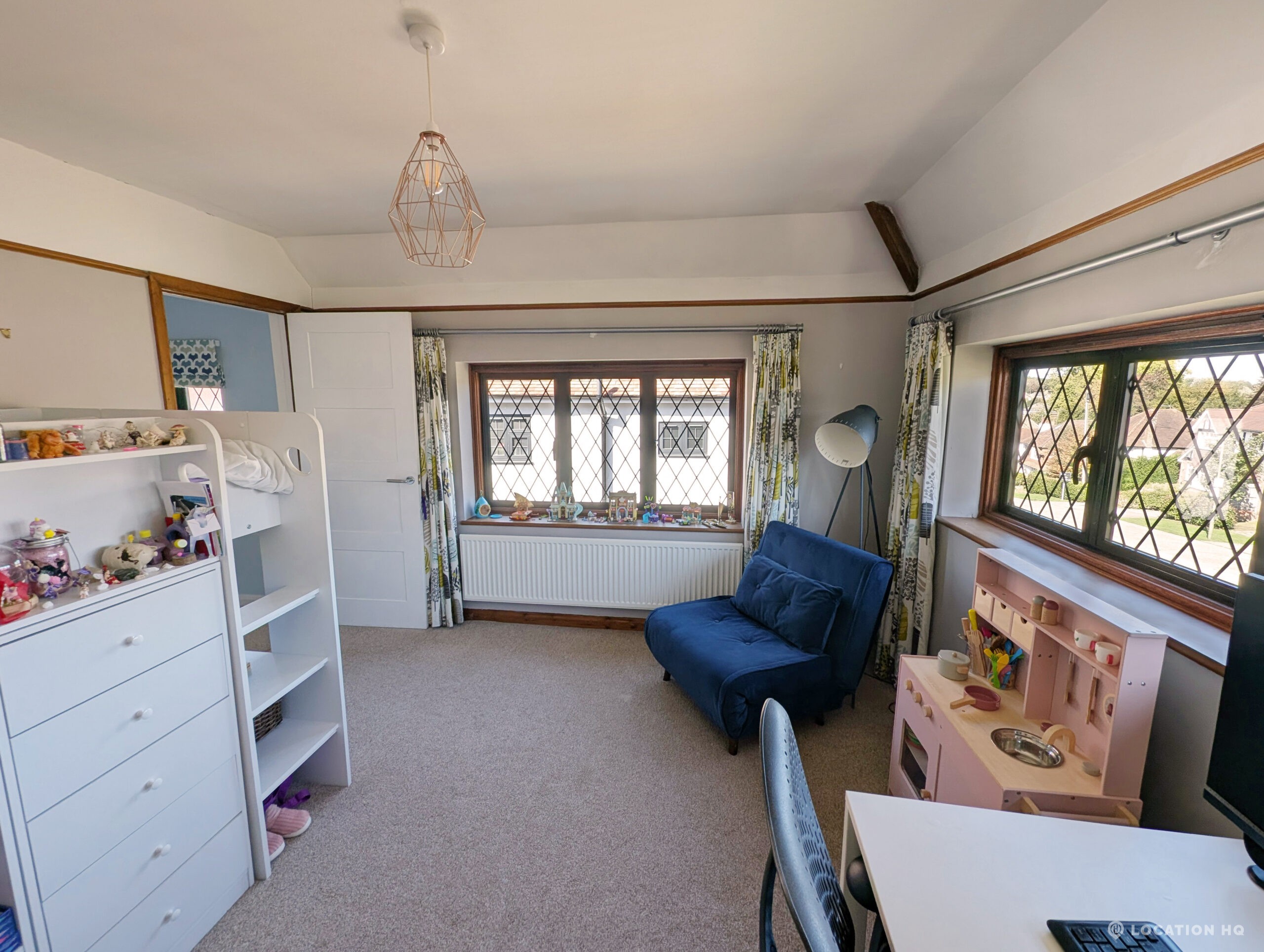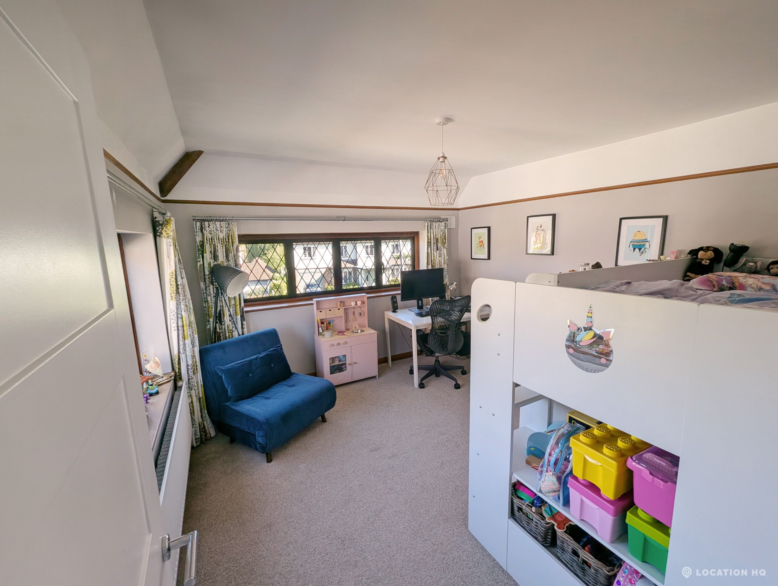 There are three tastefully designed bedrooms, a well-appointed study, and a family bathroom on the upper level, in addition to a convenient downstairs shower room. Of particular note is the prevalence of dual-aspect rooms, affording filmmakers the flexibility to manage and manipulate lighting to suit their creative vision.