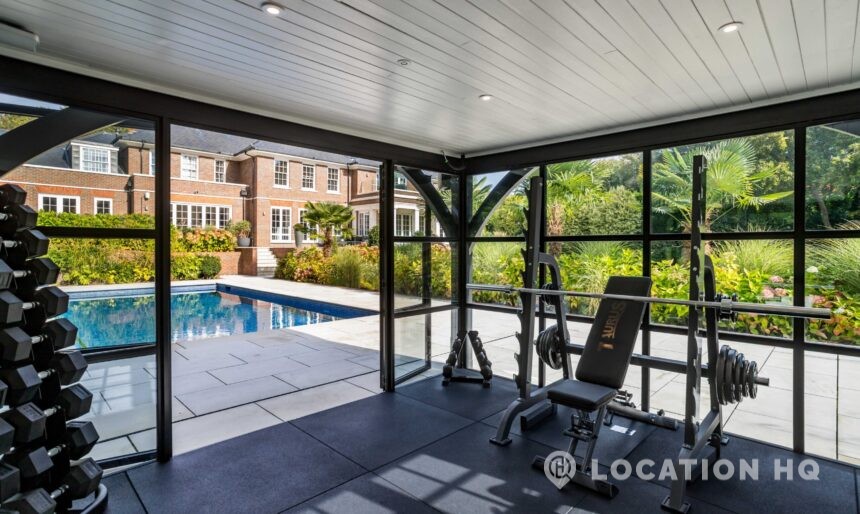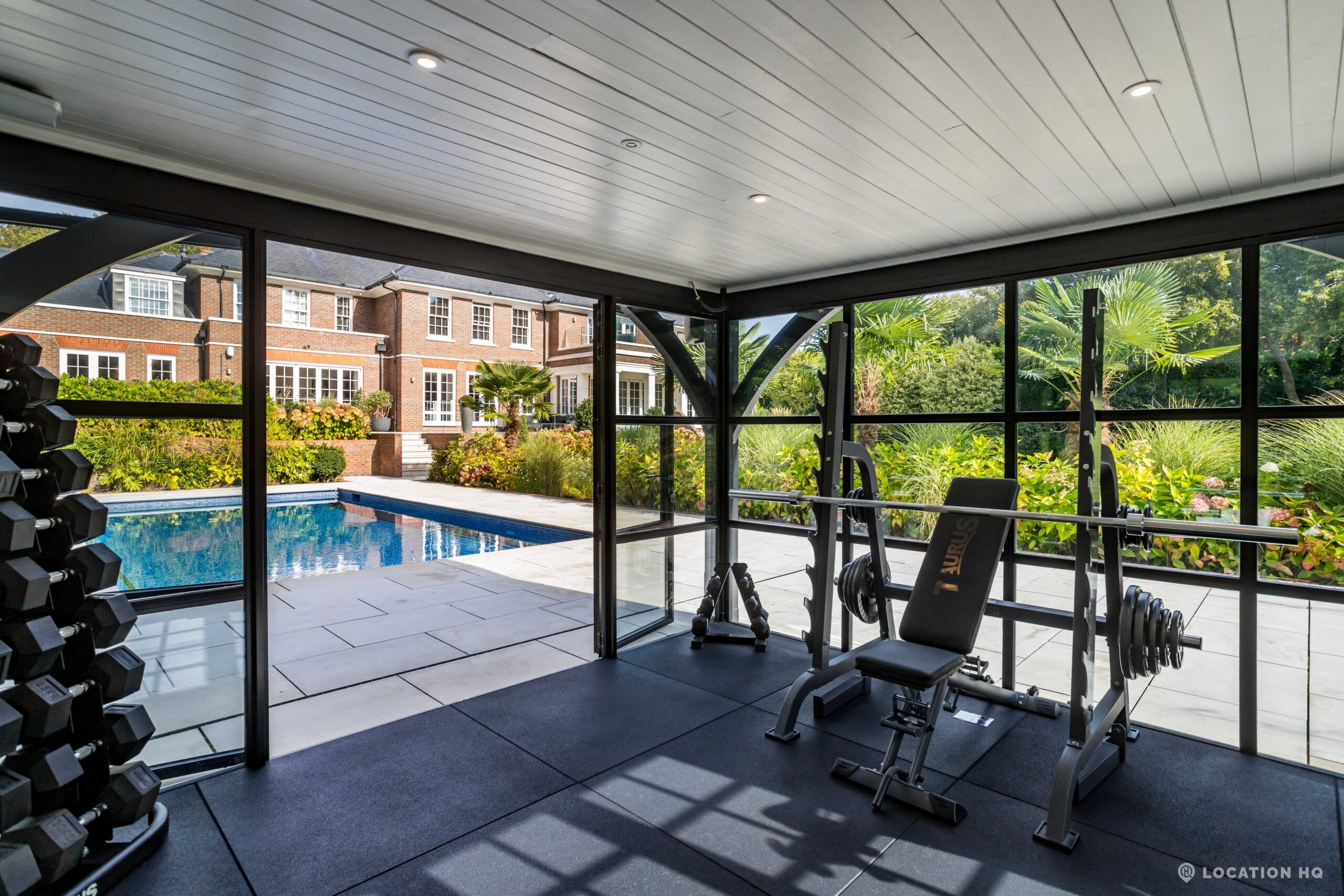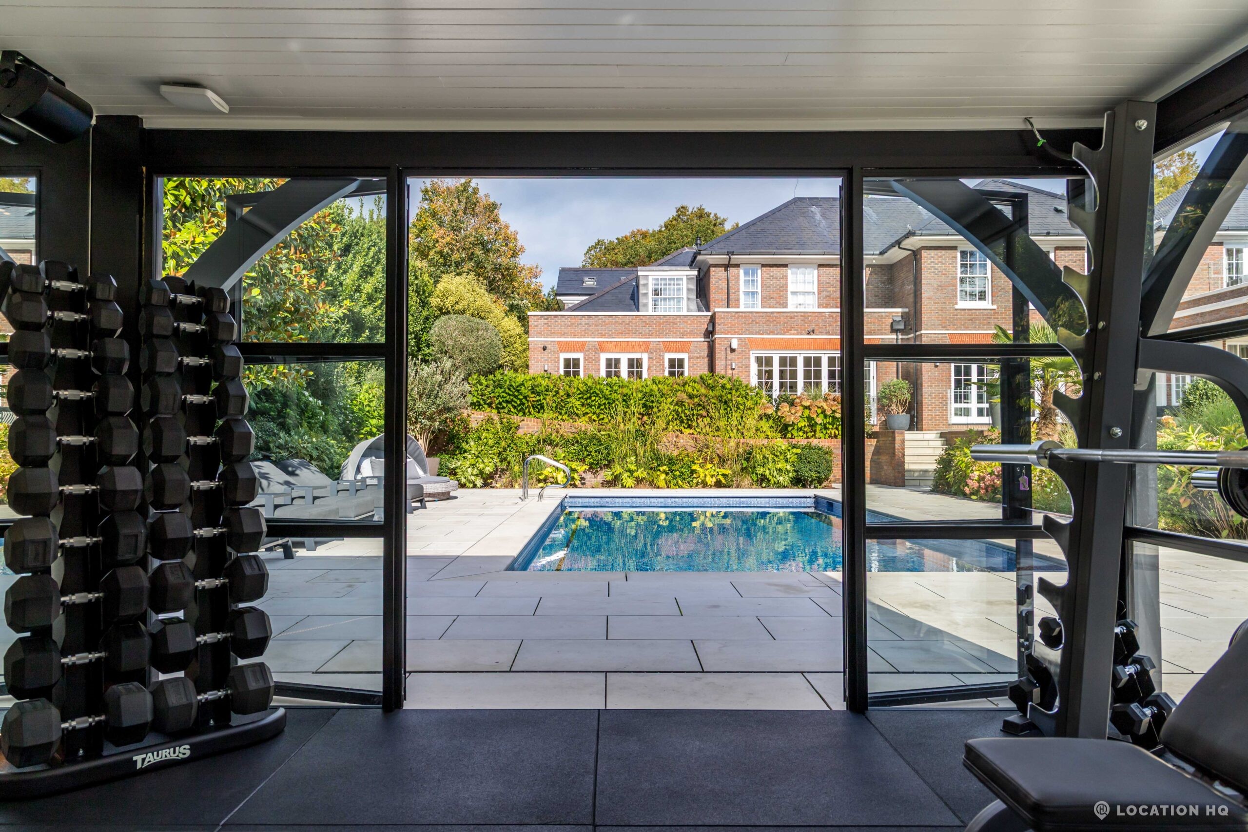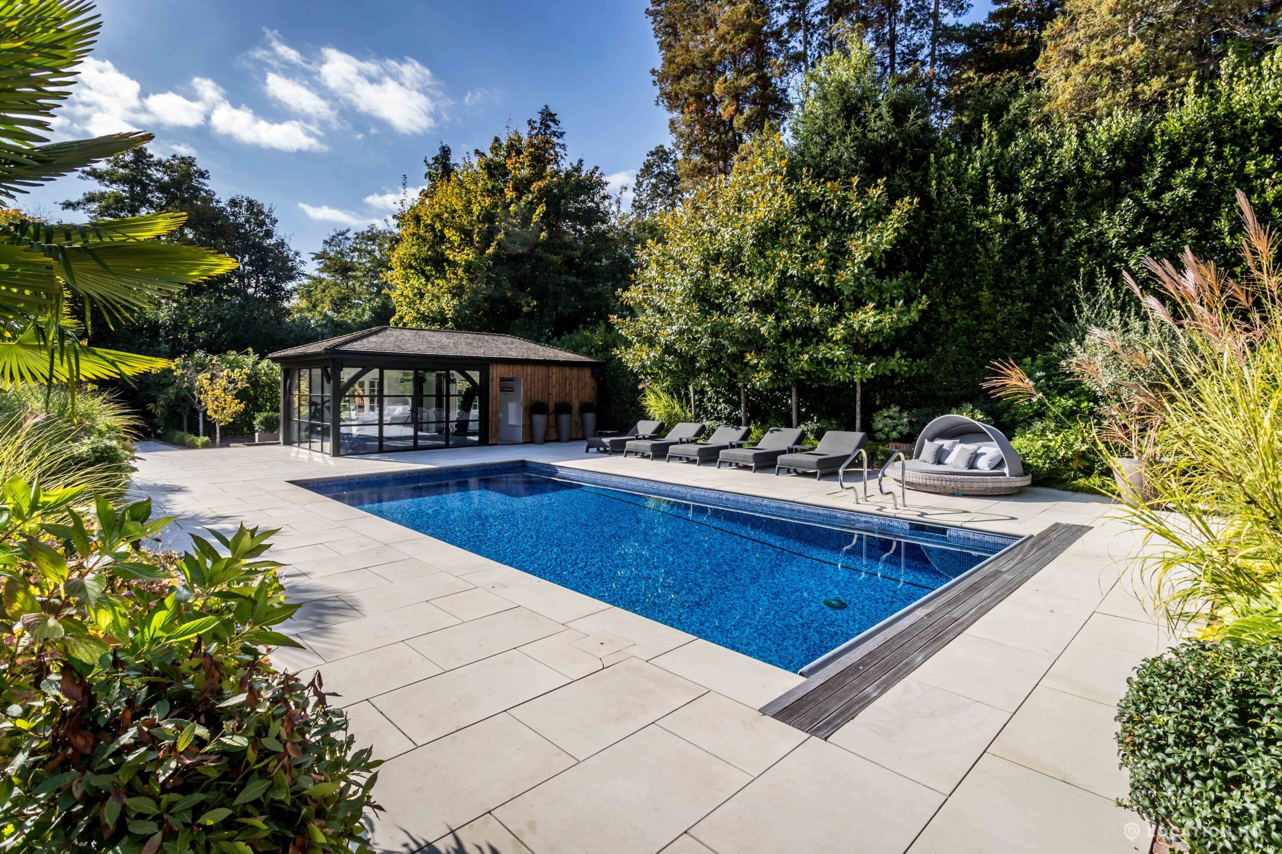 Outside, landscaped gardens include a heated swimming pool, gym, pool house, outdoor kitchen, firepit and seating areas, alongside a large gated driveway providing excellent access and privacy.