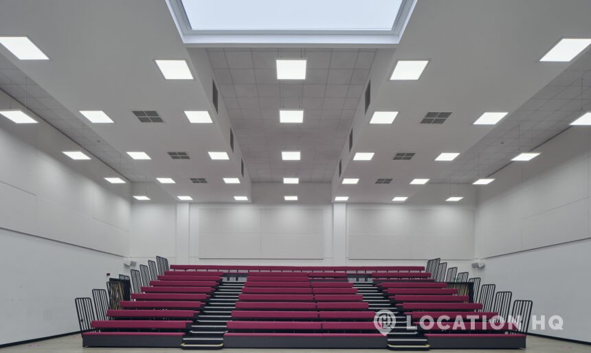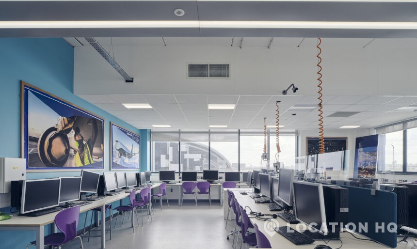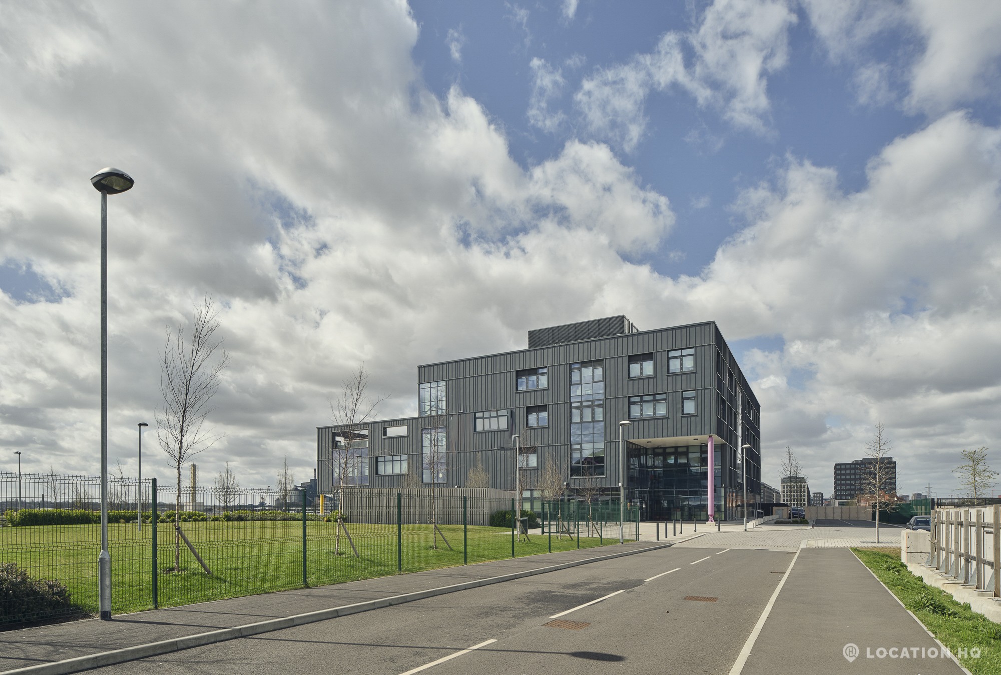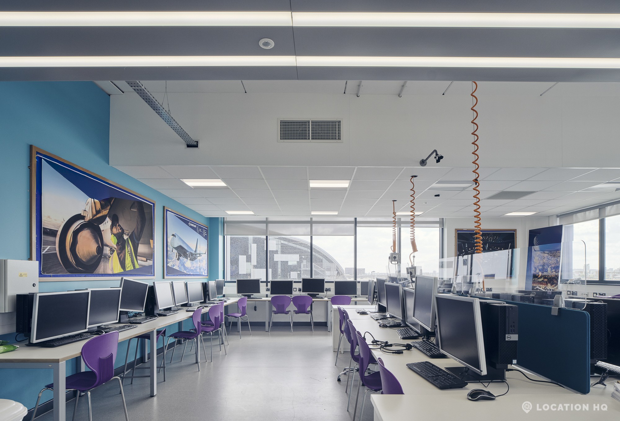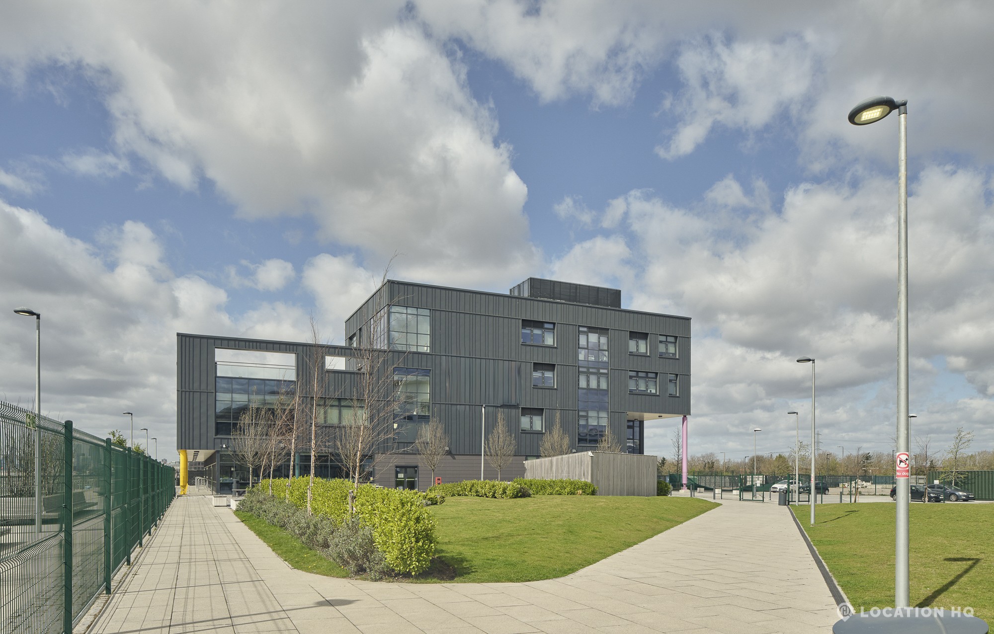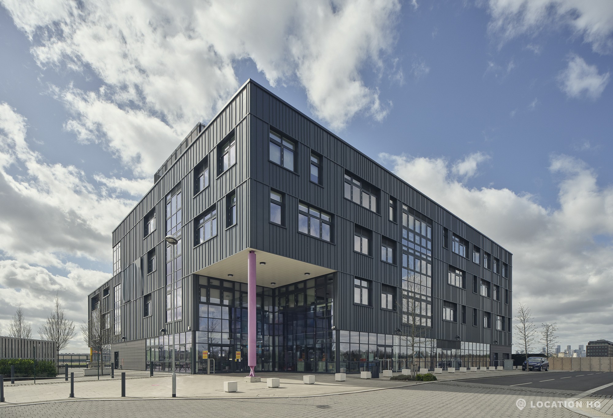Exclusive to Location HQ. Modern London design and engineering college. Doubles well as an office, workshops, tech labs, manufacturing or a high tech development factory. Multiple classrooms, engineering workshops, design lecture rooms, corridors, lecture theatres, atriums, staircases, and wonderful modernist exterior spaces with city views. Private road on site and a large unit base for ease.