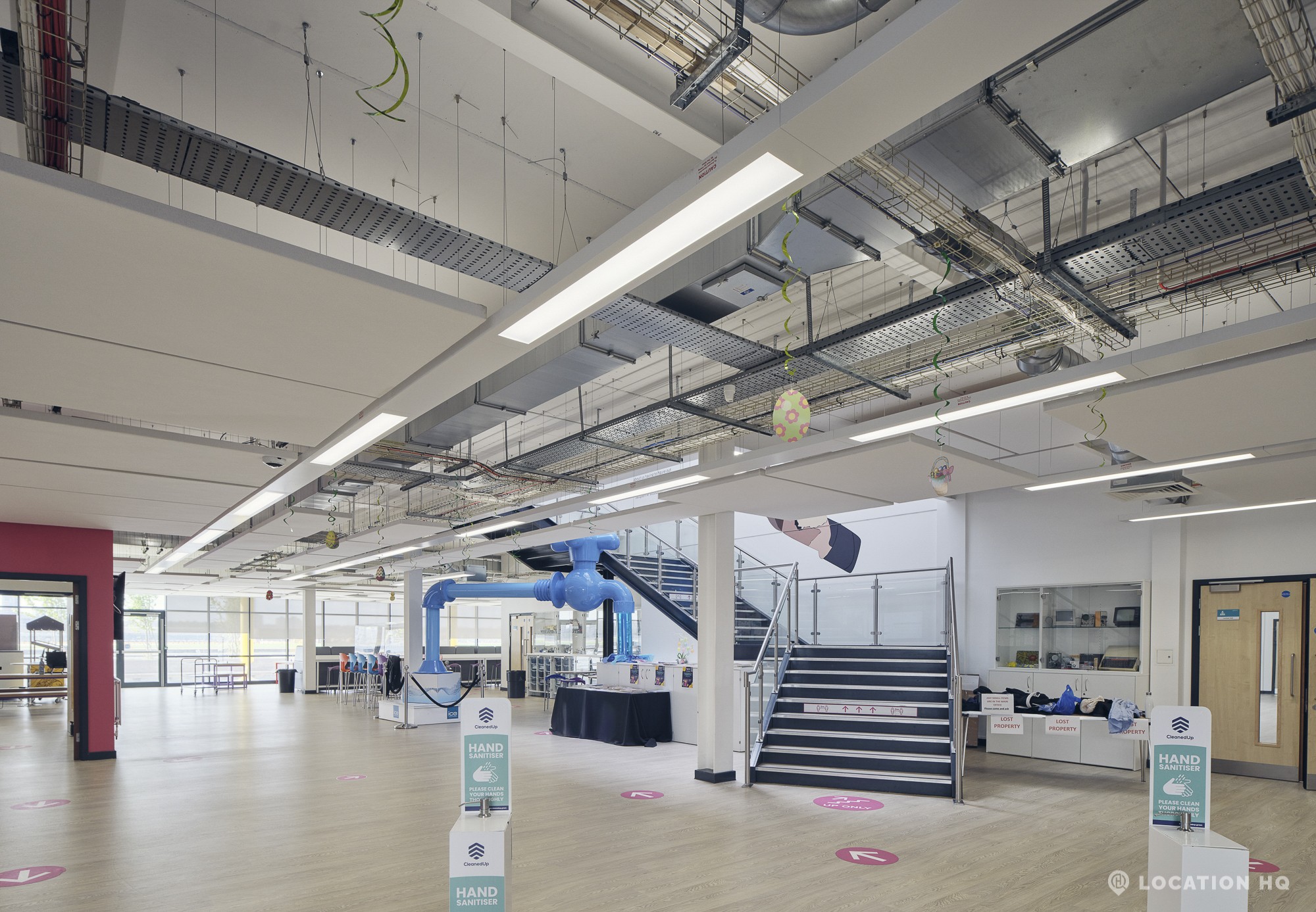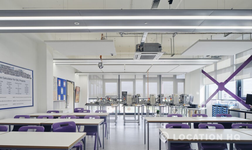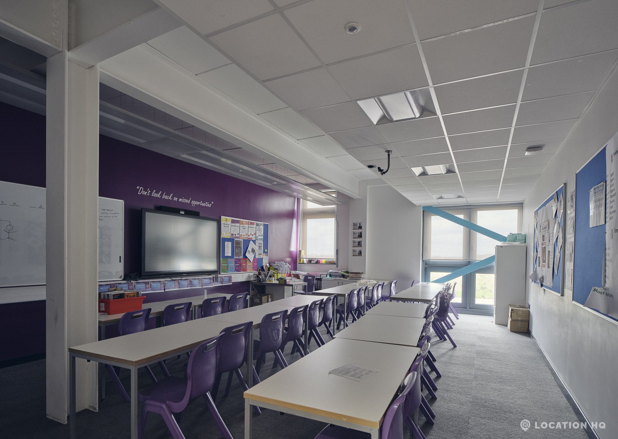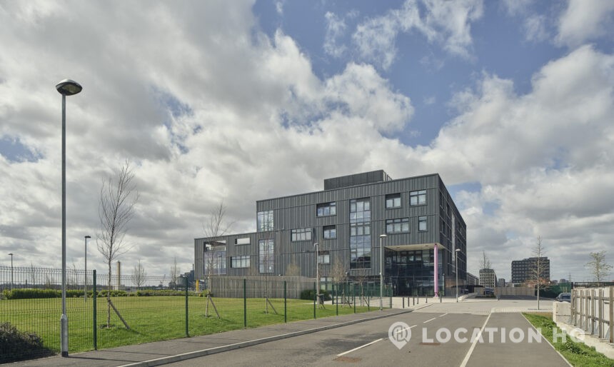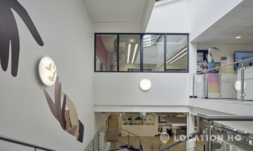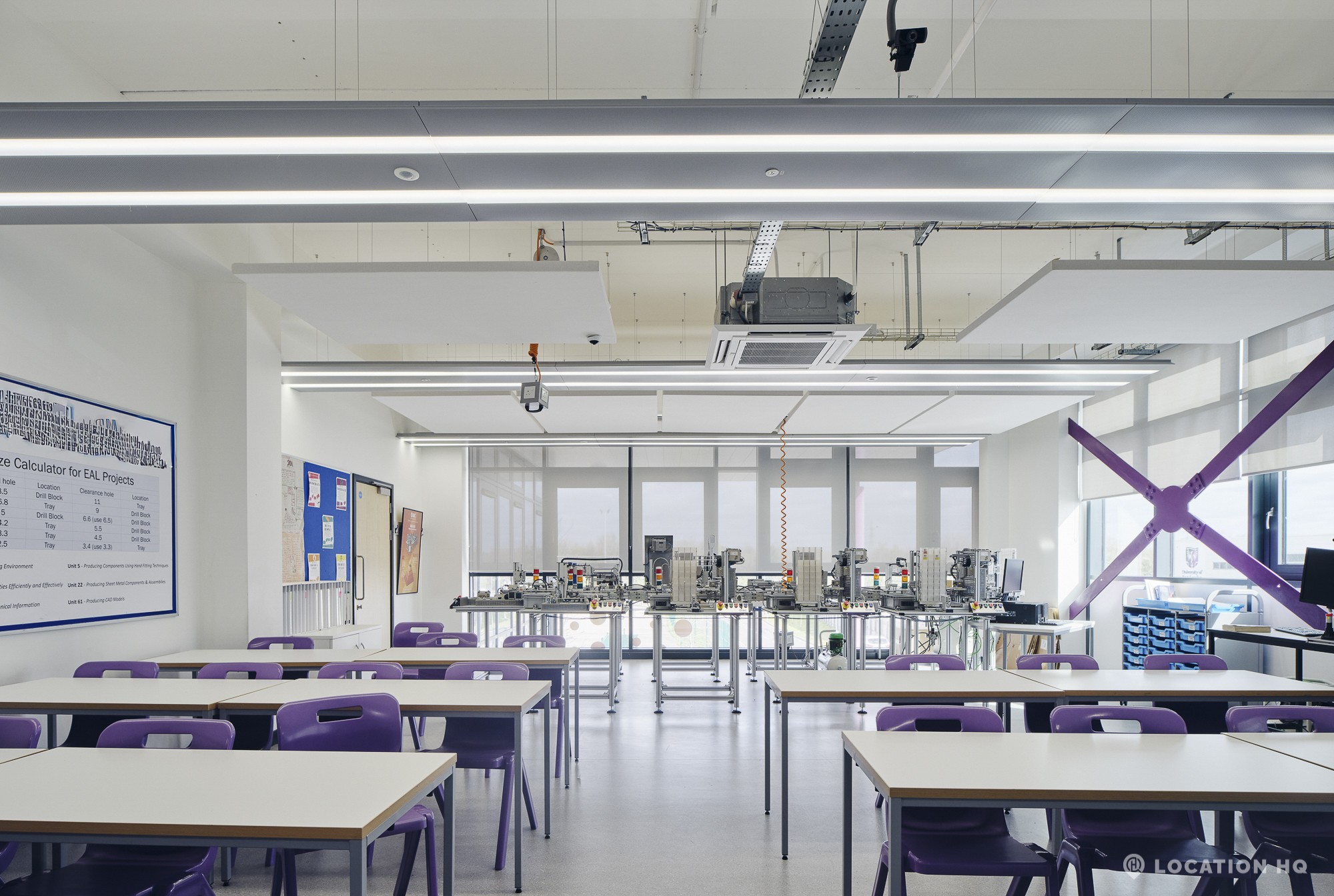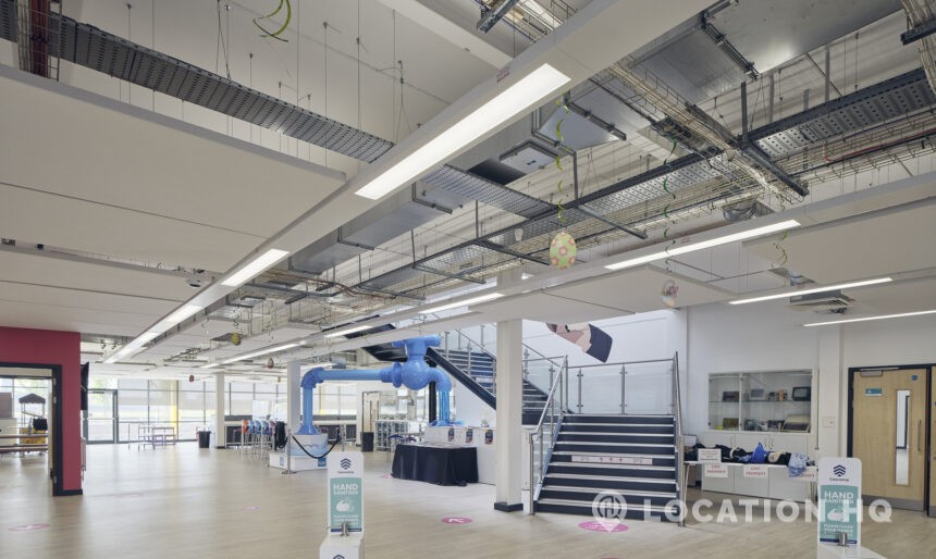 Exclusive to Location HQ. Modern London design and engineering college. Doubles well as an office, workshops, tech labs, manufacturing or a high tech development factory. Multiple classrooms, engineering workshops, design lecture rooms, corridors, lecture theatres, atriums, staircases, and wonderful modernist exterior spaces with city views. Private road on site and a large unit base for ease.