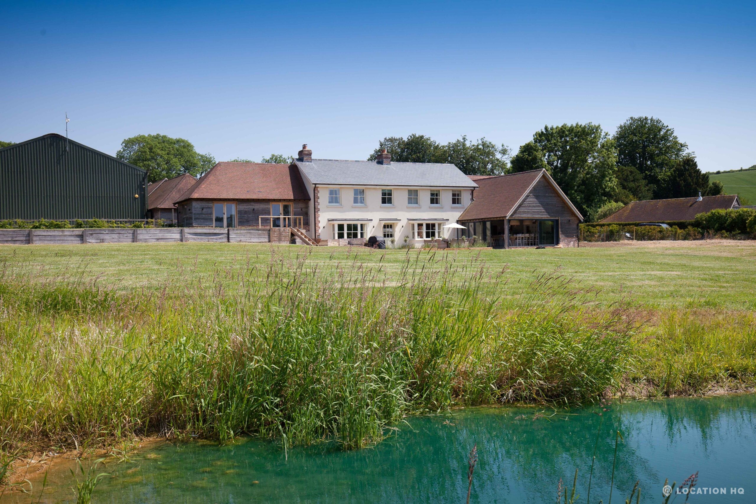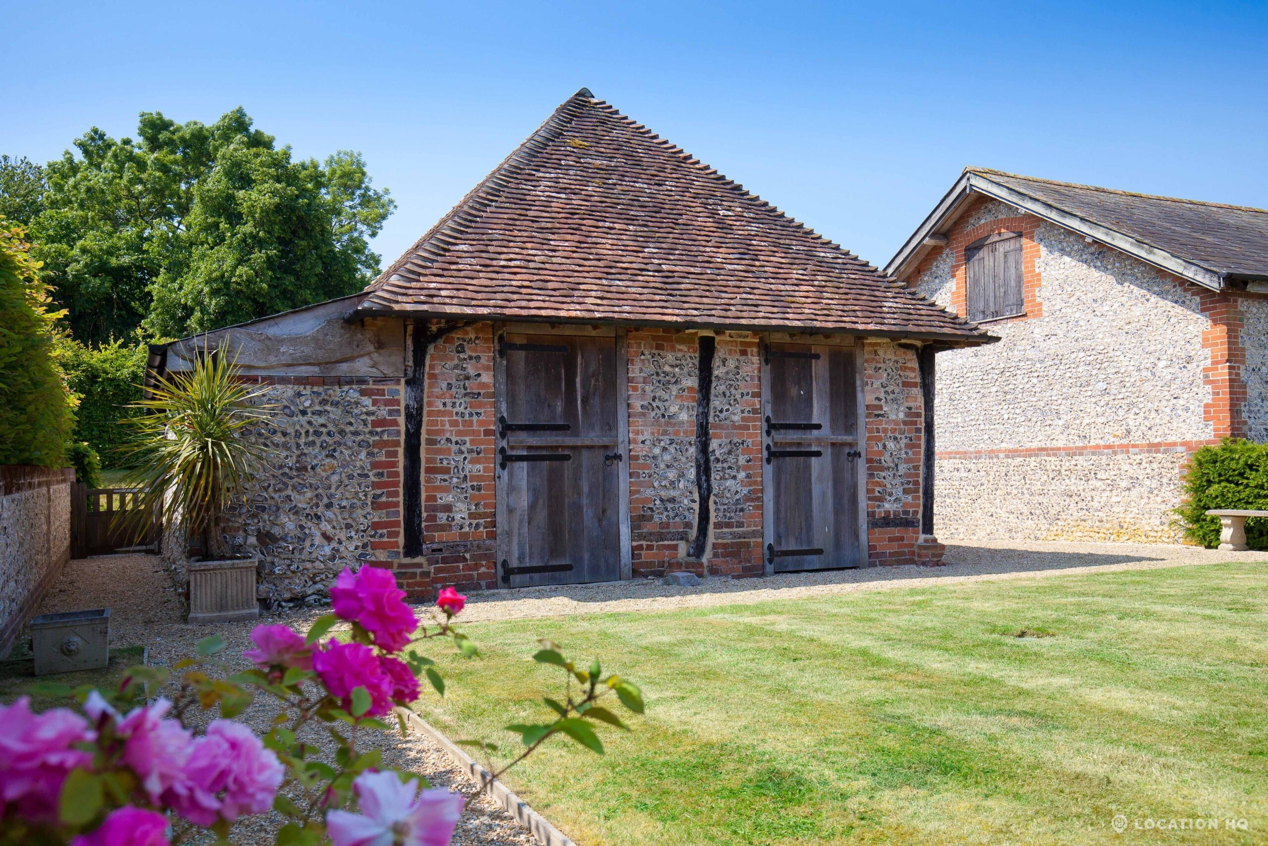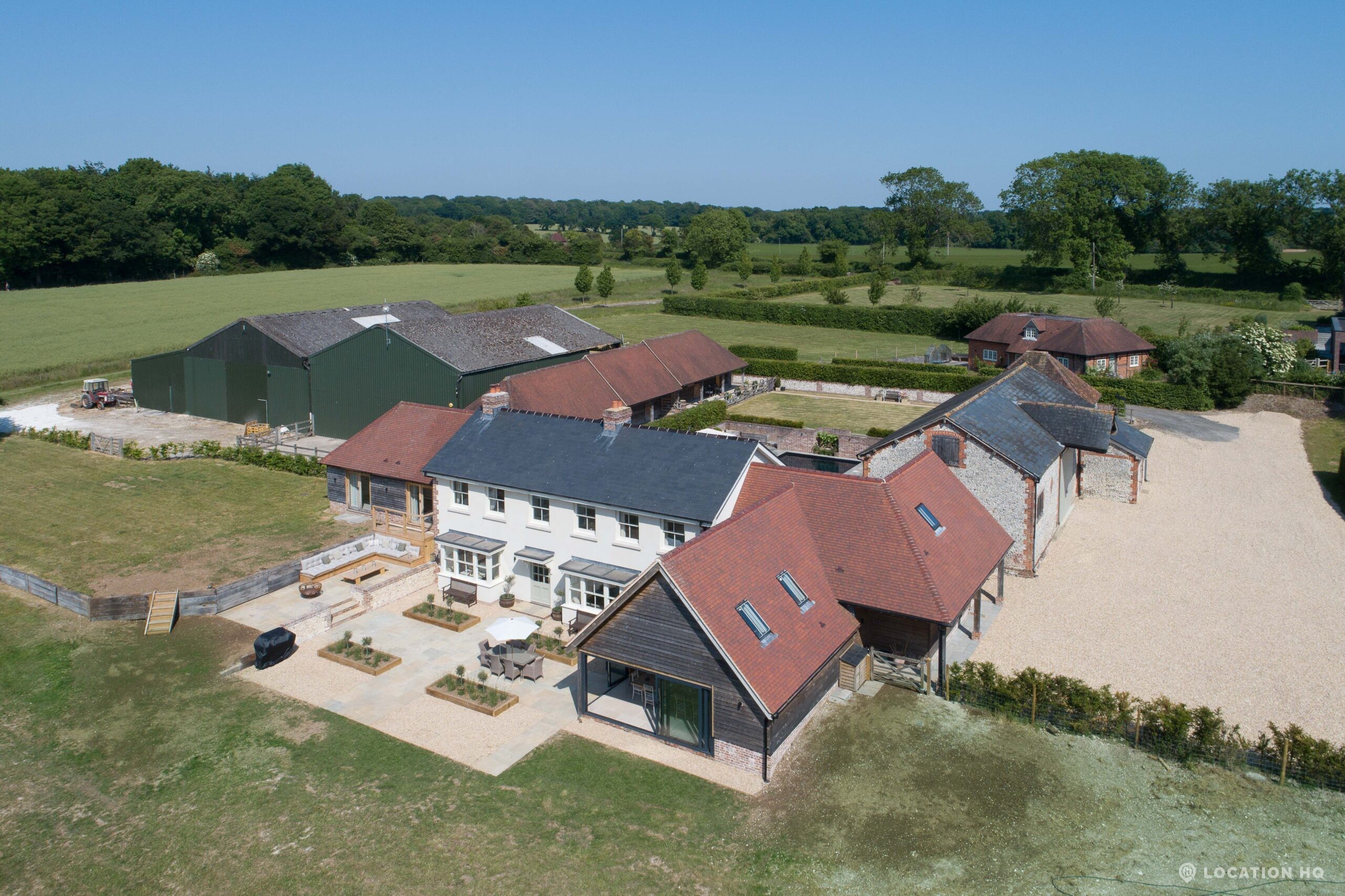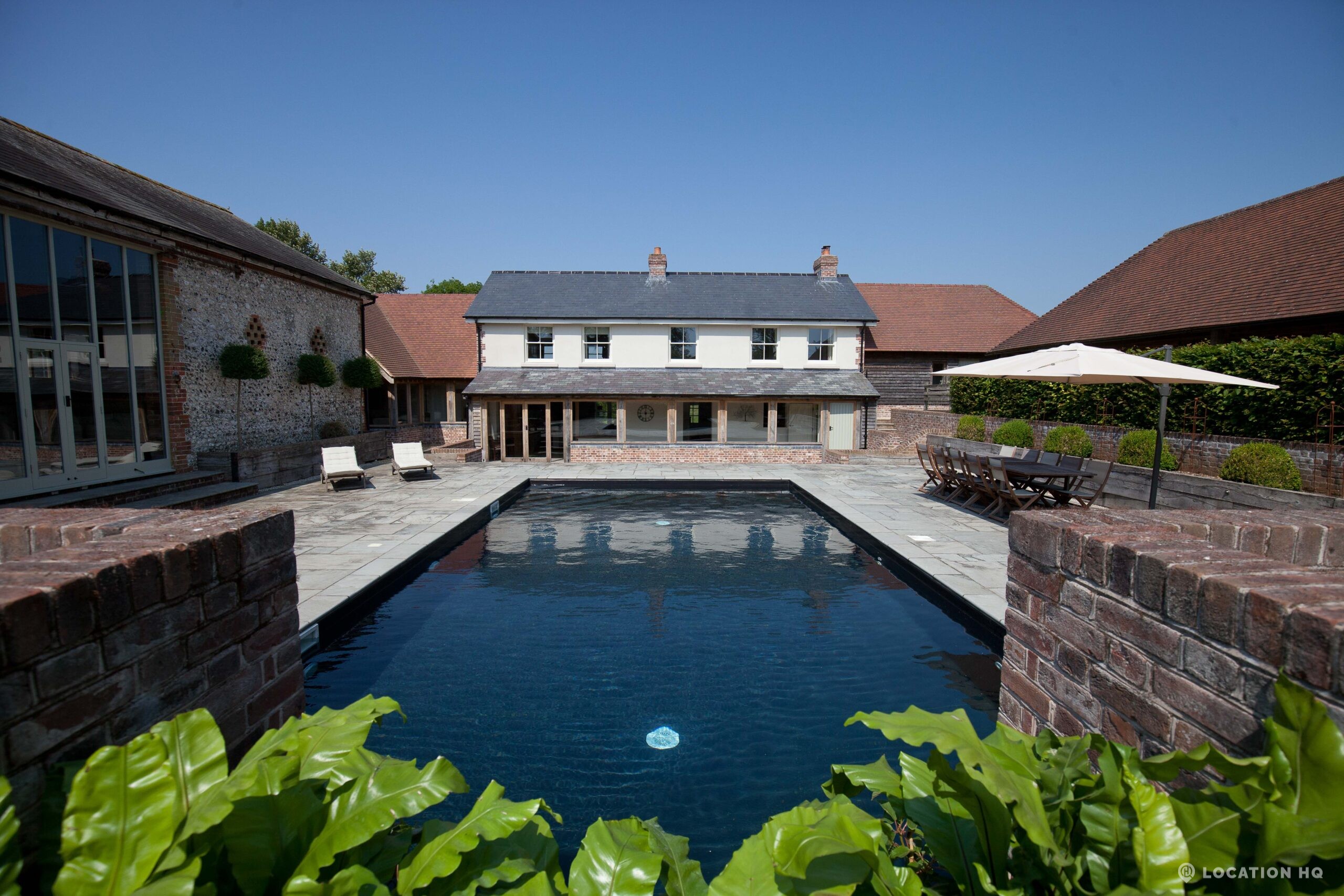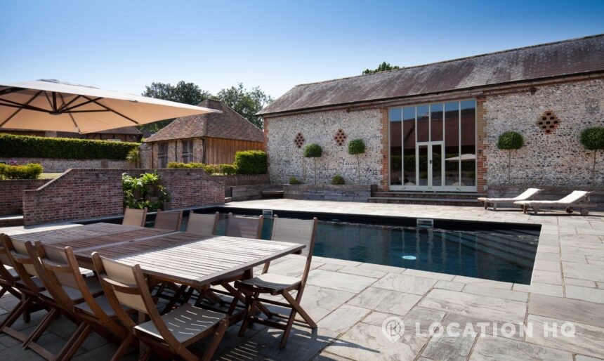 Detached family house set within 7 acres of beautifully landscaped grounds, offering a relaxed countryside feel across a generous collection of buildings. The courtyard swimming pool is particularly special. The main house includes spacious open-plan living areas, an entertainment barn, five bedrooms, and multiple practical rooms for easy movement and setups. Dairy Cottage adds further accommodation, while a stable block and large modern storage barn bring extra versatility. With gardens, paddocks, a wildlife pond, and an outdoor pool, it’s a great fit for scenes needing a calm rural family setting. Hardstanding unitbase on site for an easy day.