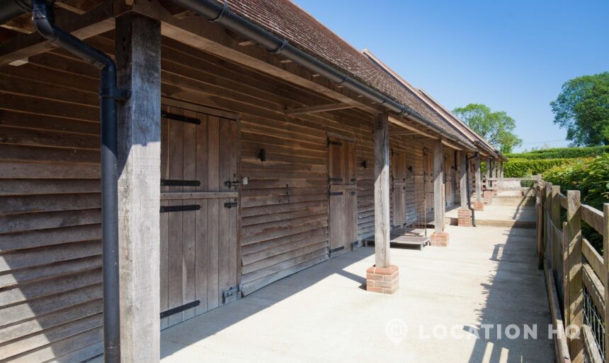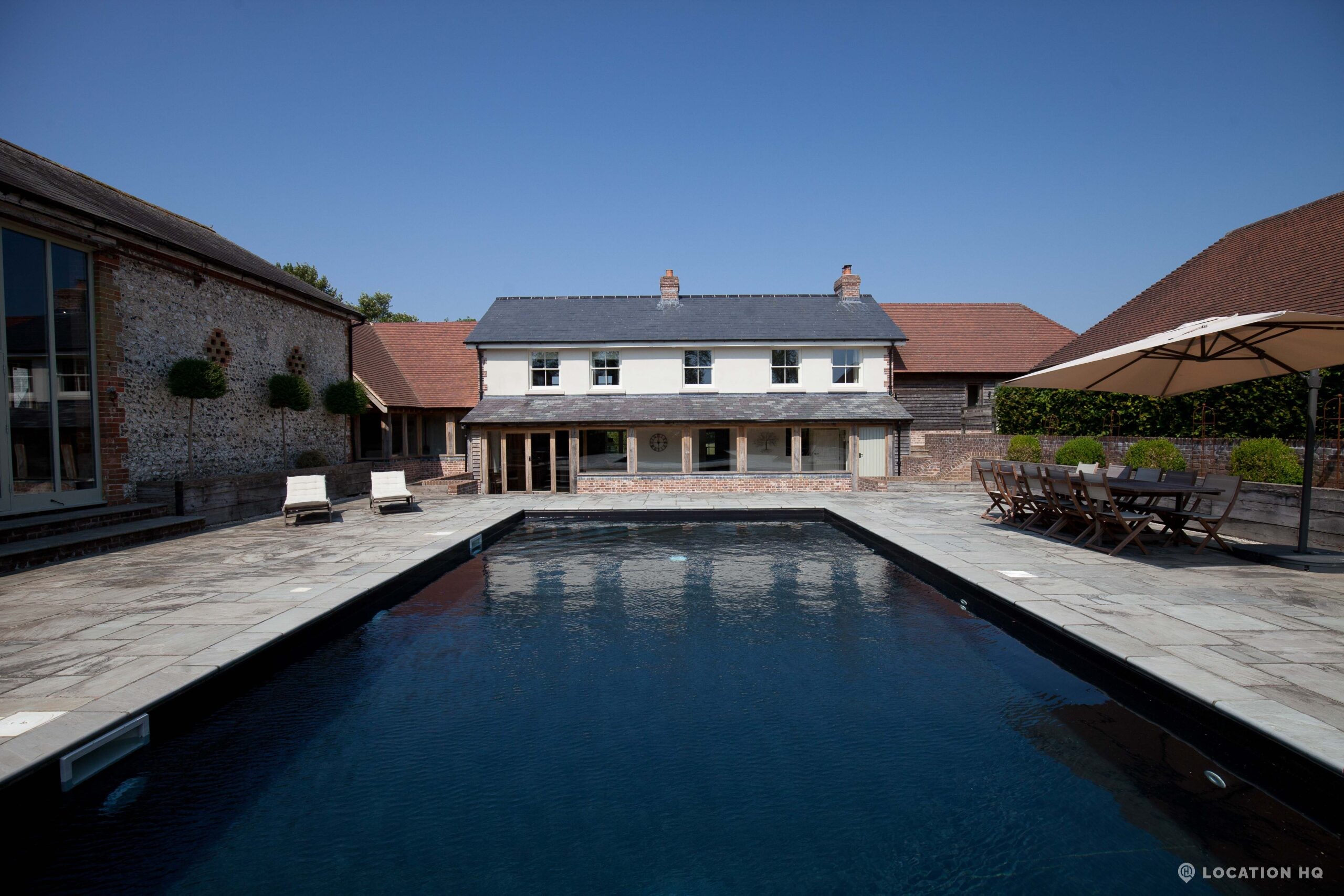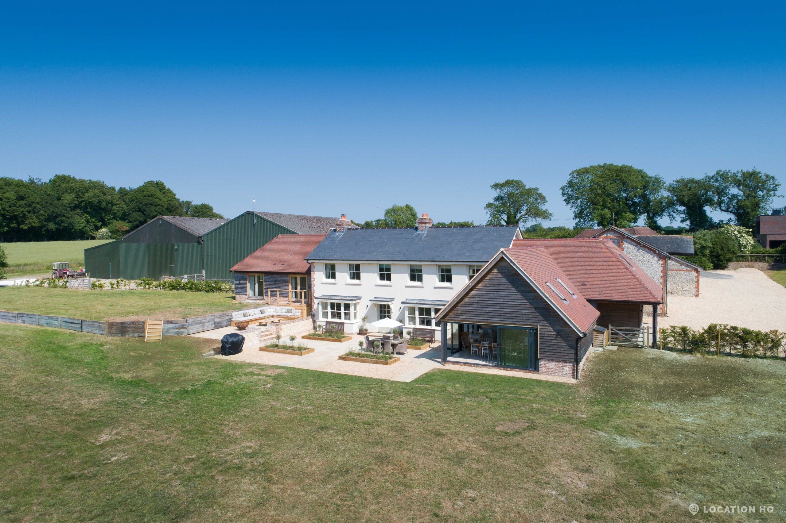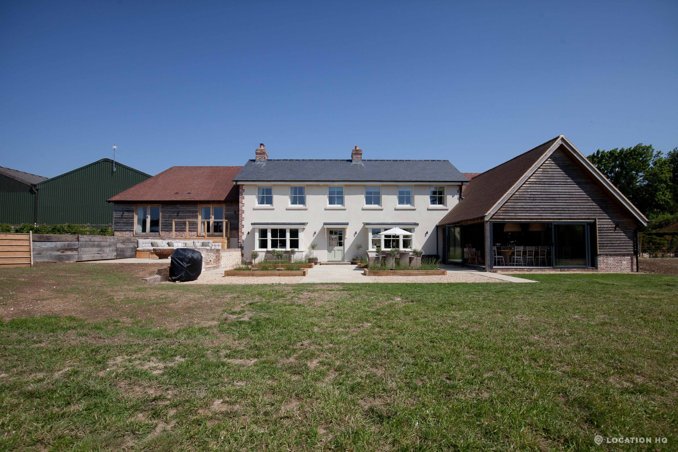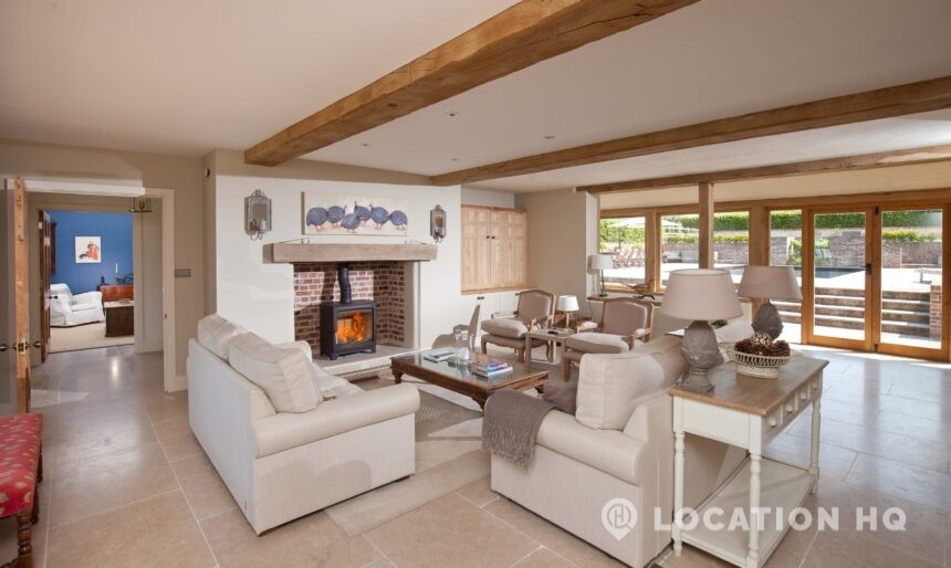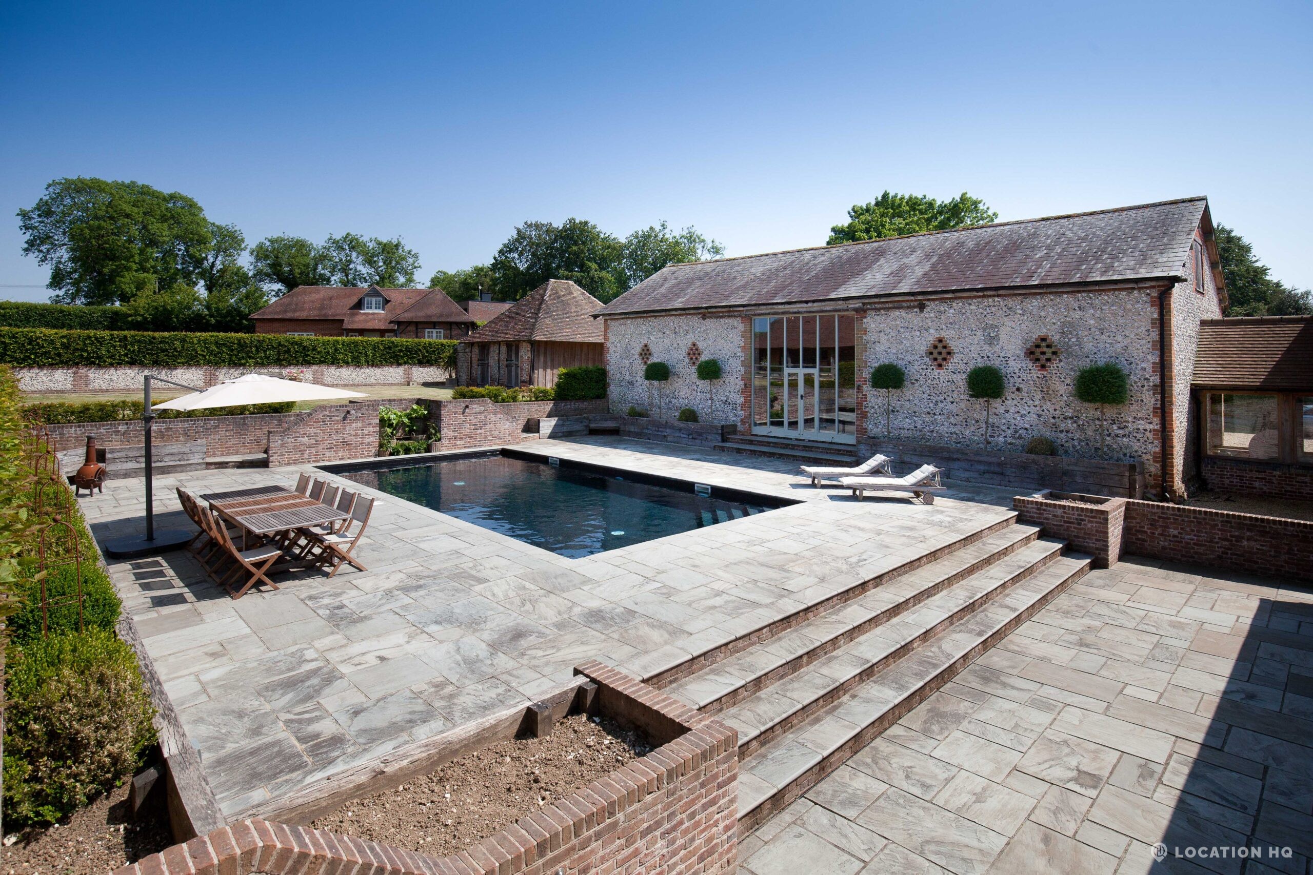 Detached family house set within 7 acres of beautifully landscaped grounds, offering a relaxed countryside feel across a generous collection of buildings. The courtyard swimming pool is particularly special. The main house includes spacious open-plan living areas, an entertainment barn, five bedrooms, and multiple practical rooms for easy movement and setups. Dairy Cottage adds further accommodation, while a stable block and large modern storage barn bring extra versatility. With gardens, paddocks, a wildlife pond, and an outdoor pool, it’s a great fit for scenes needing a calm rural family setting. Hardstanding unitbase on site for an easy day.
