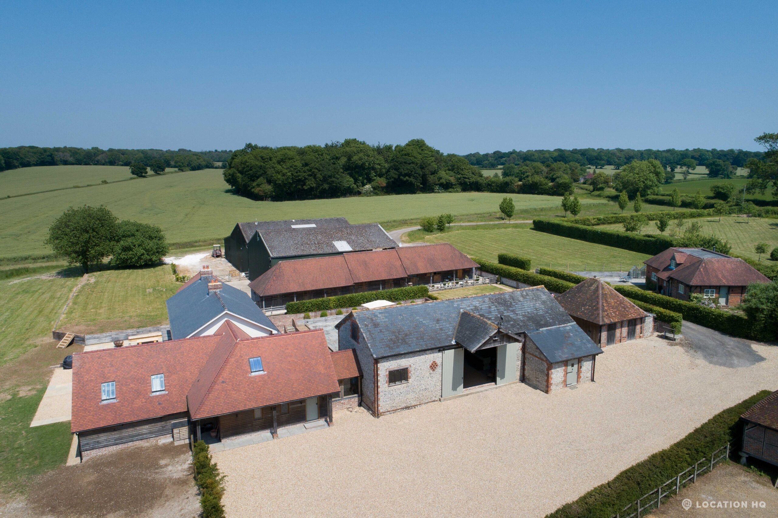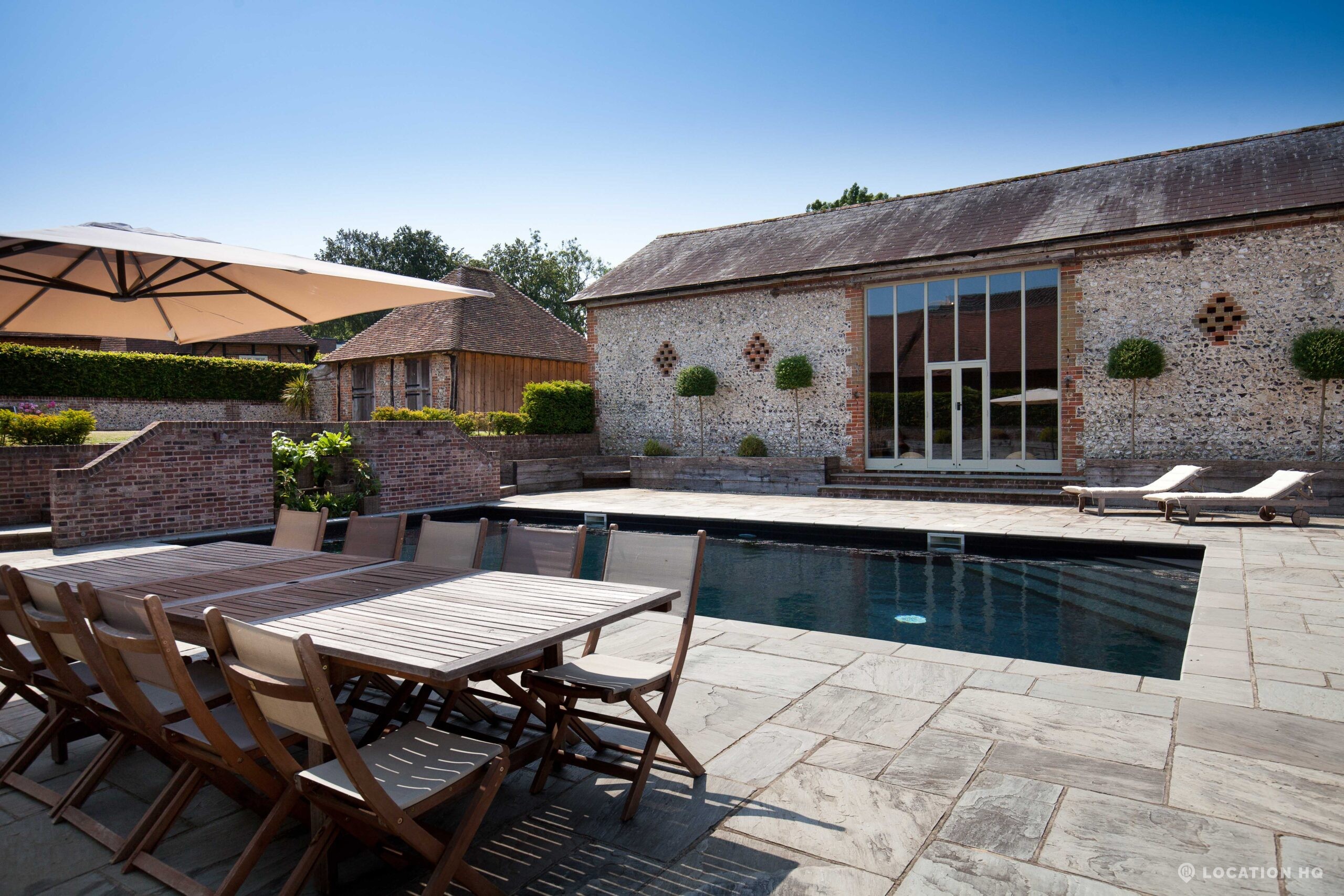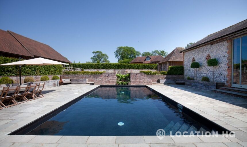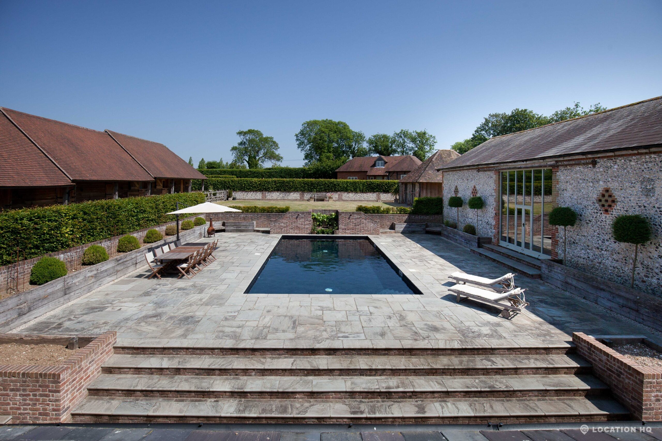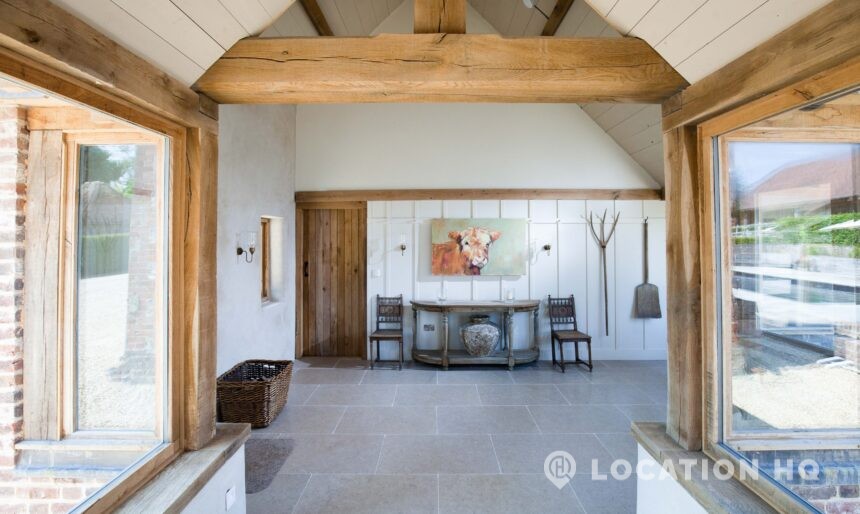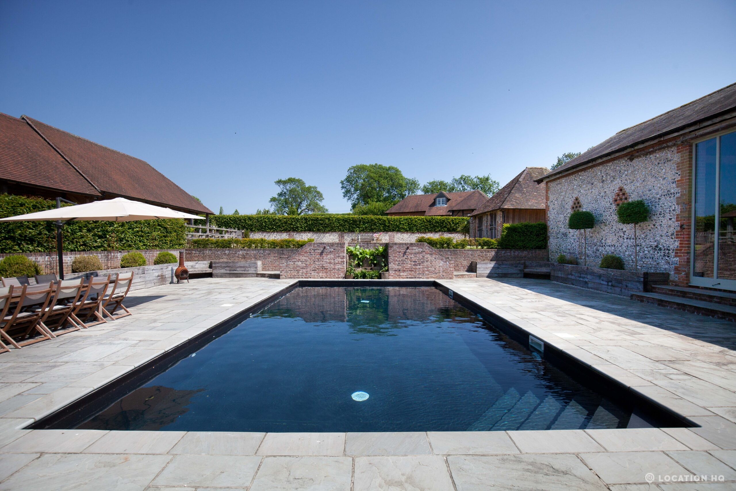 Detached family house set within 7 acres of beautifully landscaped grounds, offering a relaxed countryside feel across a generous collection of buildings. The courtyard swimming pool is particularly special. The main house includes spacious open-plan living areas, an entertainment barn, five bedrooms, and multiple practical rooms for easy movement and setups. Dairy Cottage adds further accommodation, while a stable block and large modern storage barn bring extra versatility. With gardens, paddocks, a wildlife pond, and an outdoor pool, it’s a great fit for scenes needing a calm rural family setting. Hardstanding unitbase on site for an easy day.