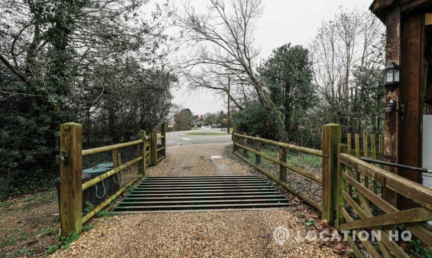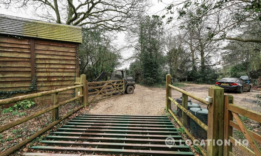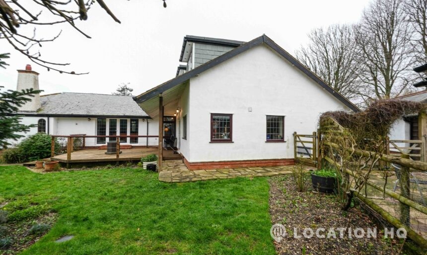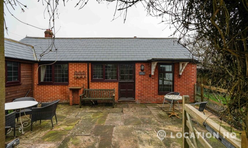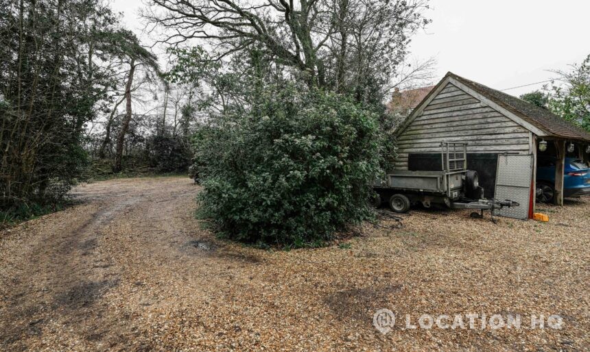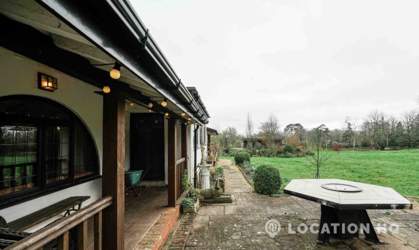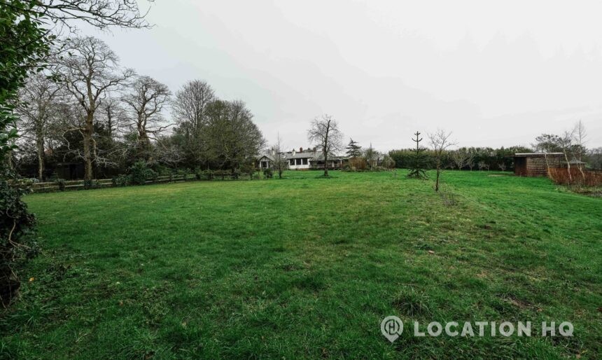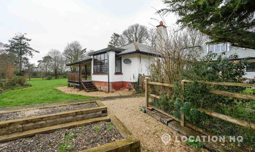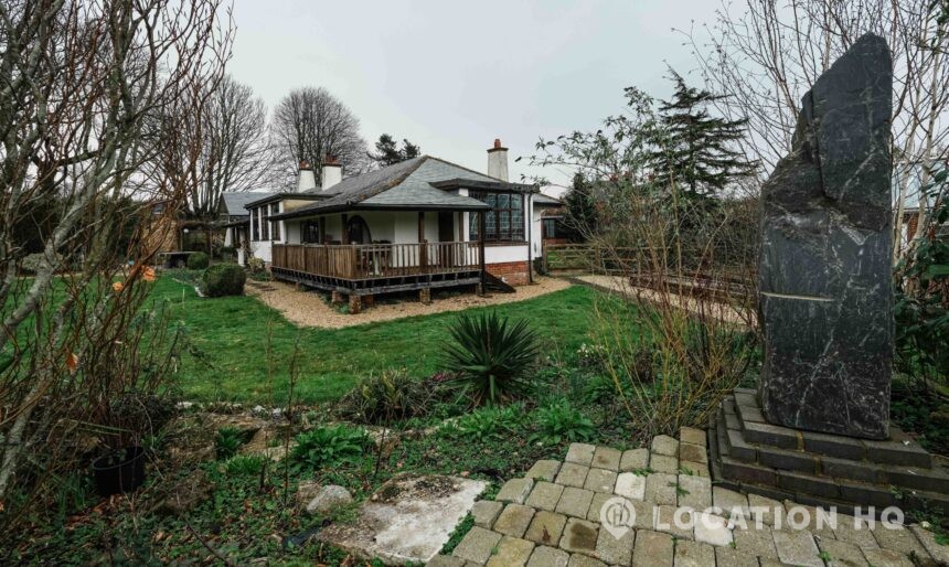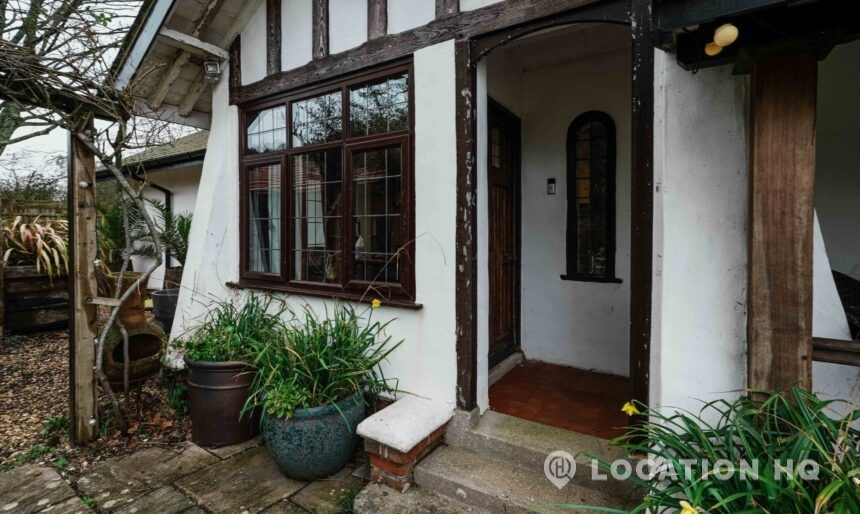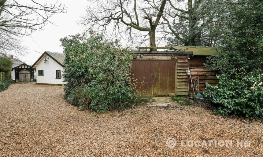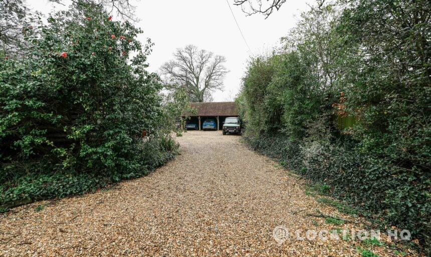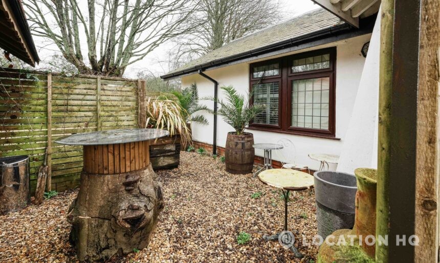 The detached bungalow offers a clear Arts and Crafts look, a separate cottage, outbuildings and 2 acres of space. Straightforward access and parking make it suitable for countryside-style filming needs.