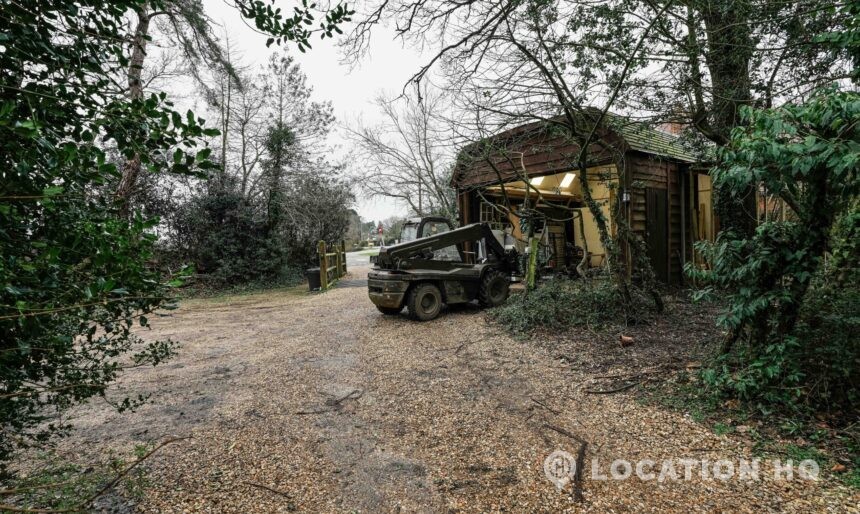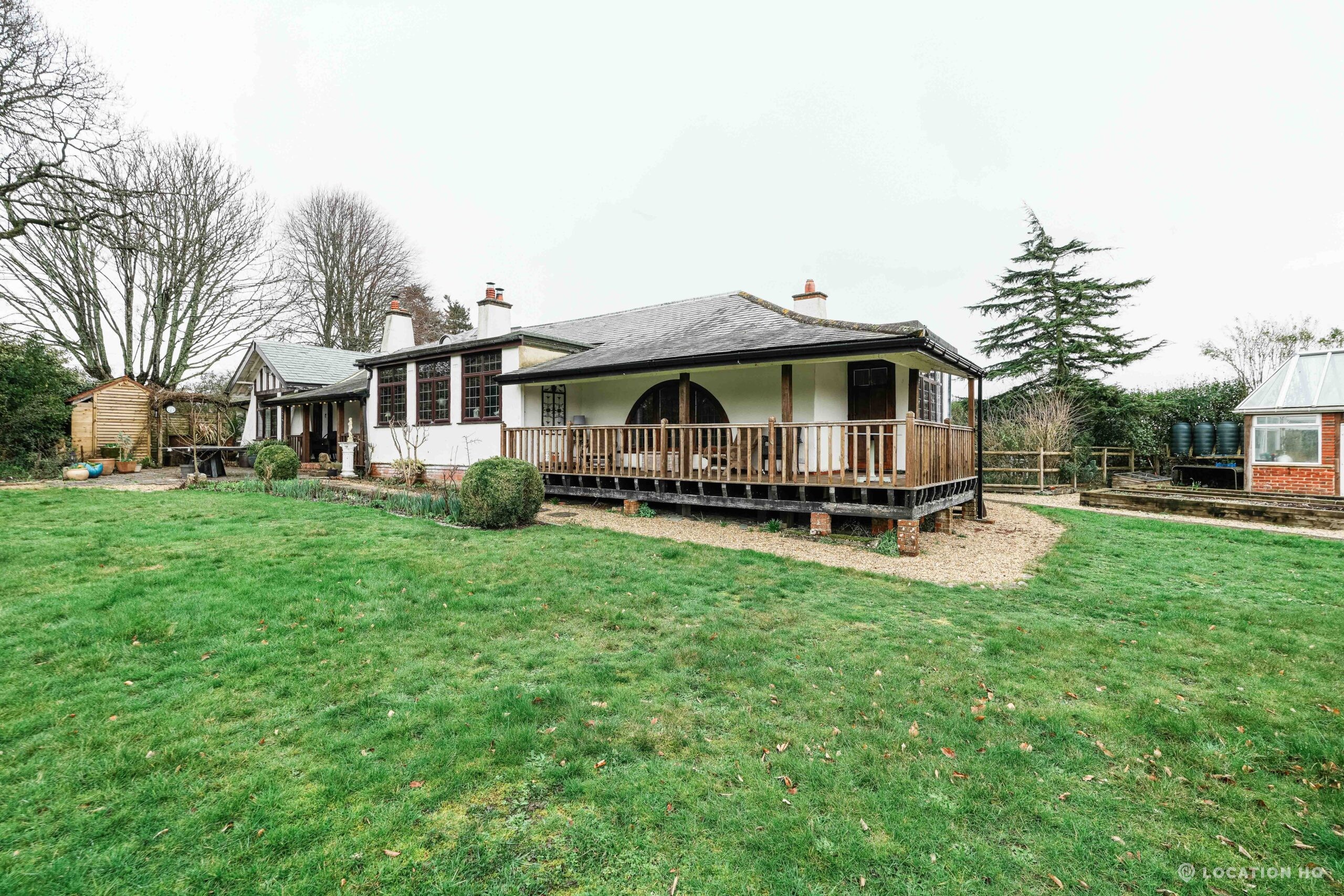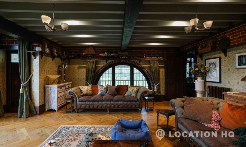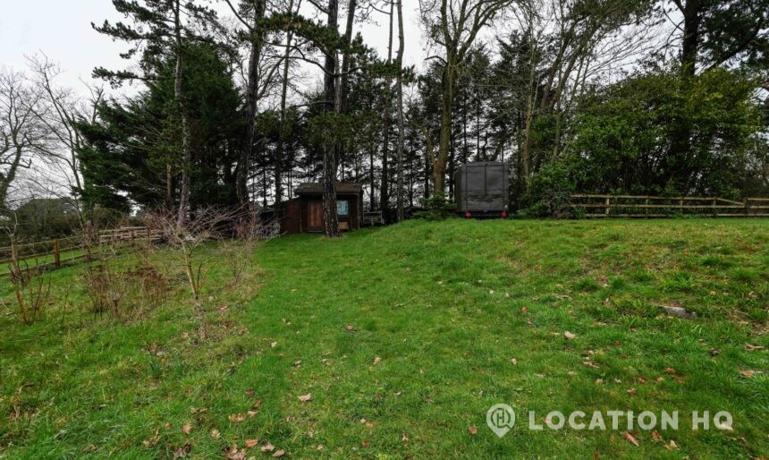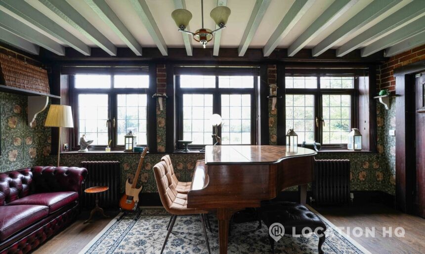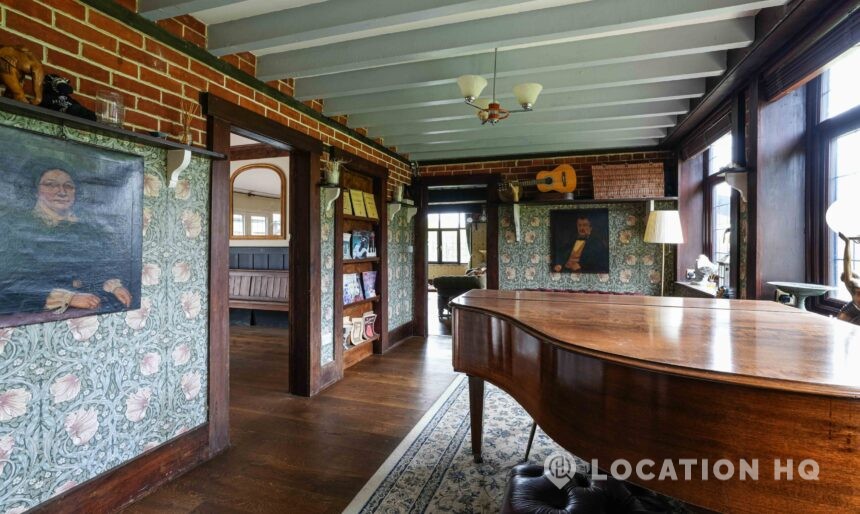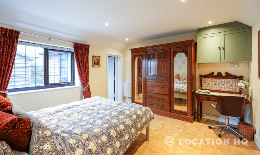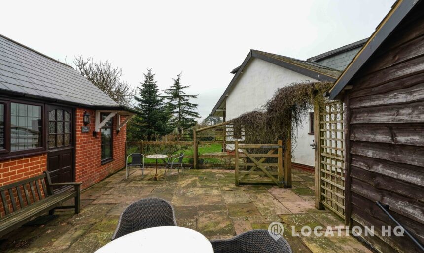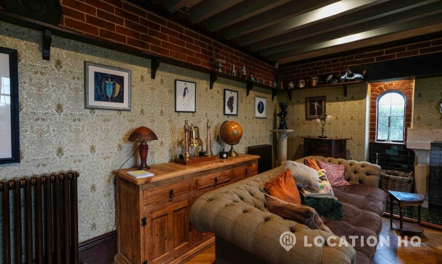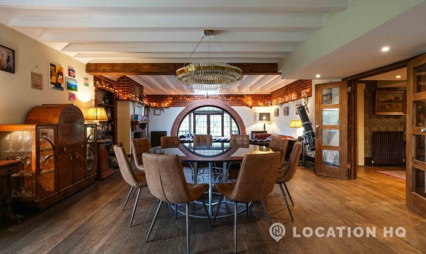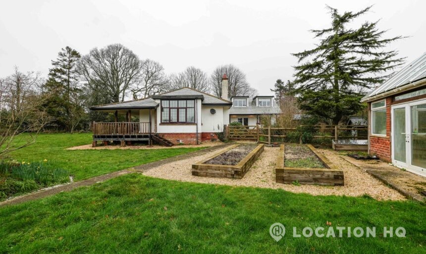The detached bungalow offers a clear Arts and Crafts look, a separate cottage, outbuildings and 2 acres of space. Straightforward access and parking make it suitable for countryside-style filming needs.