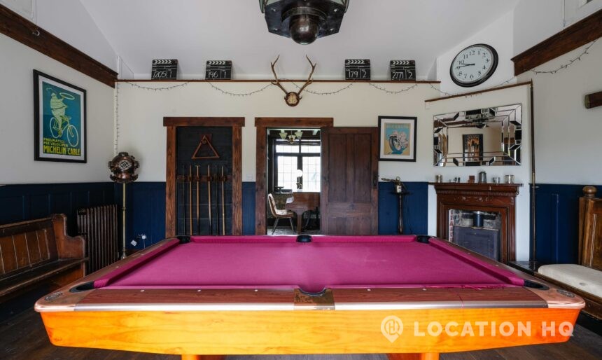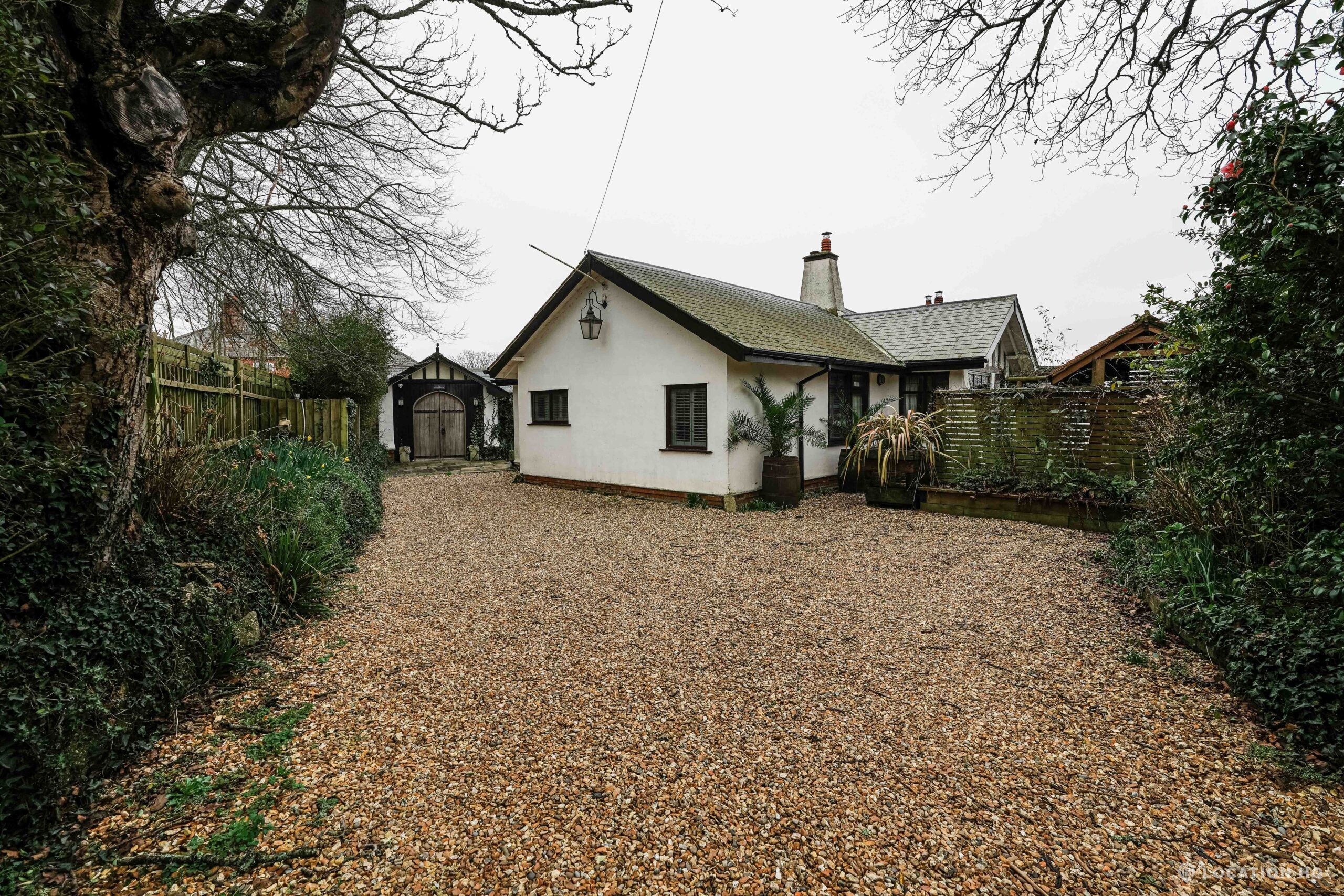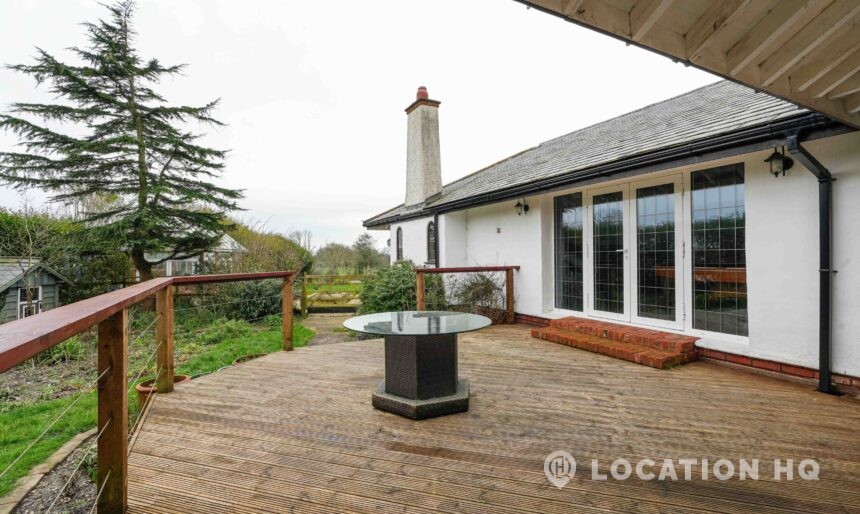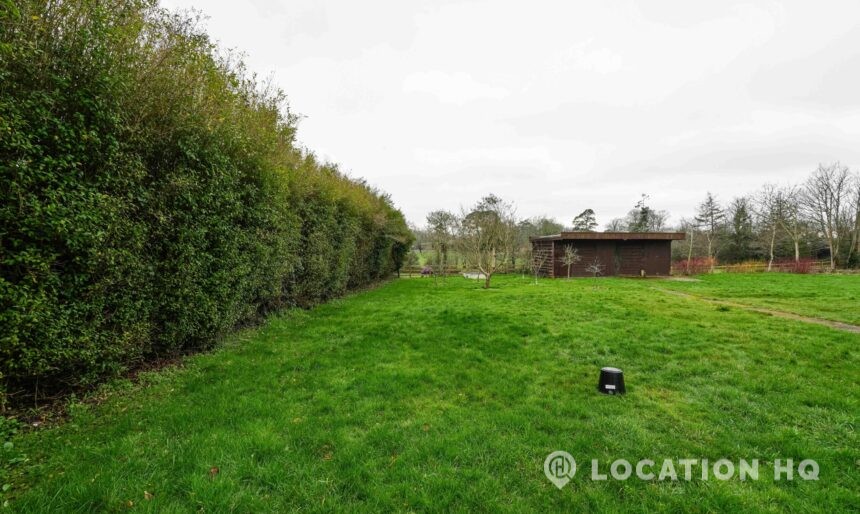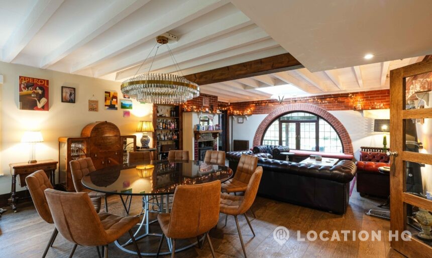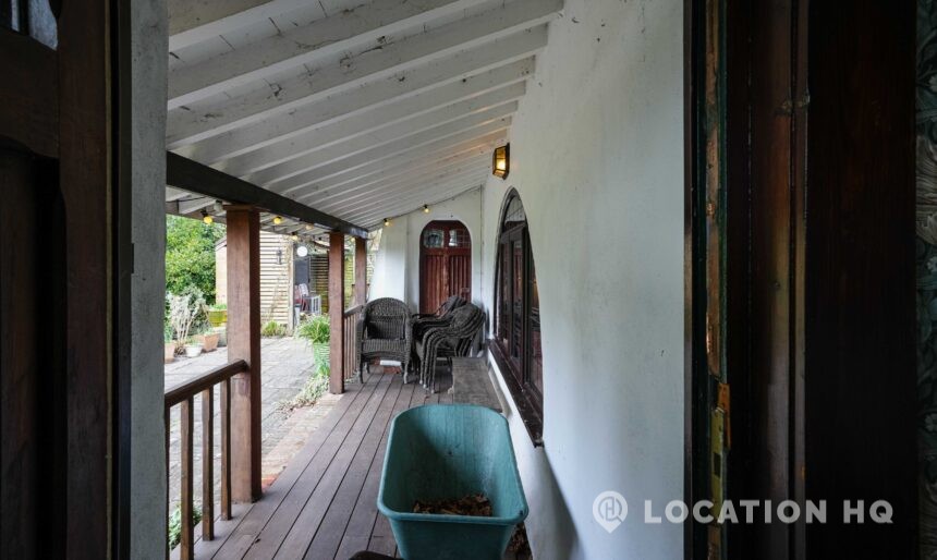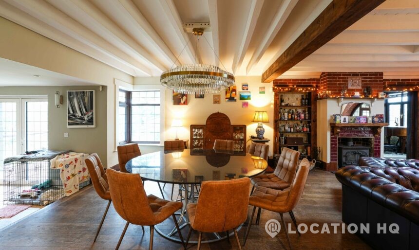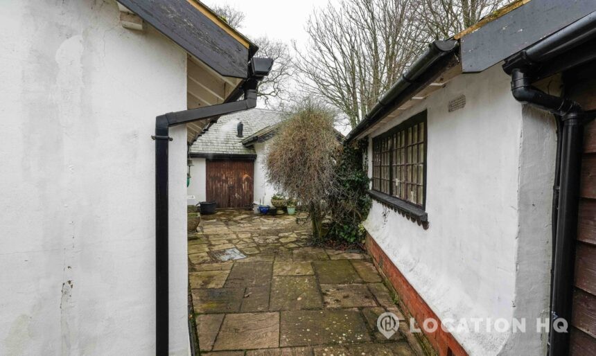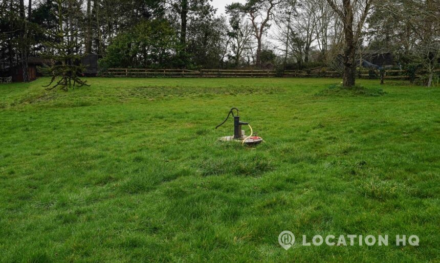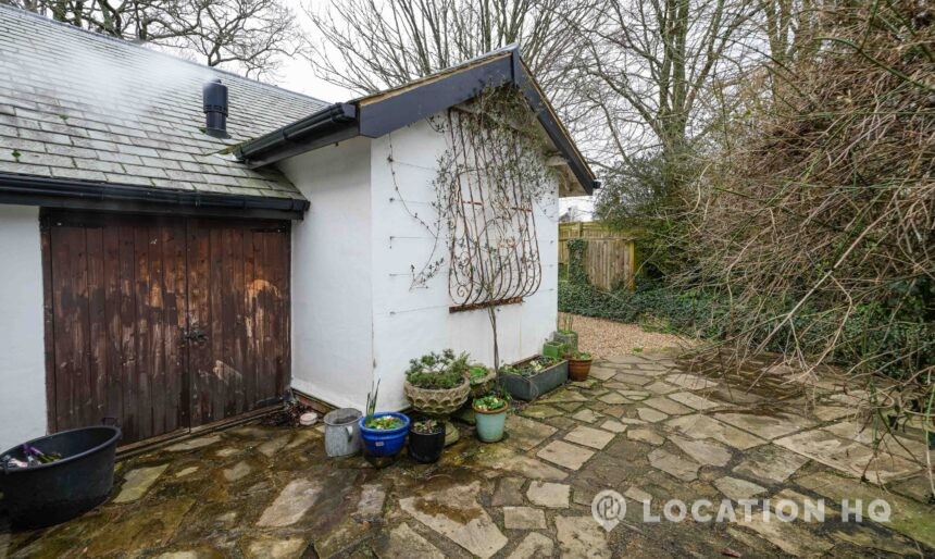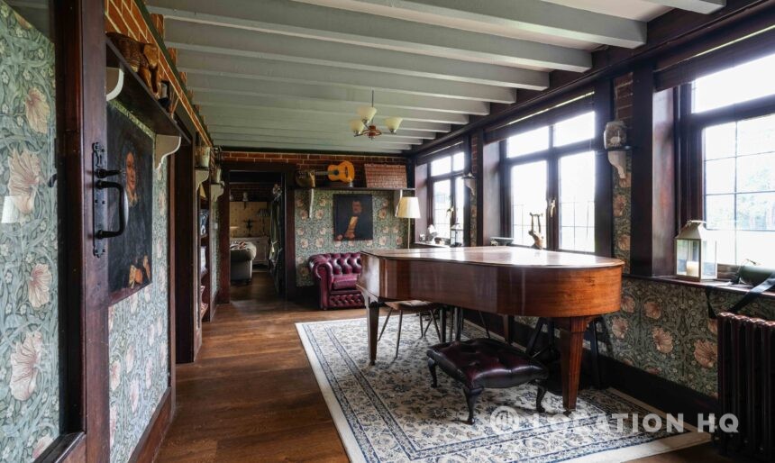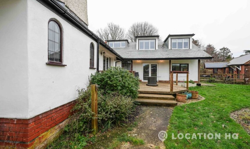 The detached bungalow offers a clear Arts and Crafts look, a separate cottage, outbuildings and 2 acres of space. Straightforward access and parking make it suitable for countryside-style filming needs.