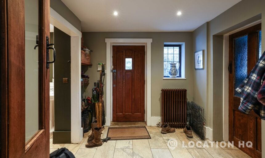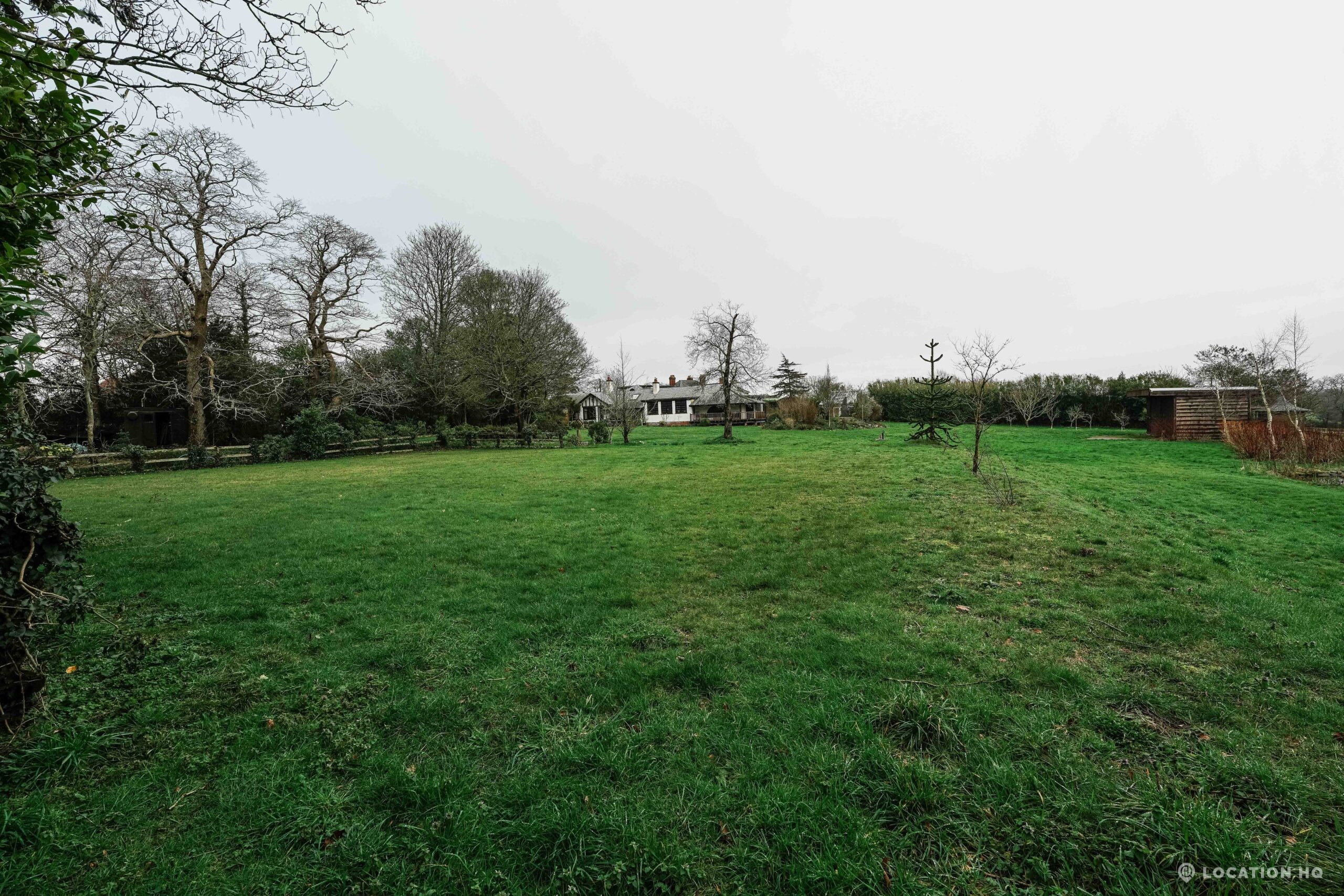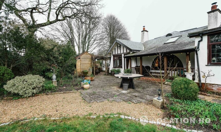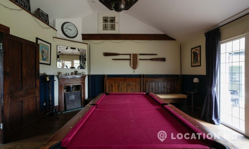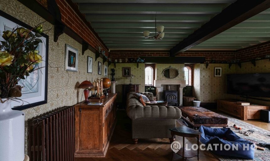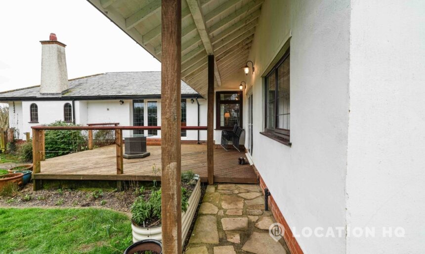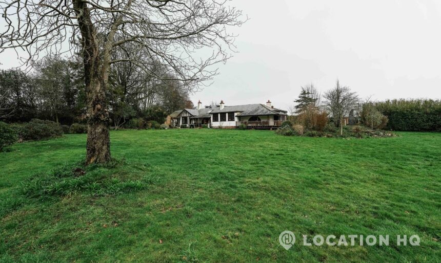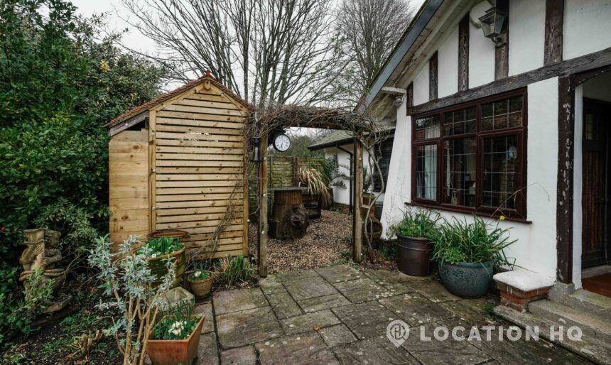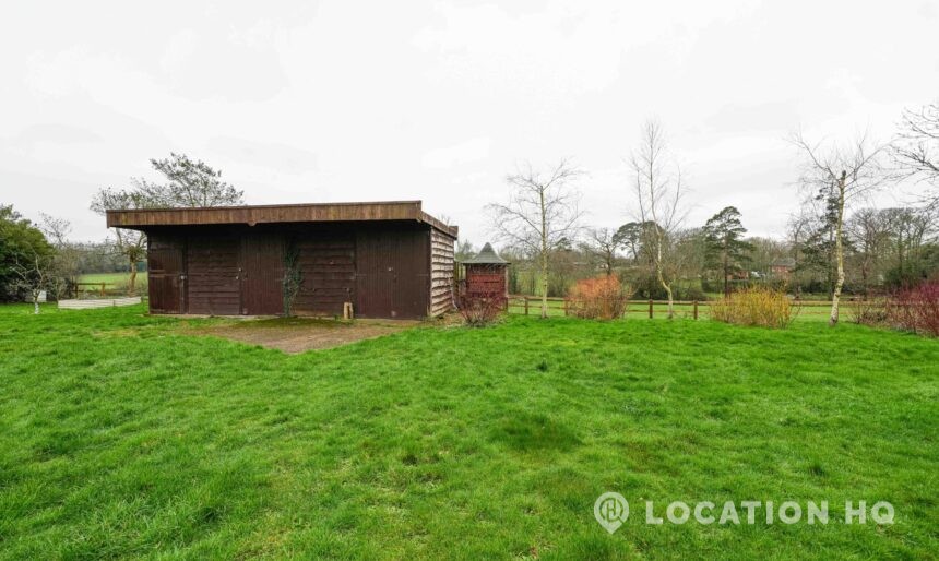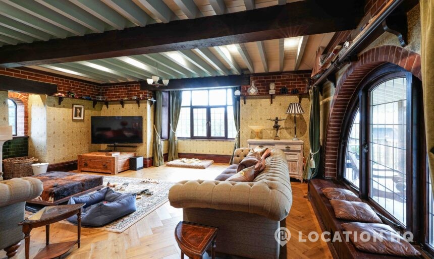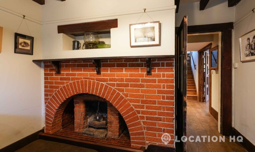 The detached bungalow offers a clear Arts and Crafts look, a separate cottage, outbuildings and 2 acres of space. Straightforward access and parking make it suitable for countryside-style filming needs.