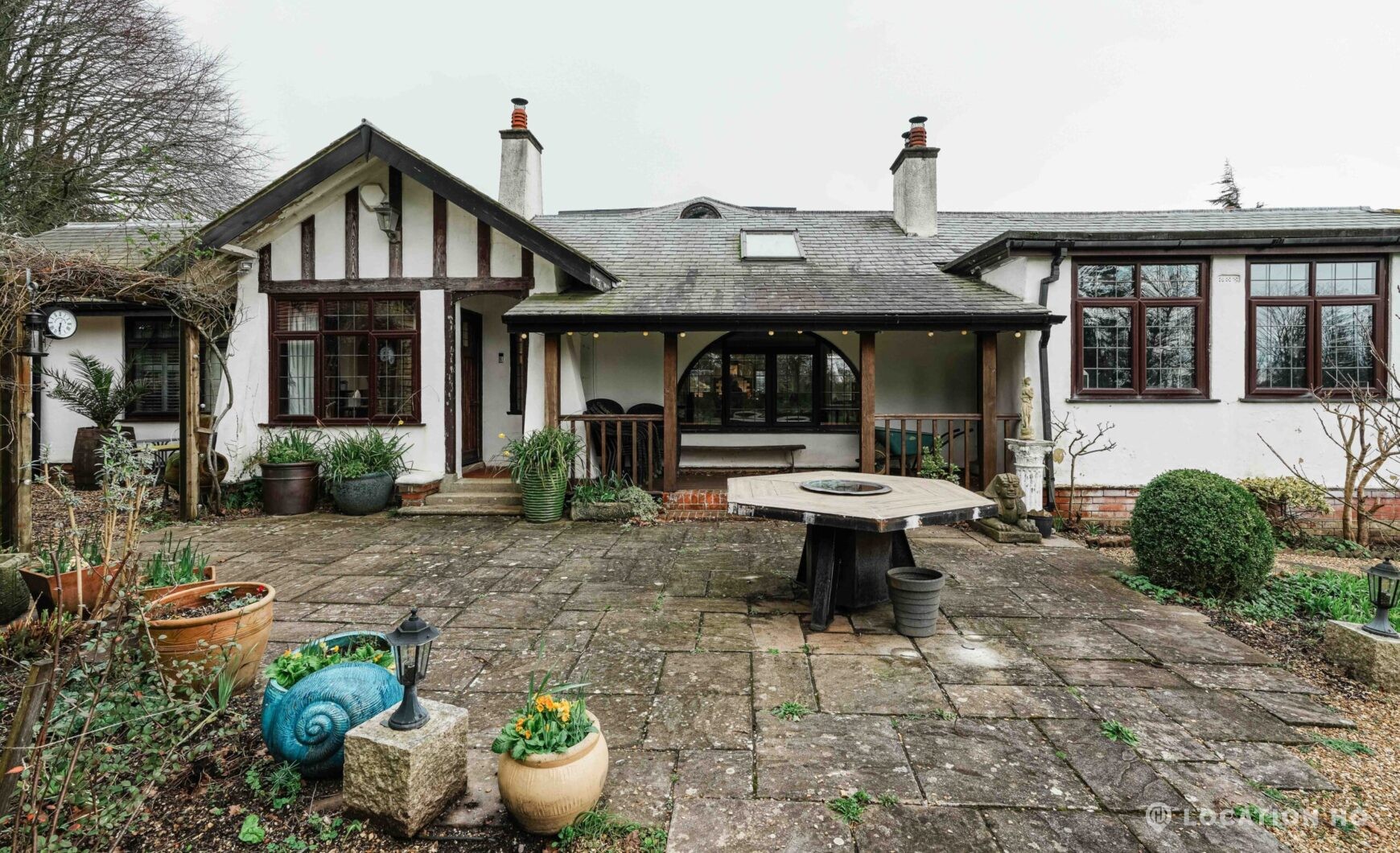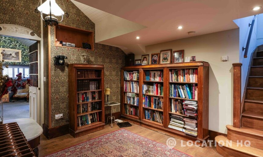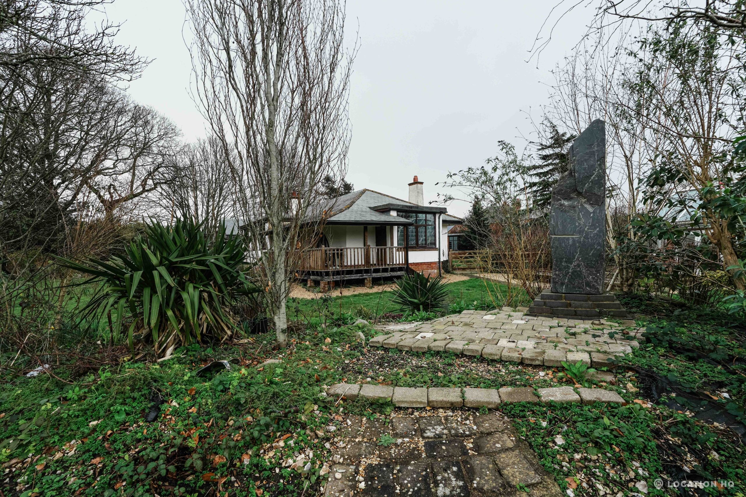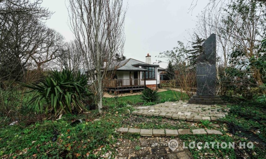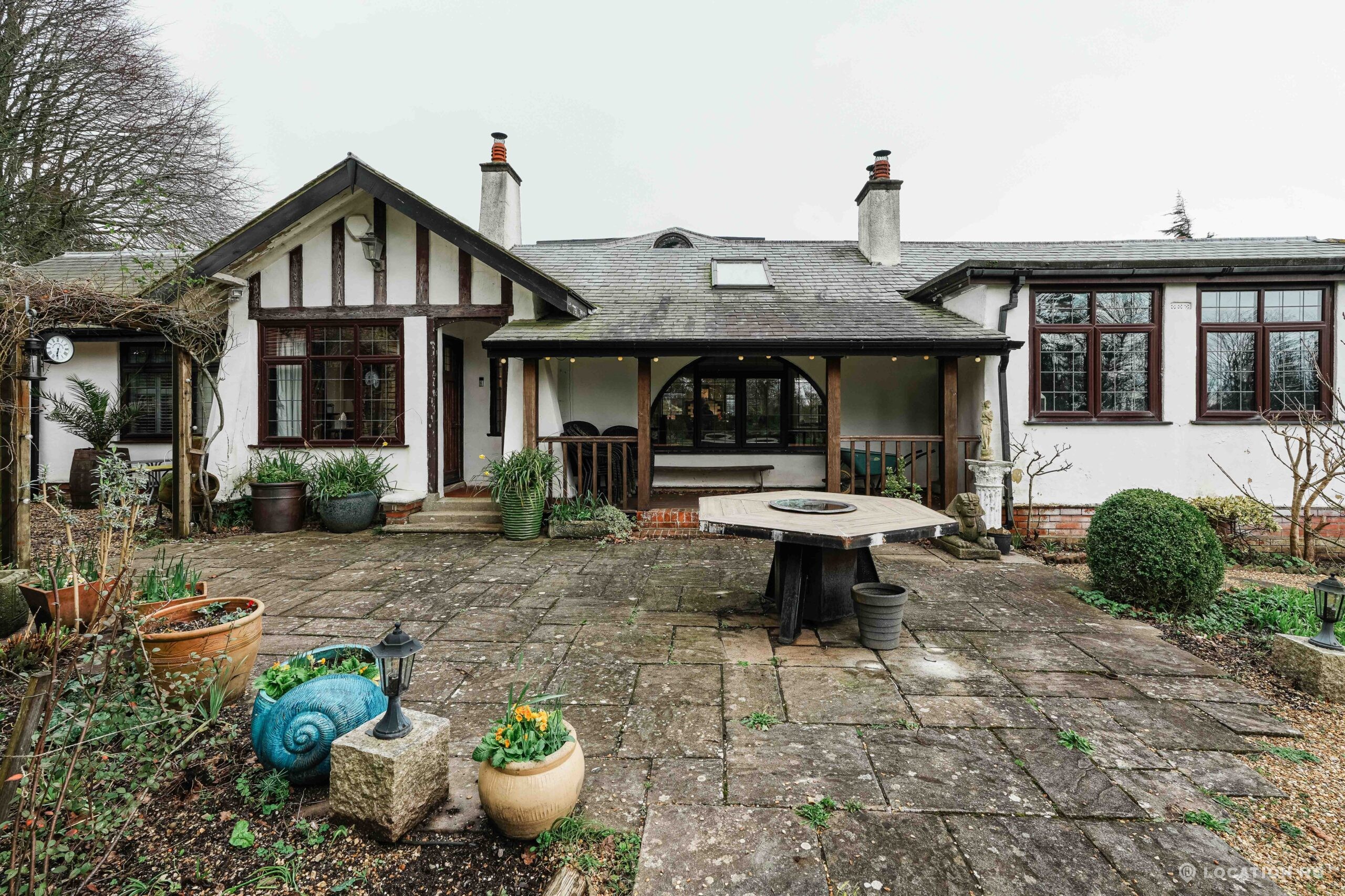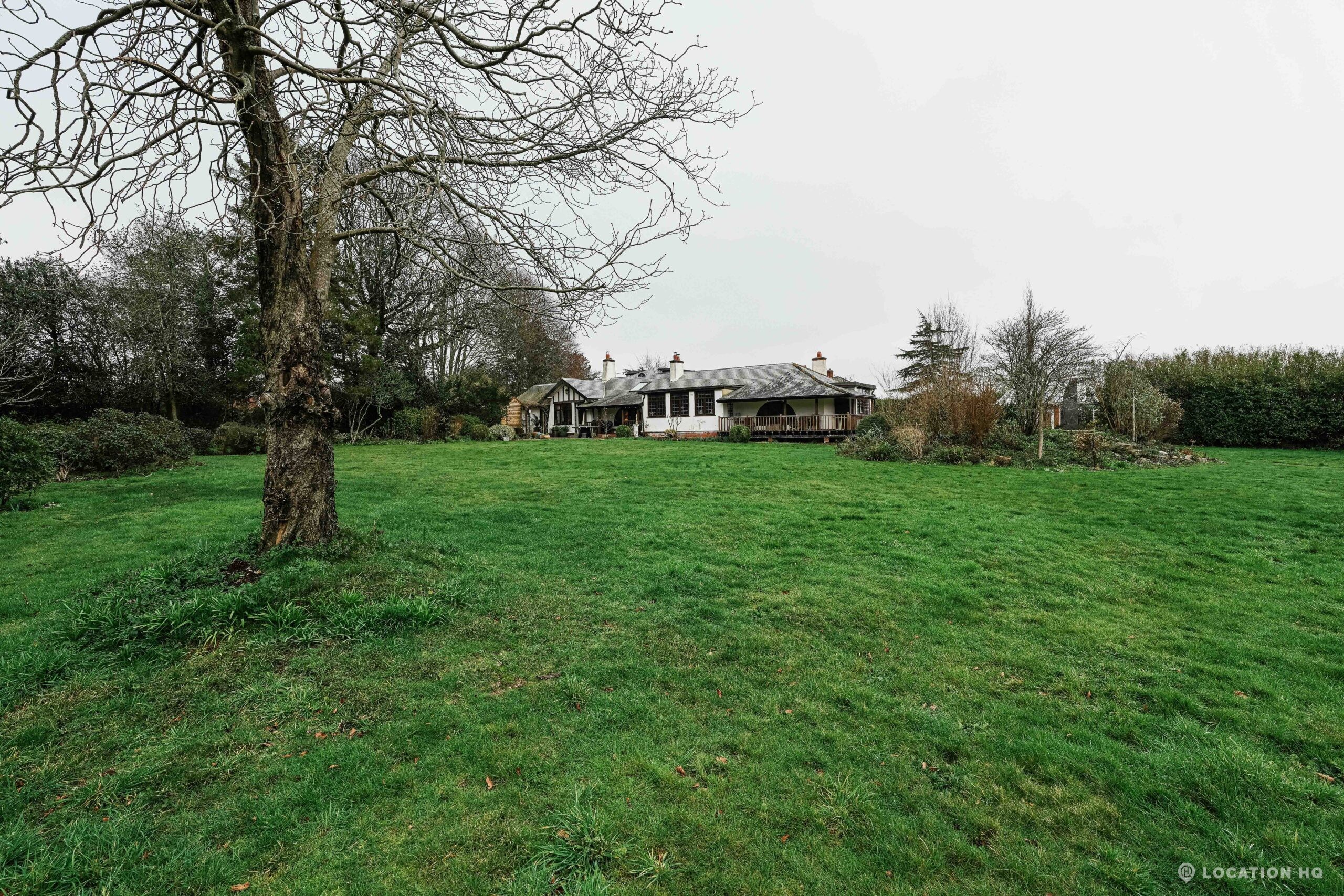 The detached bungalow offers a clear Arts and Crafts look, a separate cottage, outbuildings and 2 acres of space. Straightforward access and parking make it suitable for countryside-style filming needs.