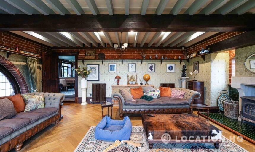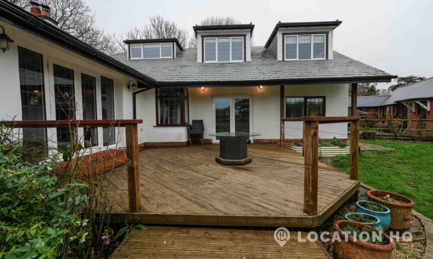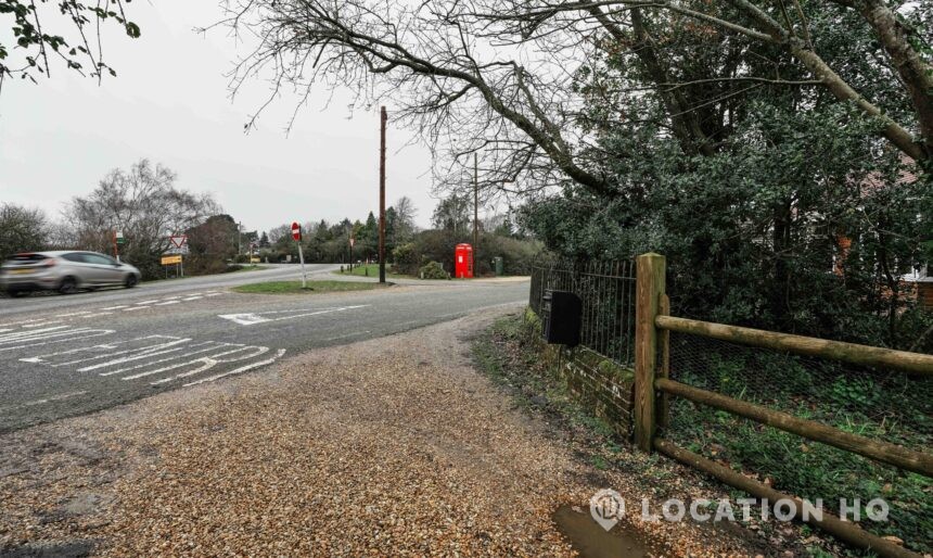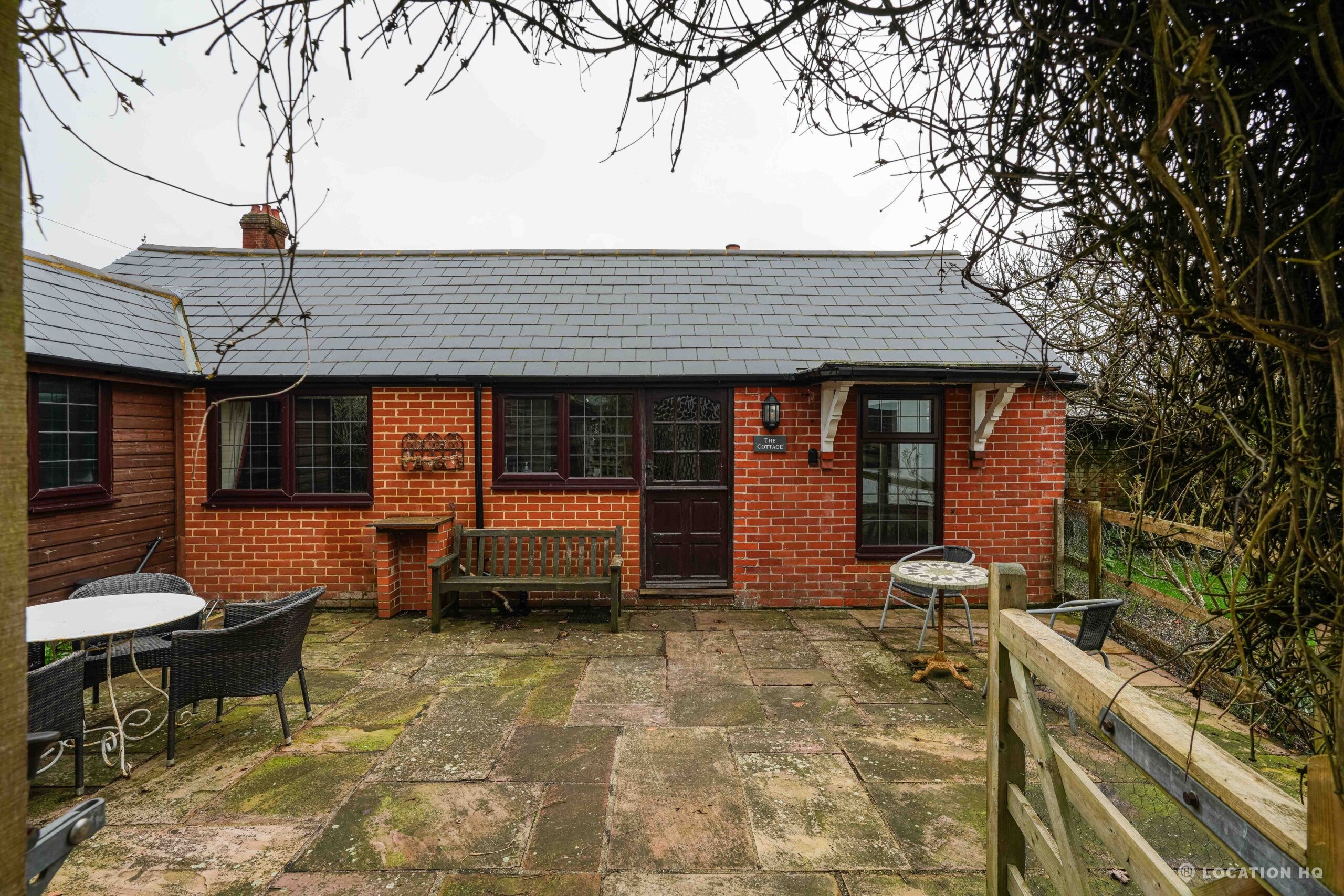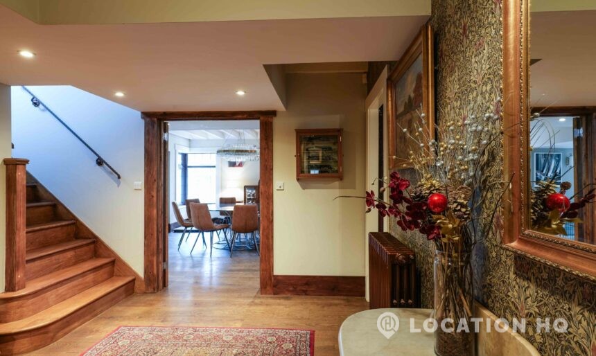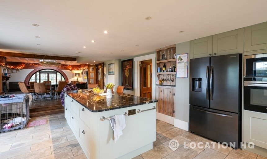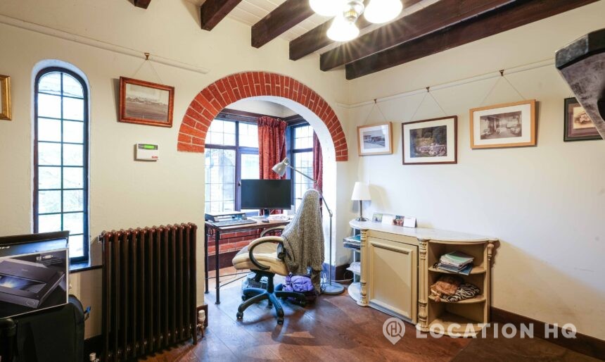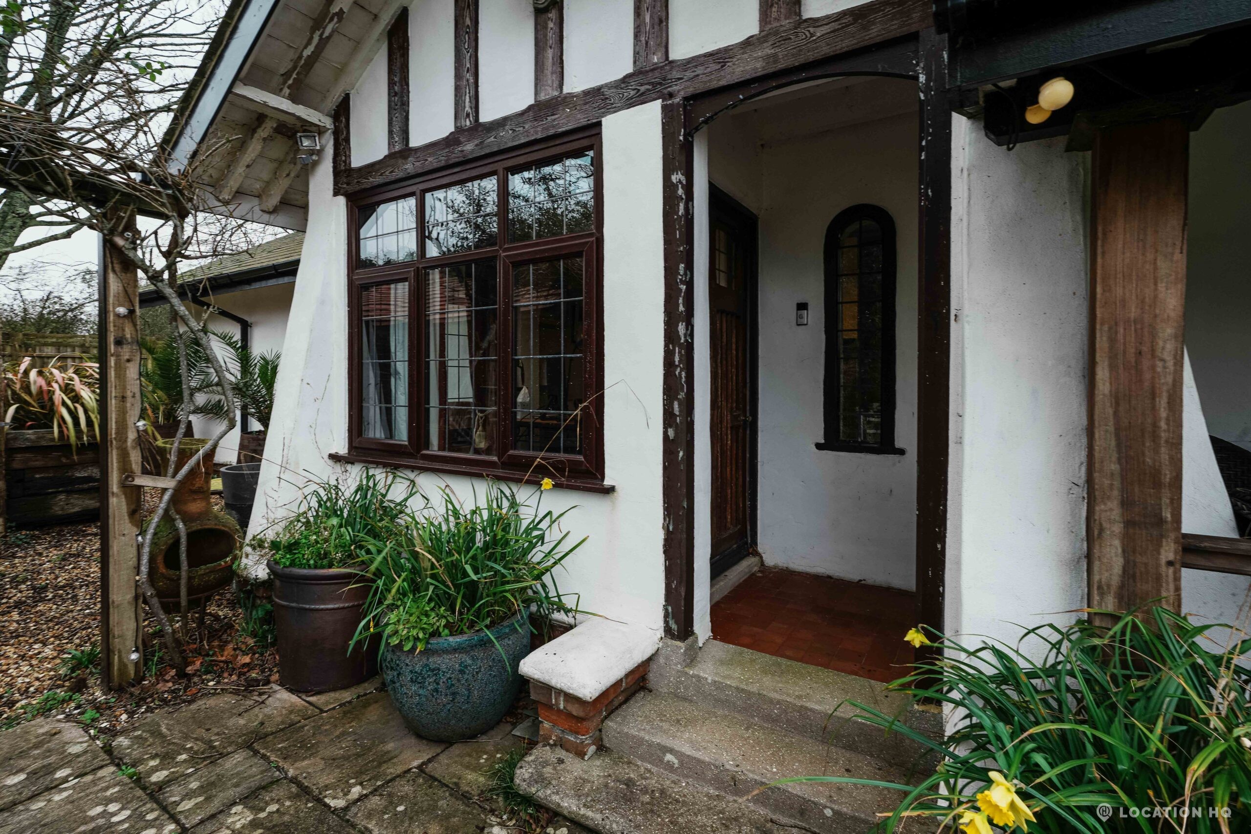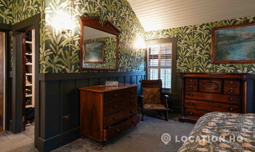 The detached bungalow offers a clear Arts and Crafts look, a separate cottage, outbuildings and 2 acres of space. Straightforward access and parking make it suitable for countryside-style filming needs.