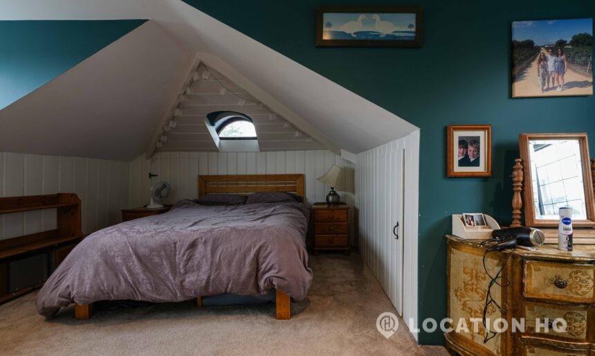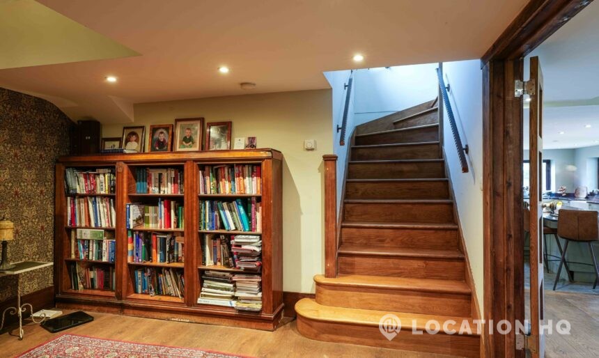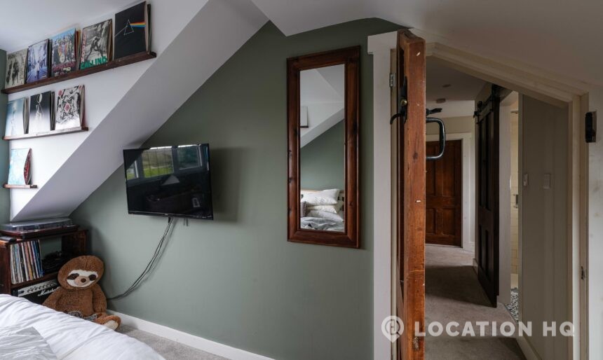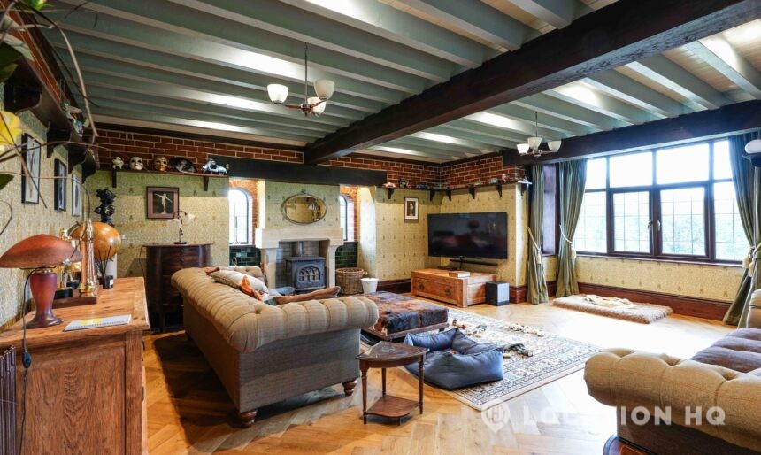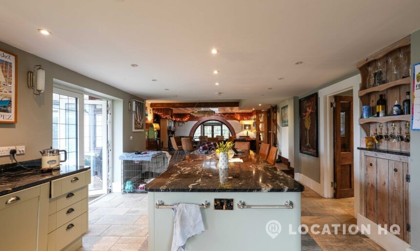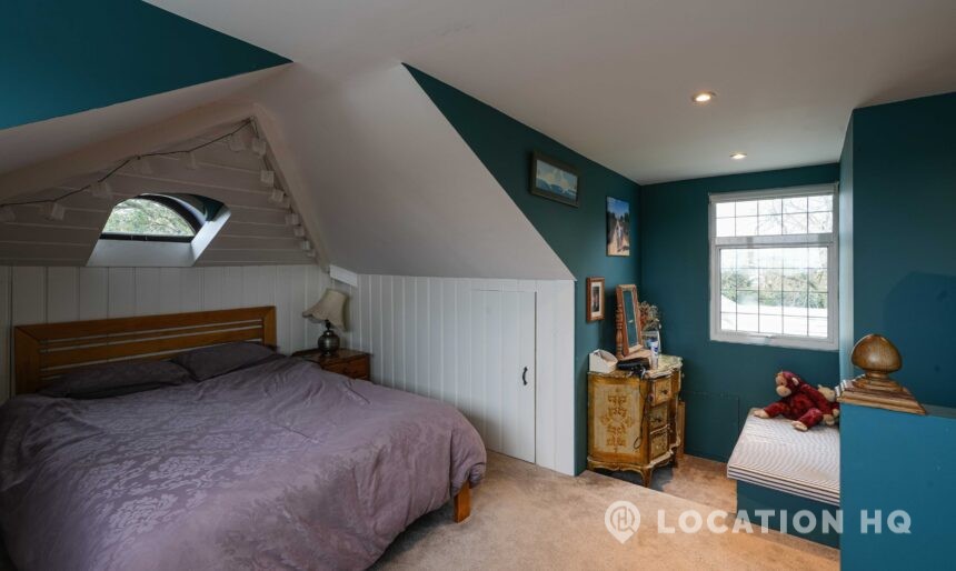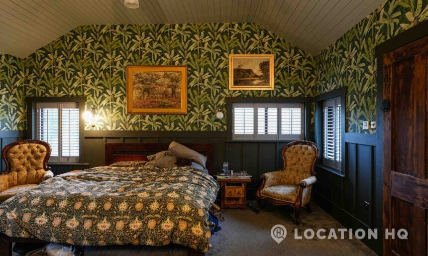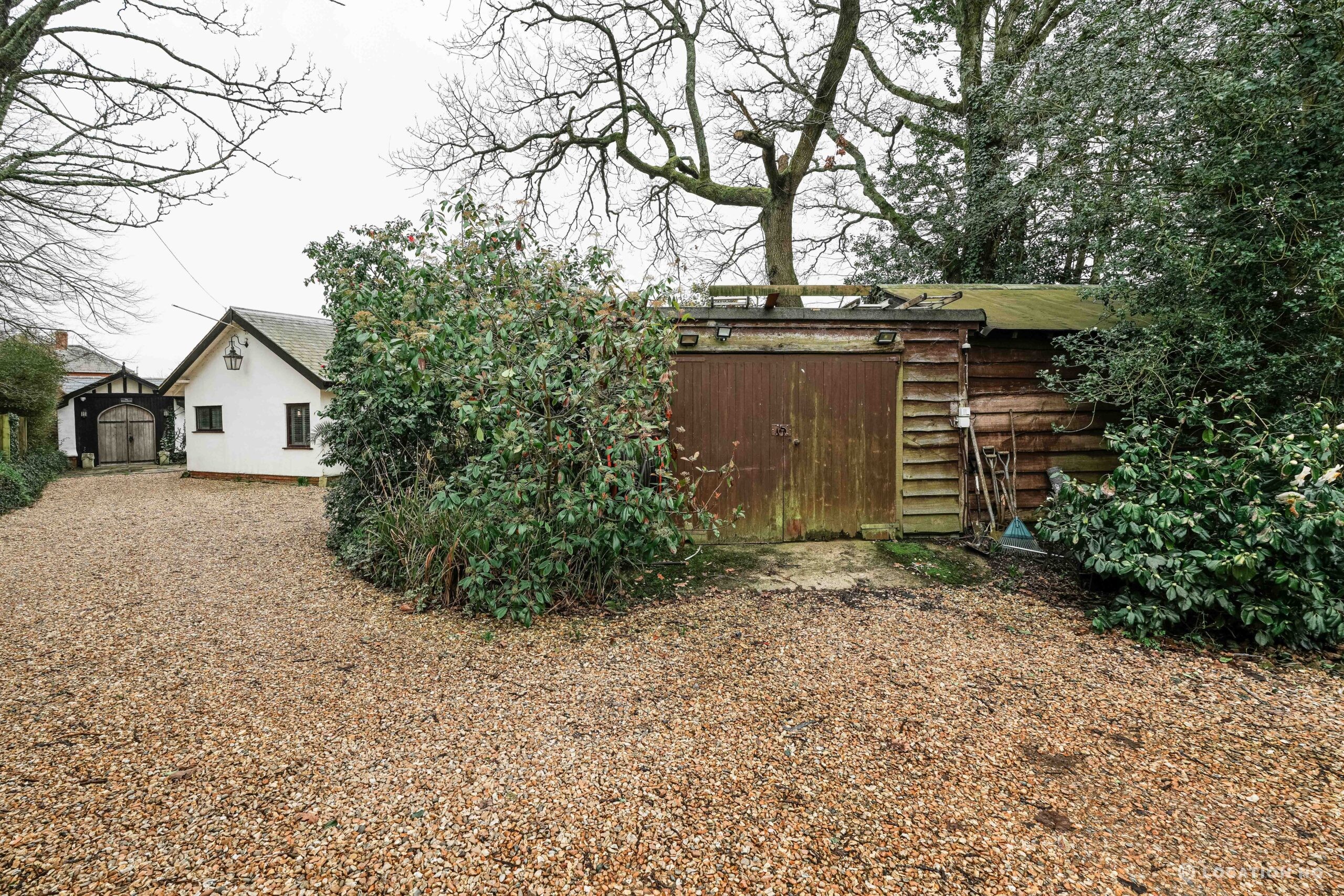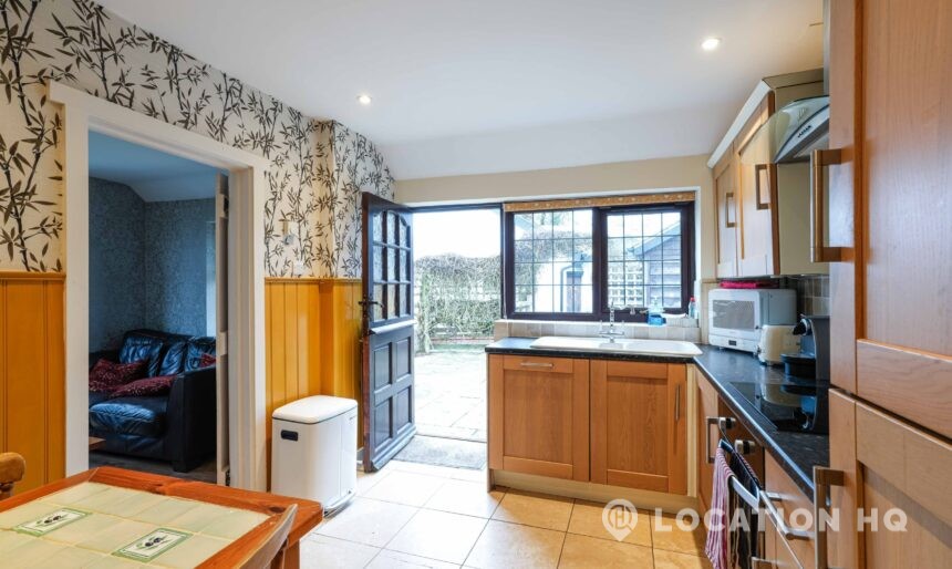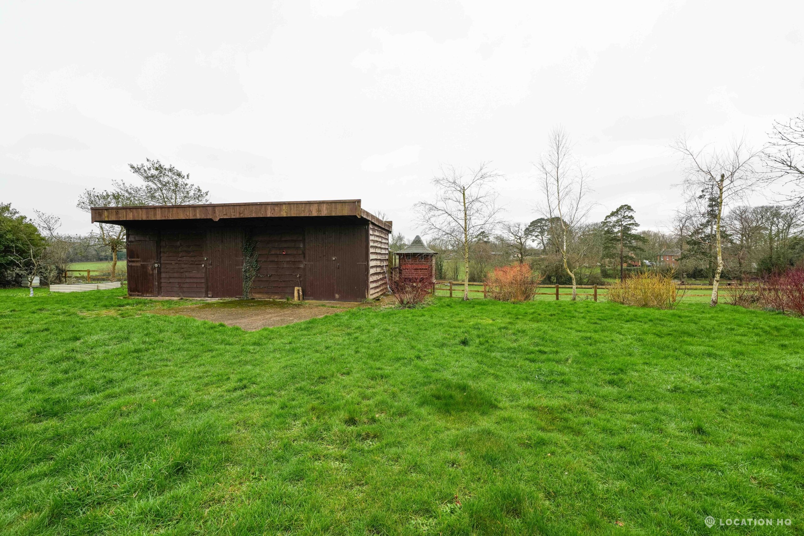 The detached bungalow offers a clear Arts and Crafts look, a separate cottage, outbuildings and 2 acres of space. Straightforward access and parking make it suitable for countryside-style filming needs.