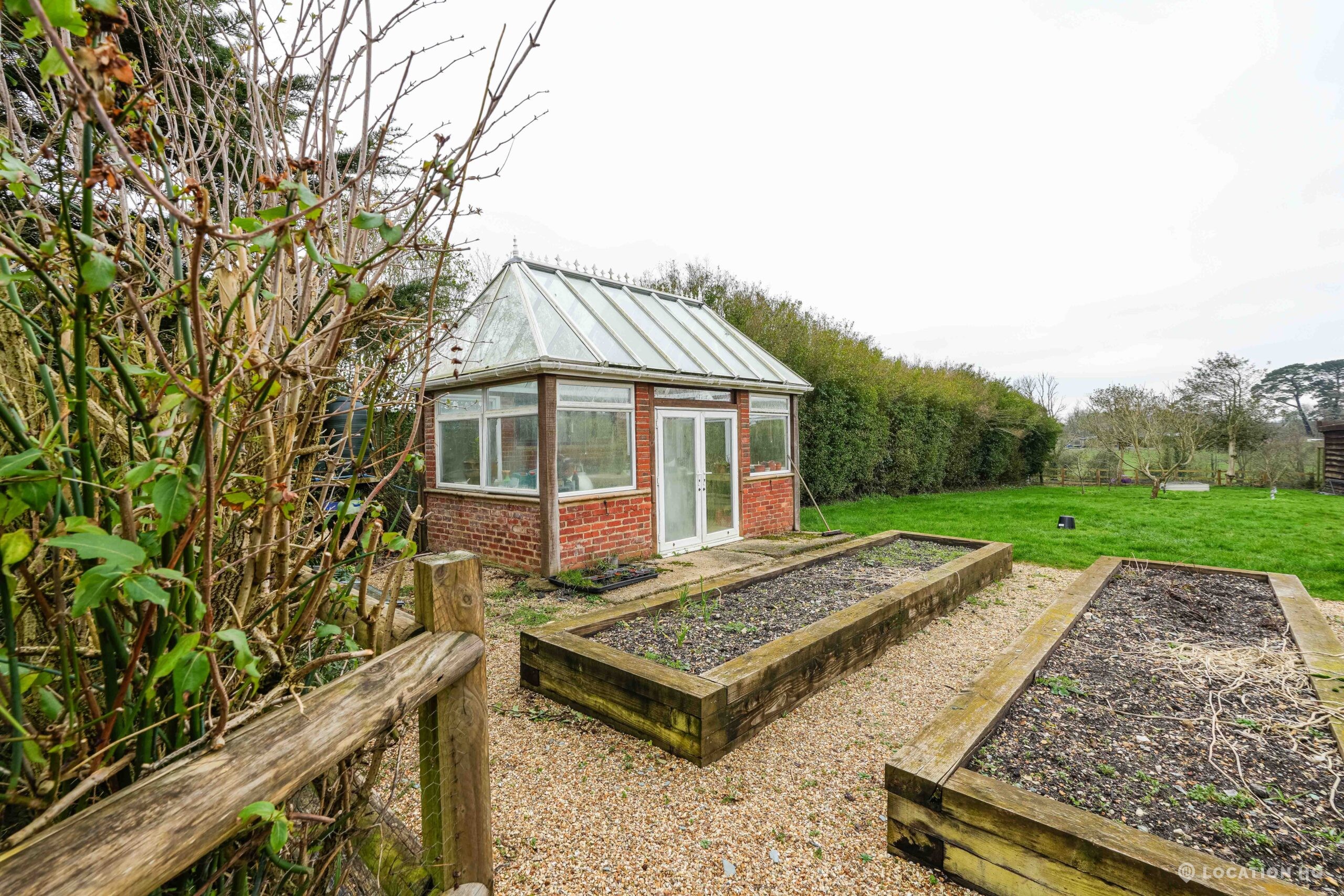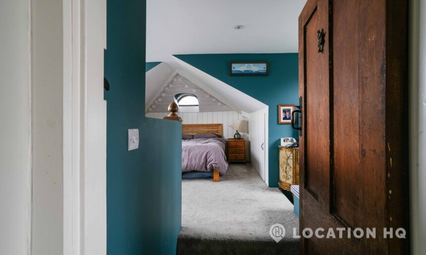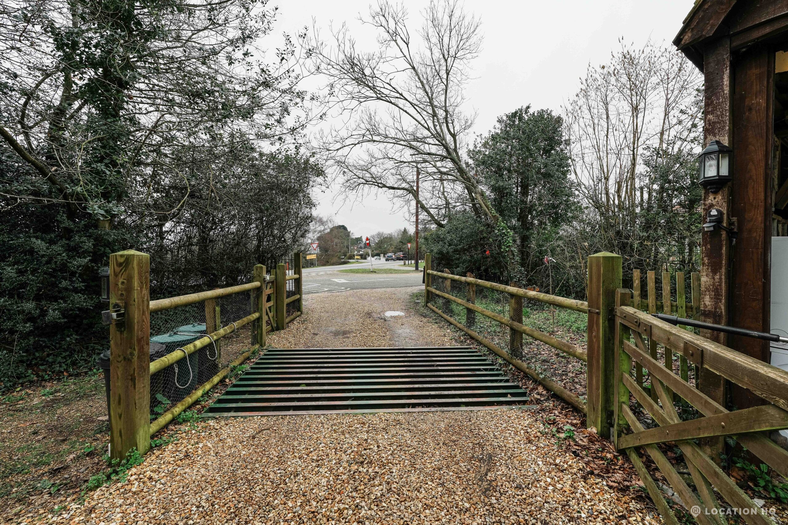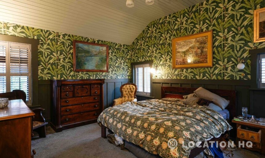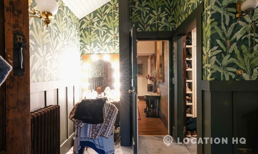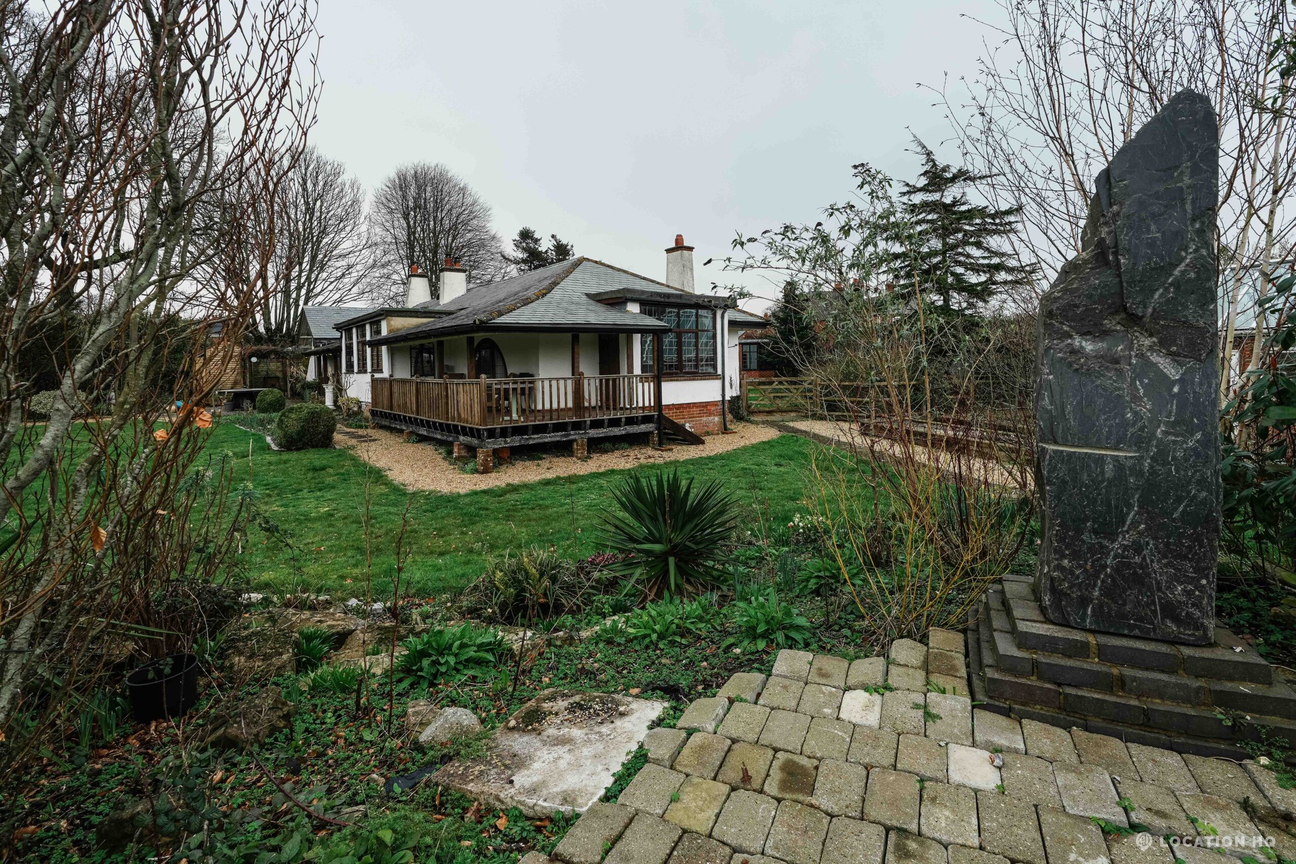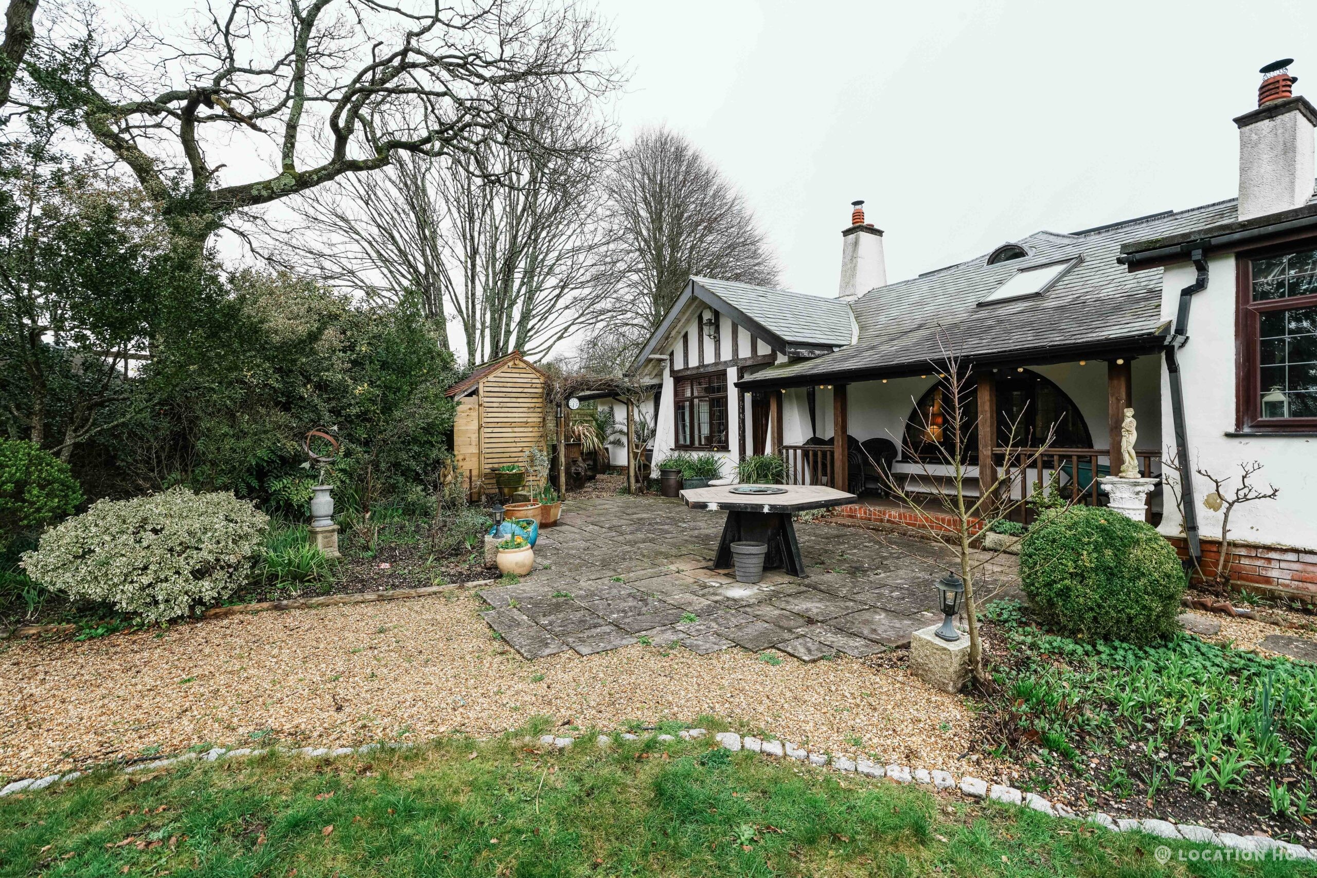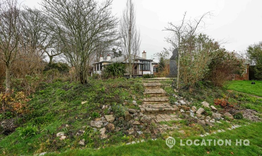 The detached bungalow offers a clear Arts and Crafts look, a separate cottage, outbuildings and 2 acres of space. Straightforward access and parking make it suitable for countryside-style filming needs.