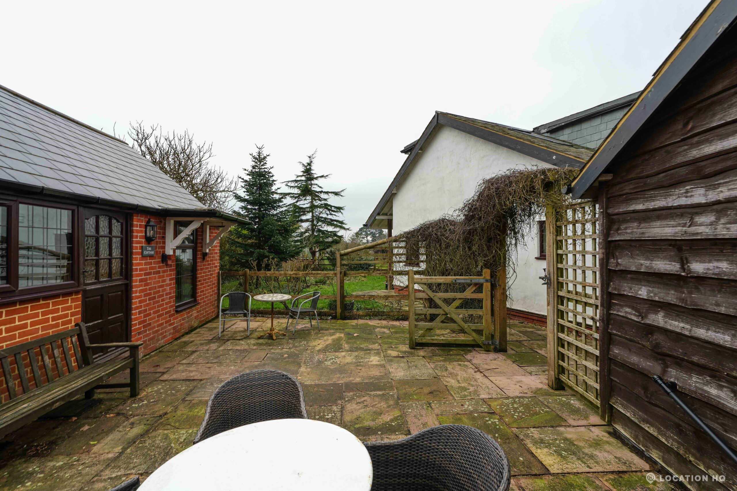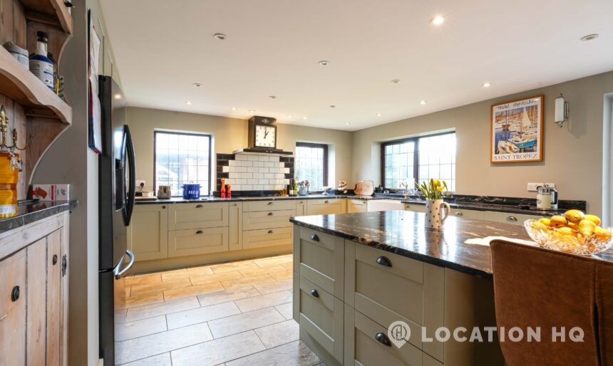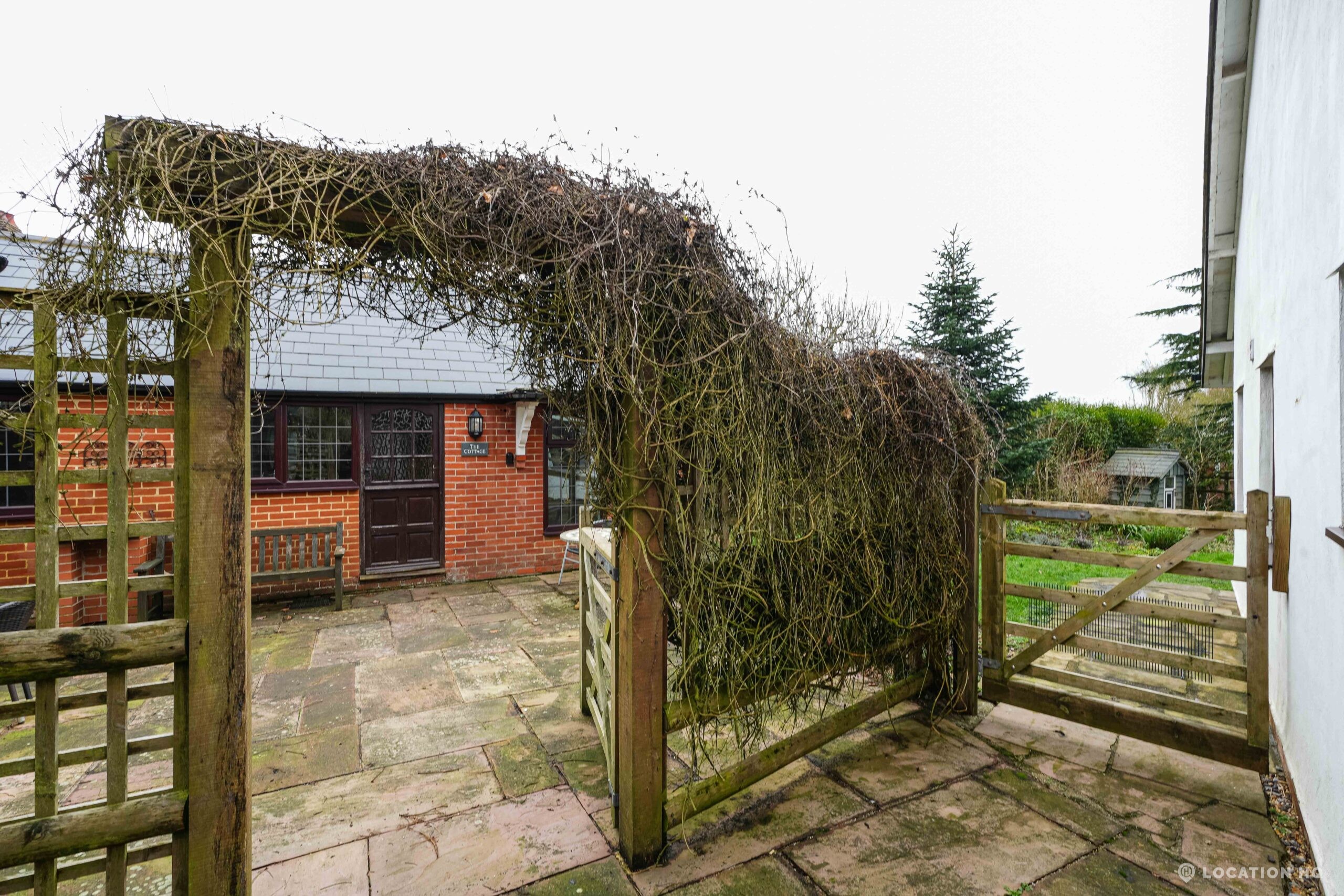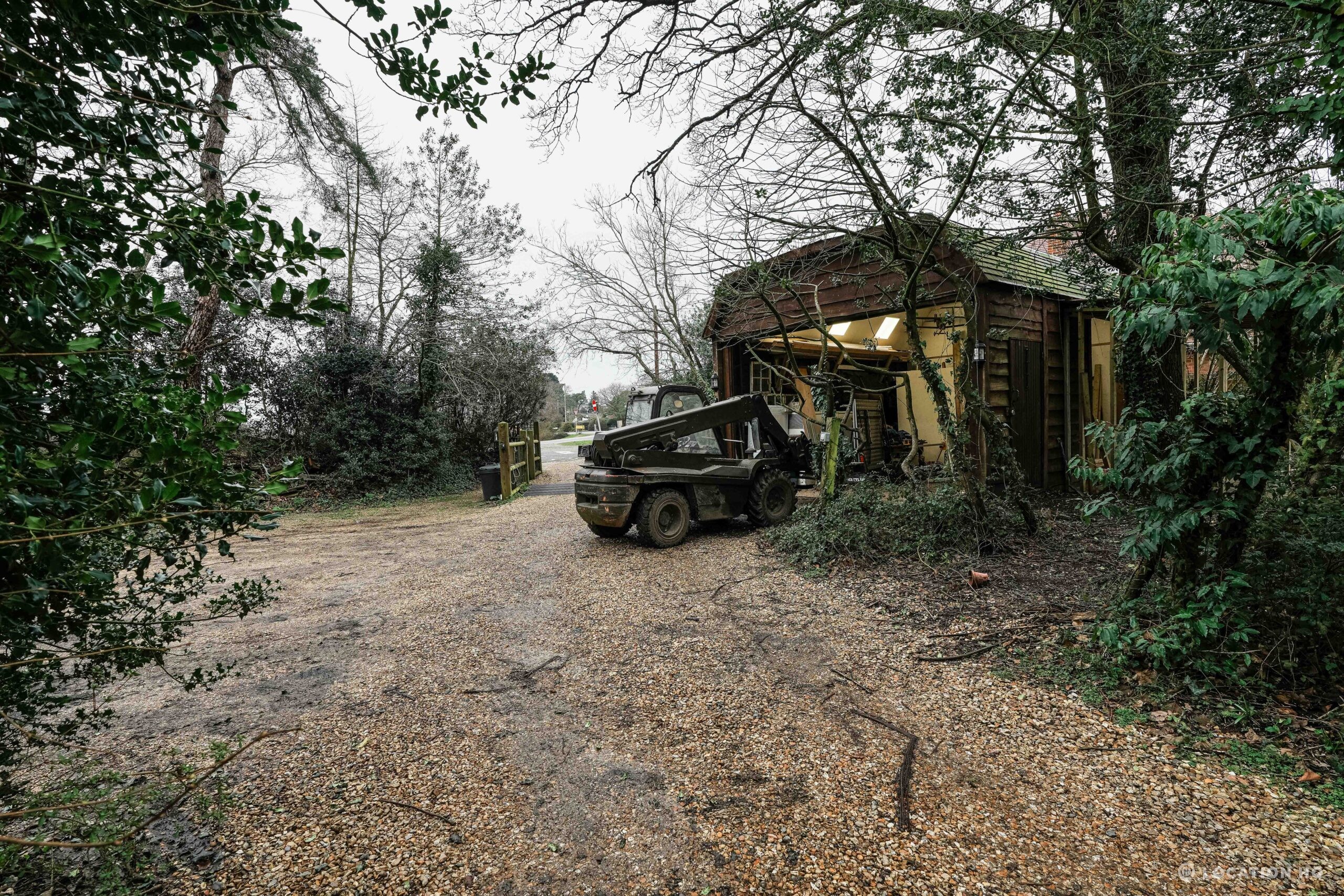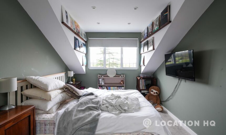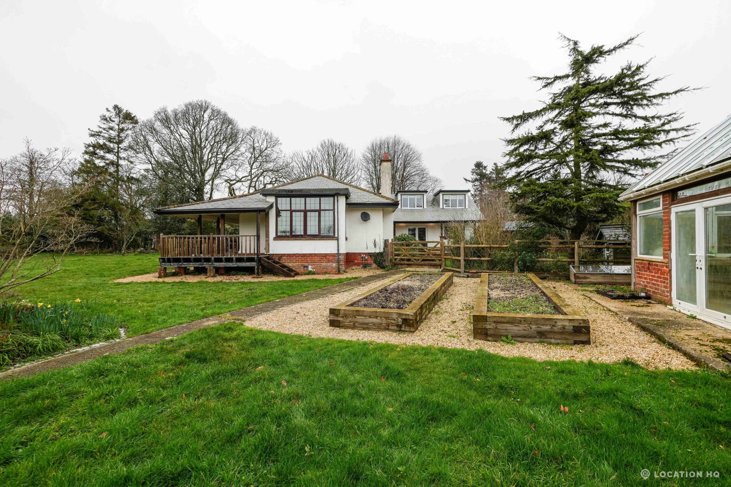 The detached bungalow offers a clear Arts and Crafts look, a separate cottage, outbuildings and 2 acres of space. Straightforward access and parking make it suitable for countryside-style filming needs.