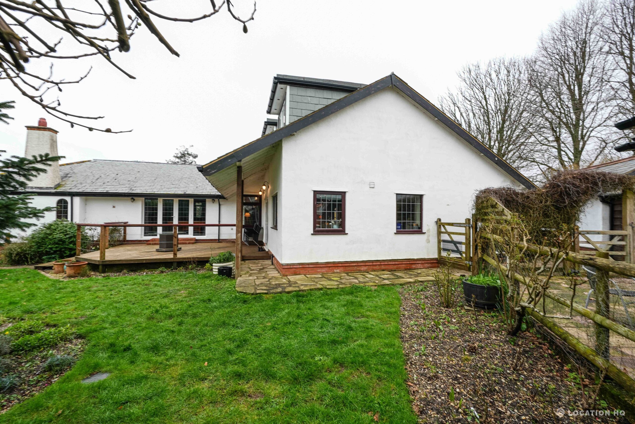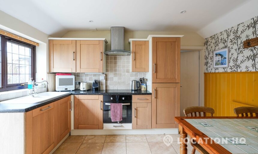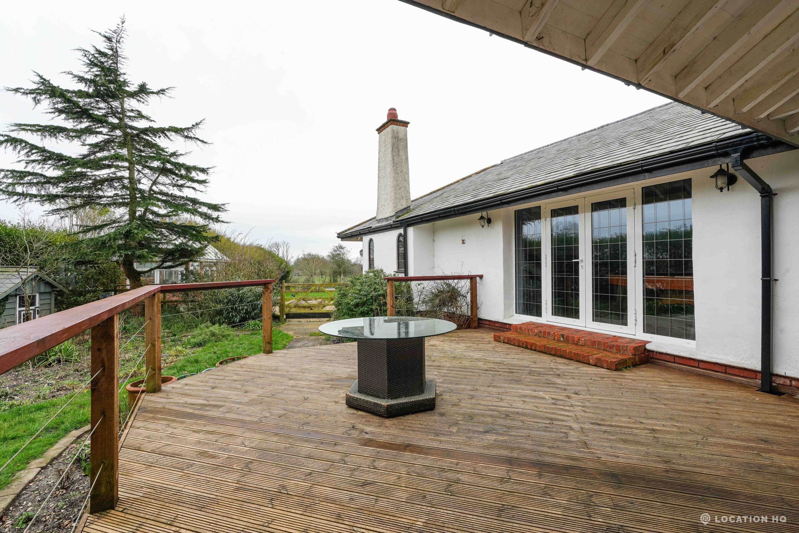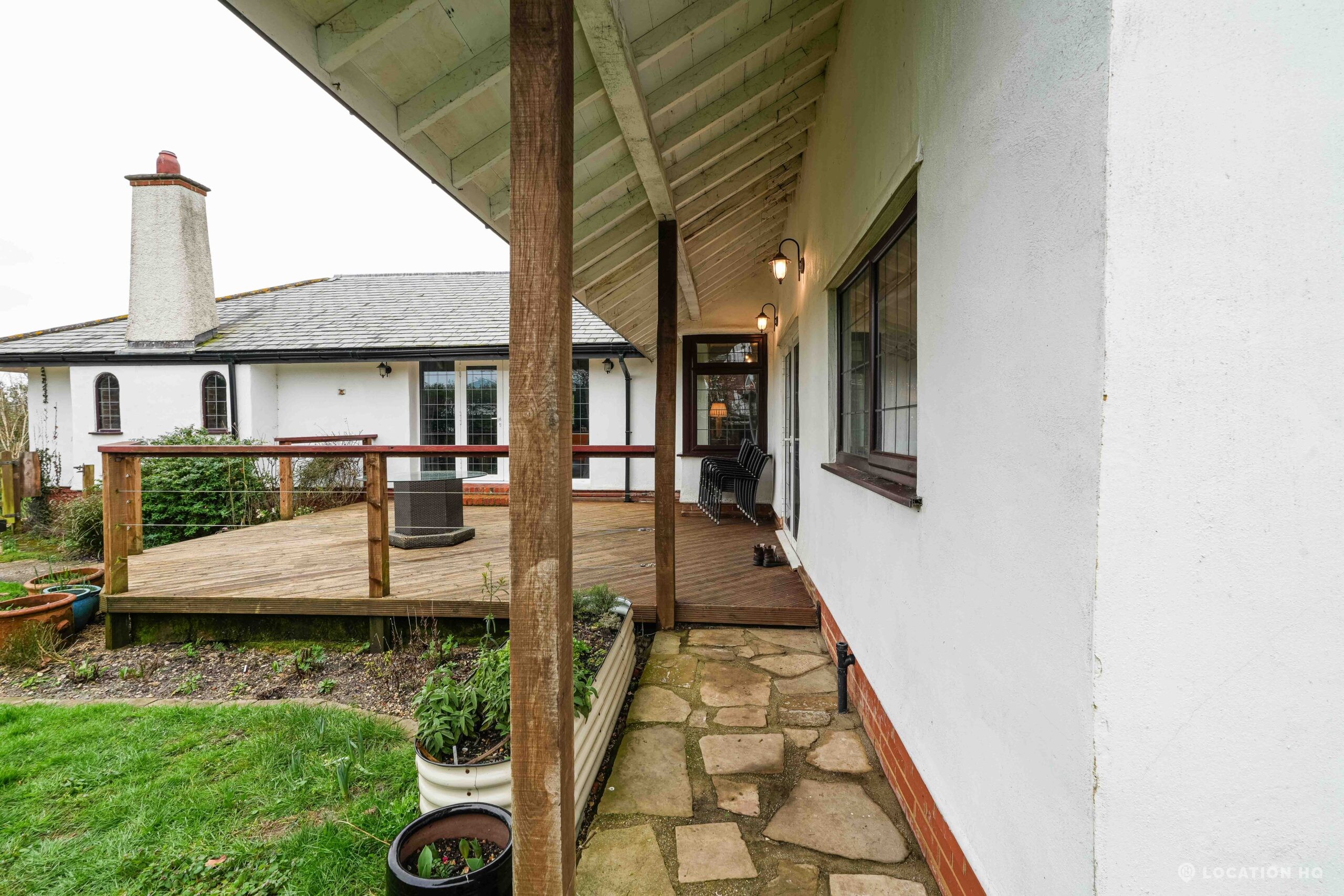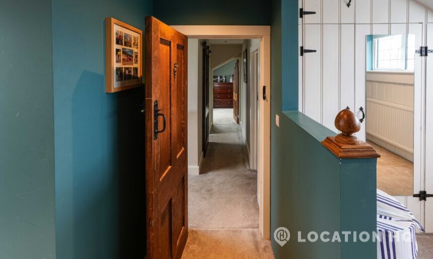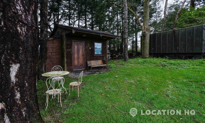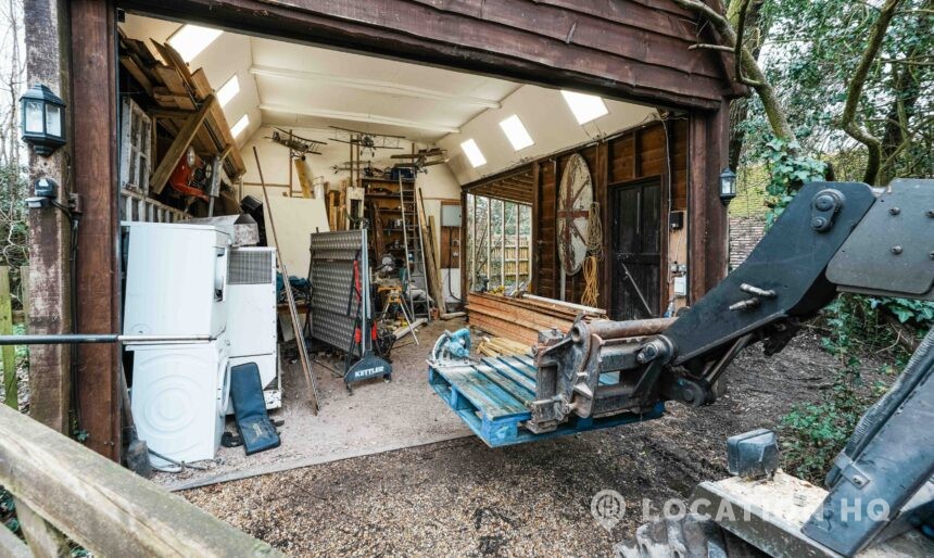 The detached bungalow offers a clear Arts and Crafts look, a separate cottage, outbuildings and 2 acres of space. Straightforward access and parking make it suitable for countryside-style filming needs.