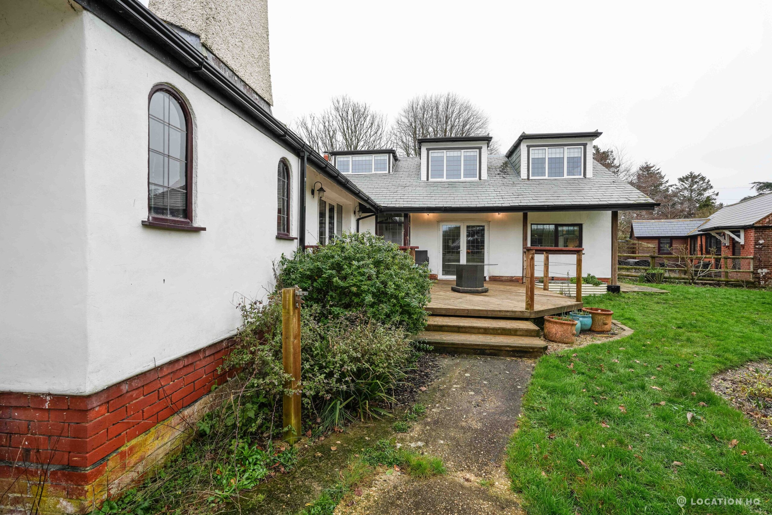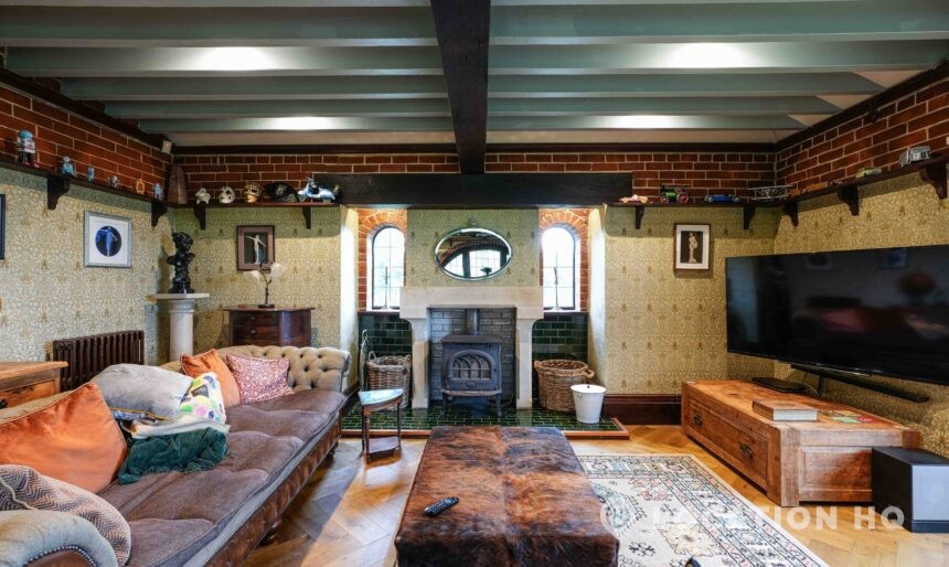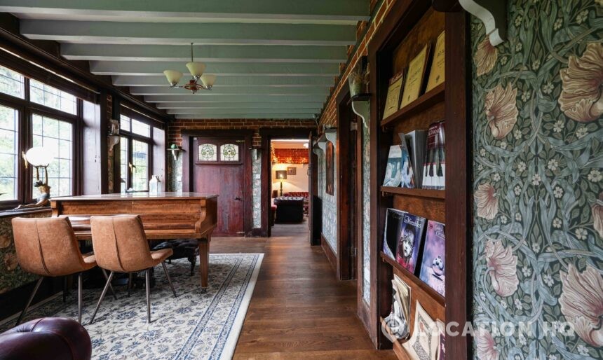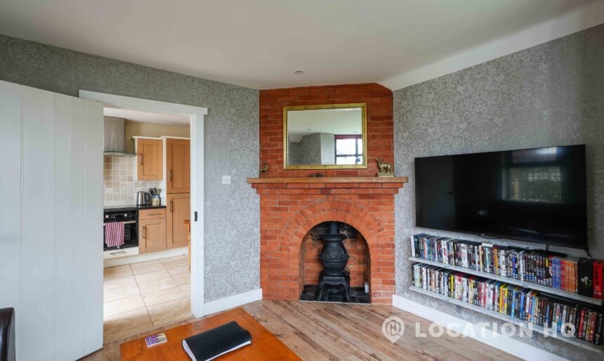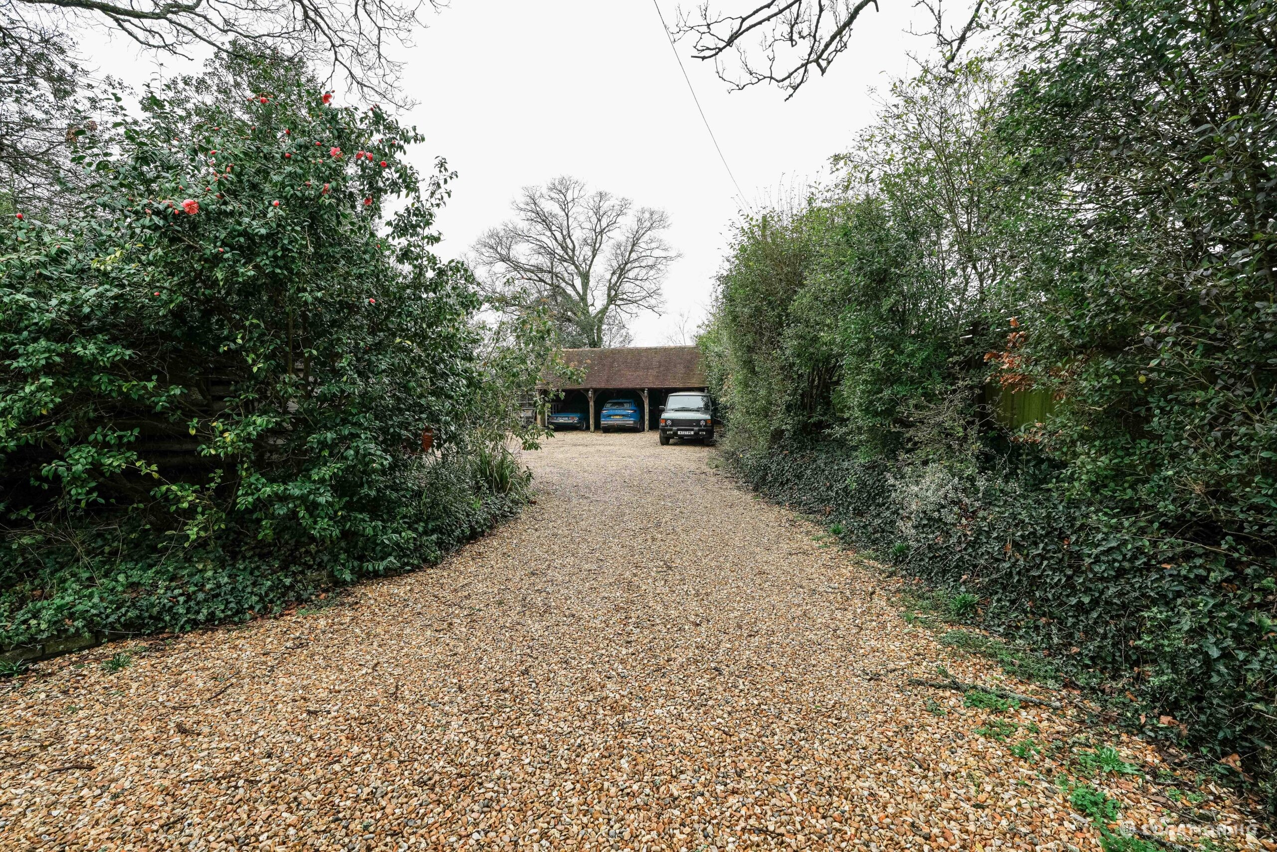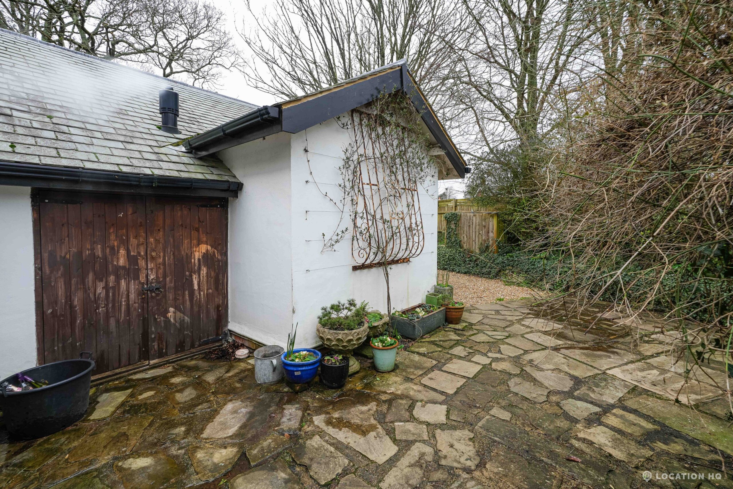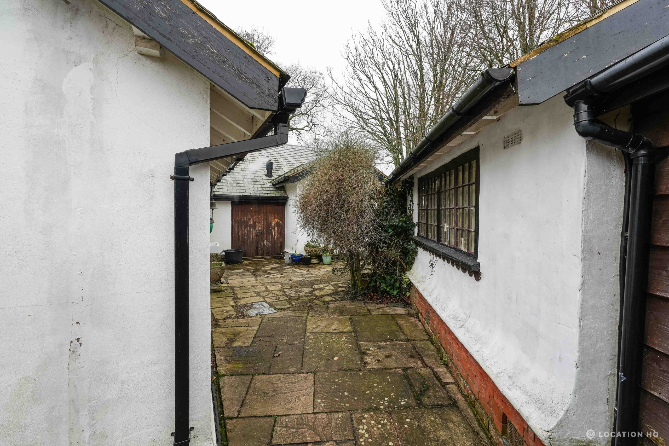 The detached bungalow offers a clear Arts and Crafts look, a separate cottage, outbuildings and 2 acres of space. Straightforward access and parking make it suitable for countryside-style filming needs.