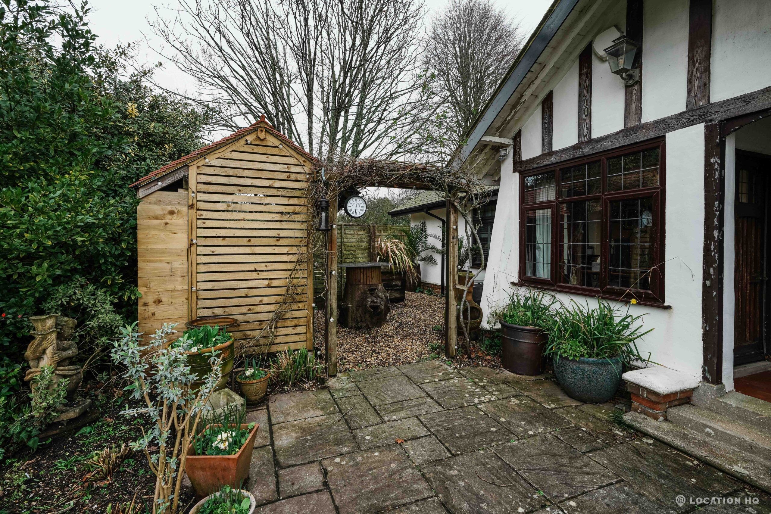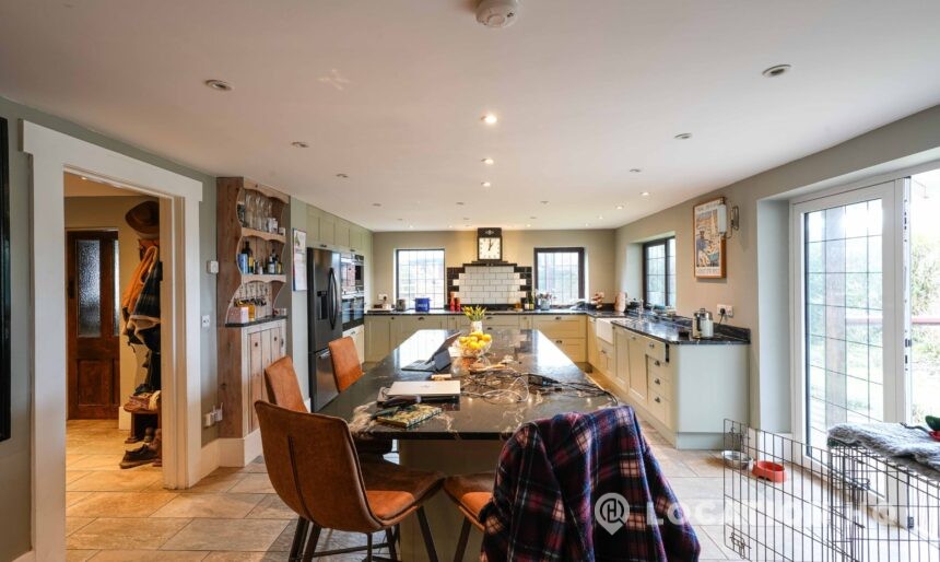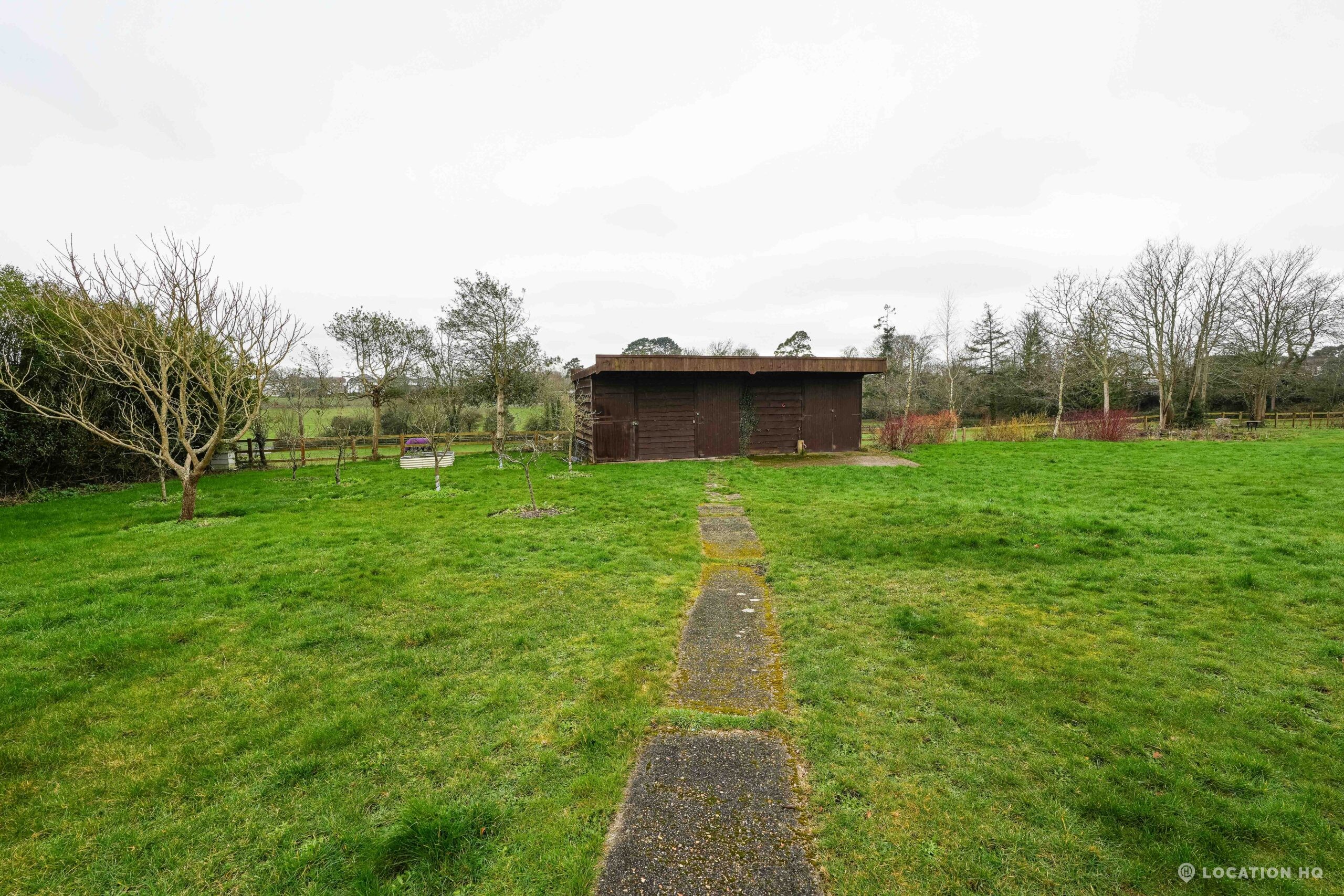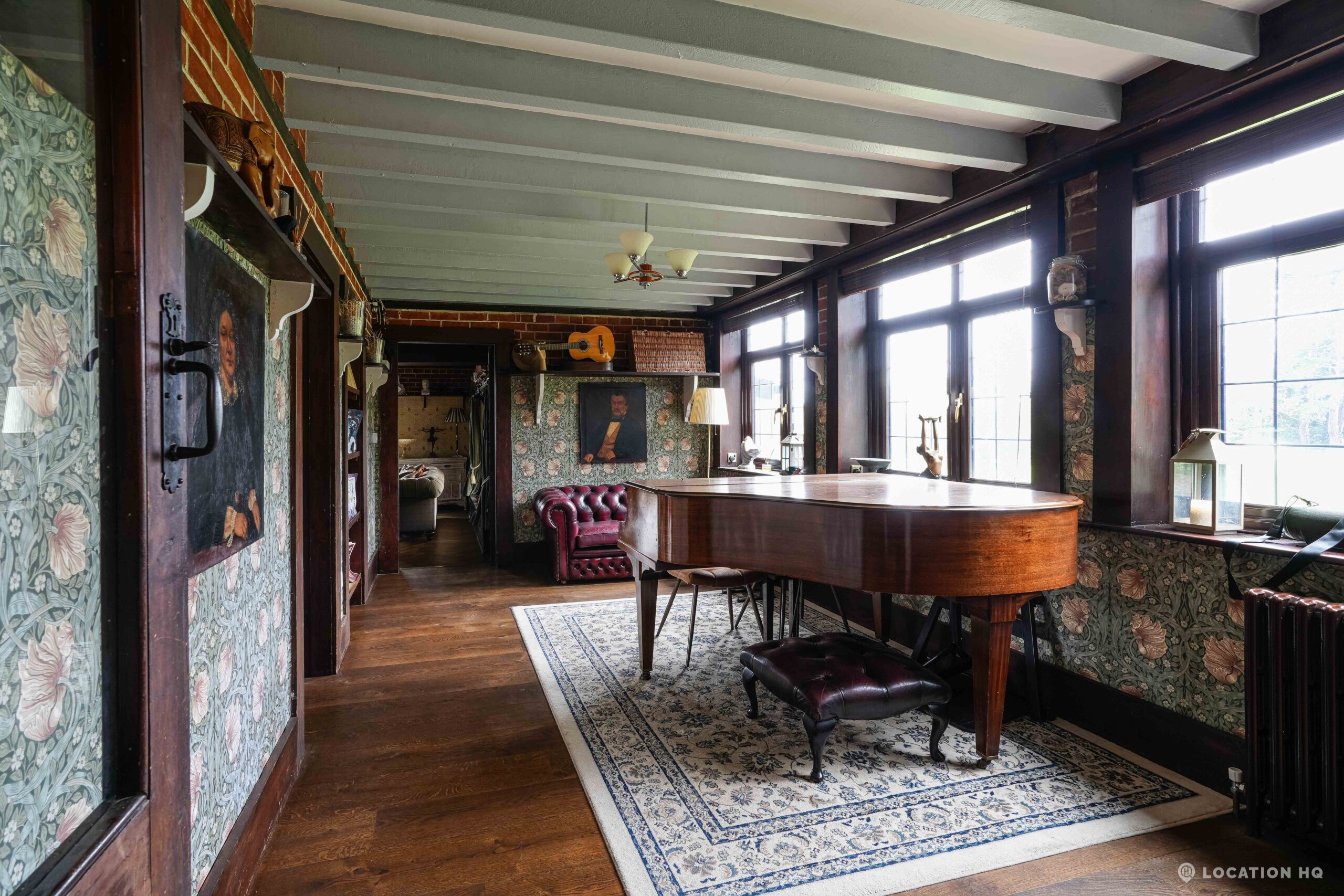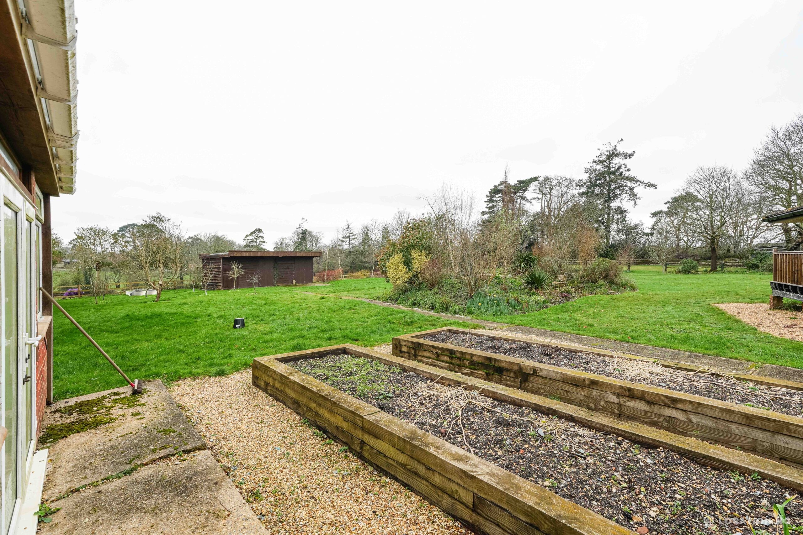 The detached bungalow offers a clear Arts and Crafts look, a separate cottage, outbuildings and 2 acres of space. Straightforward access and parking make it suitable for countryside-style filming needs.
