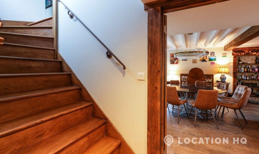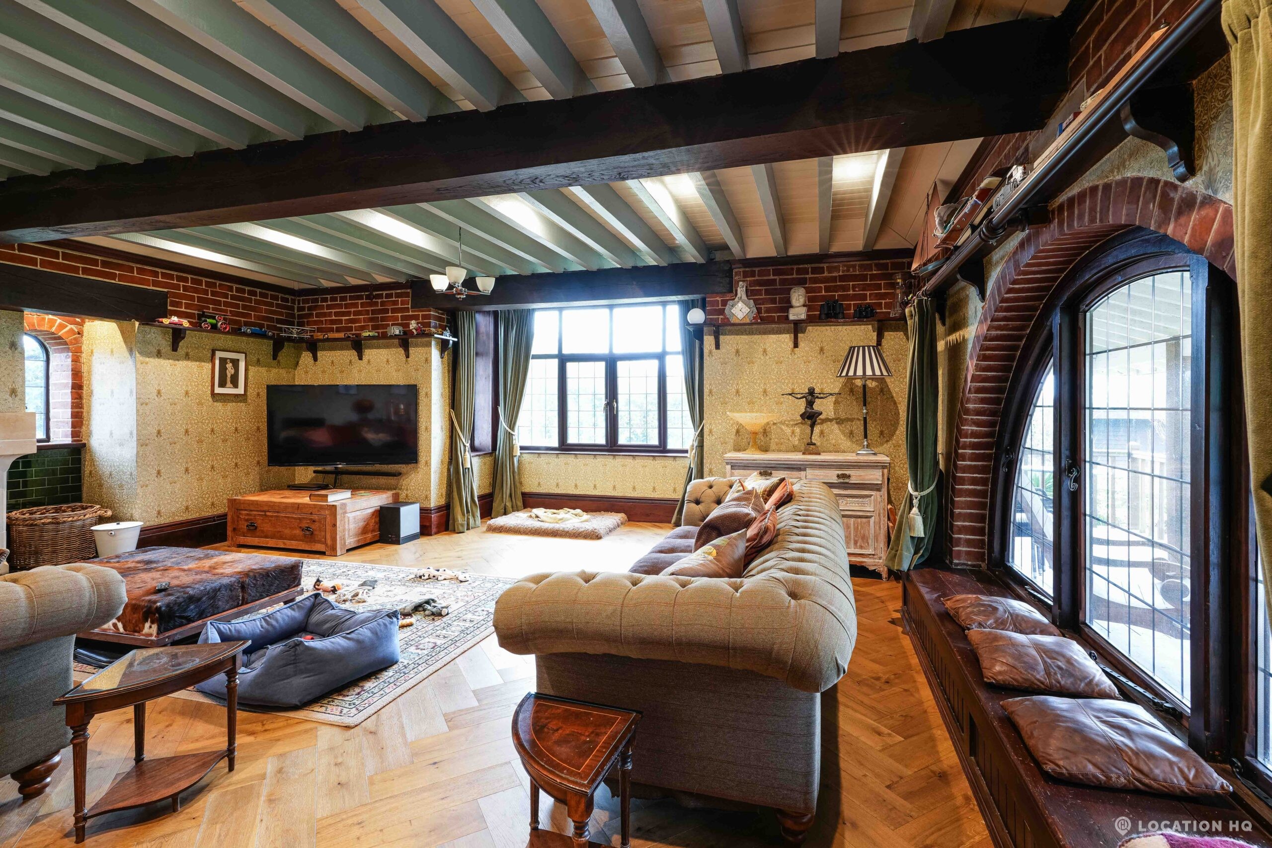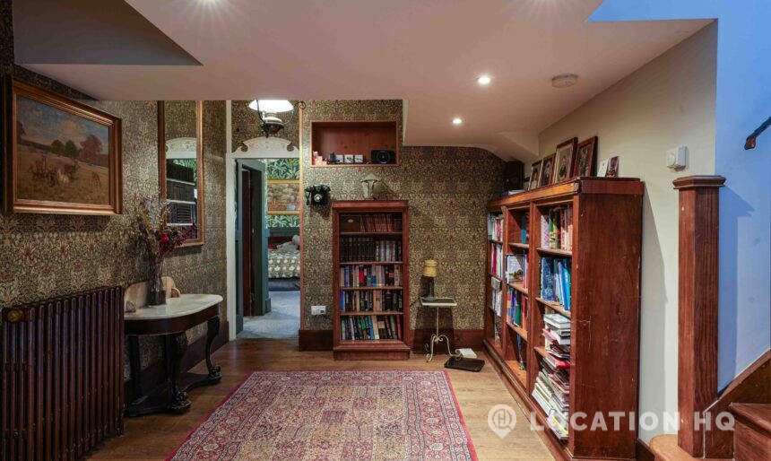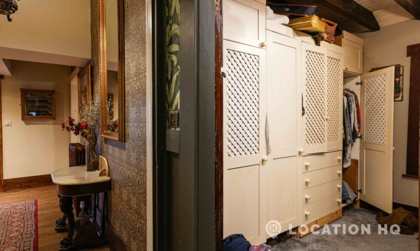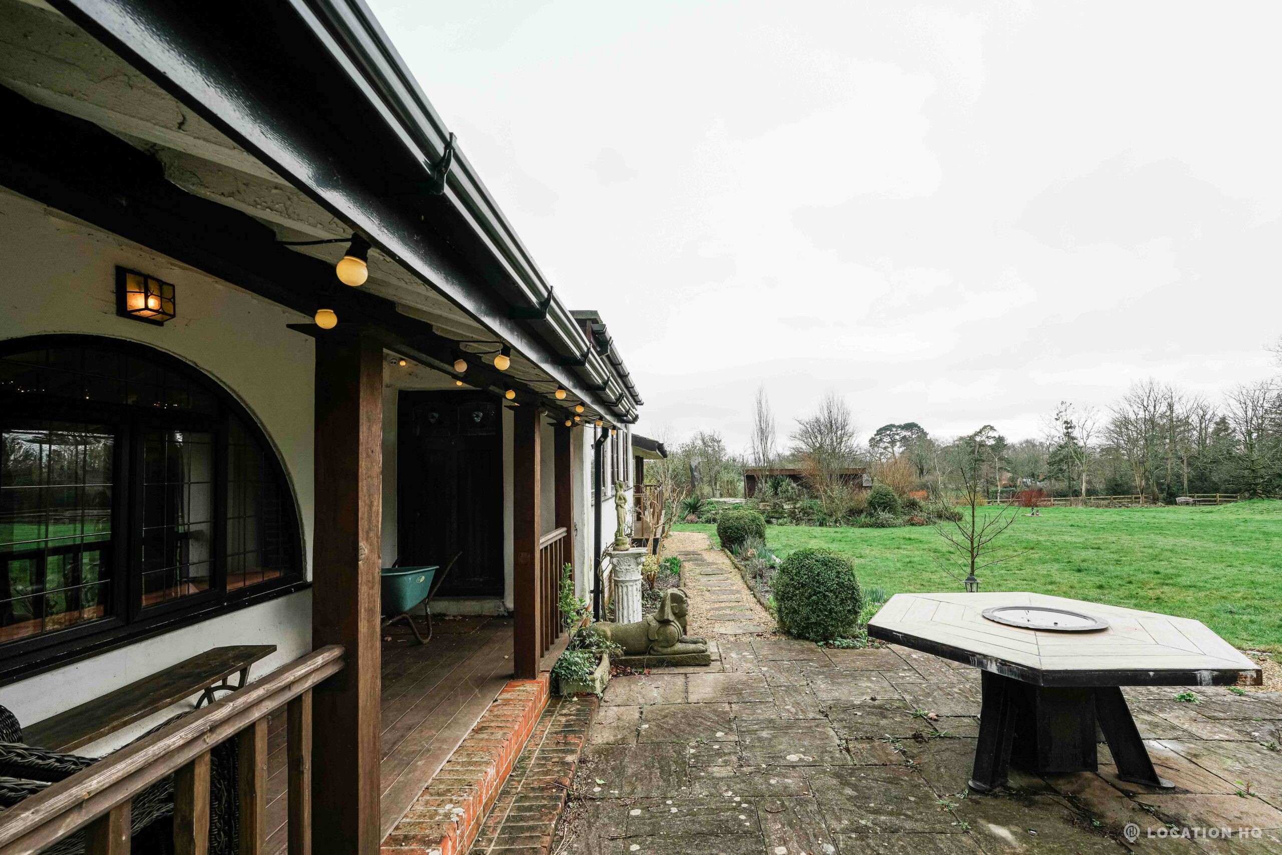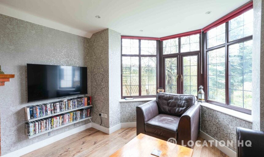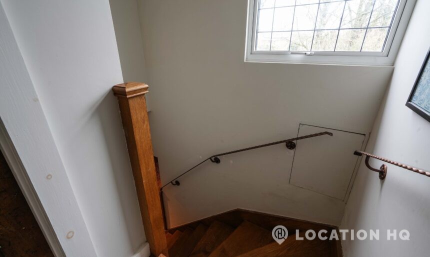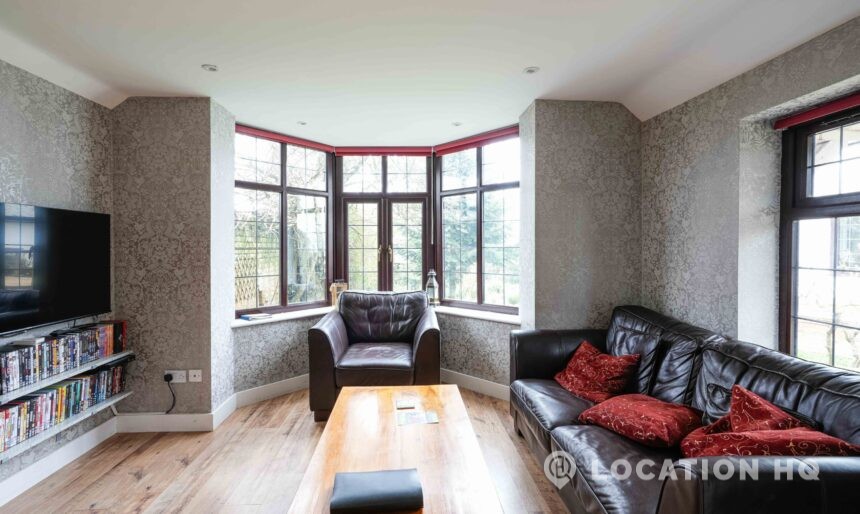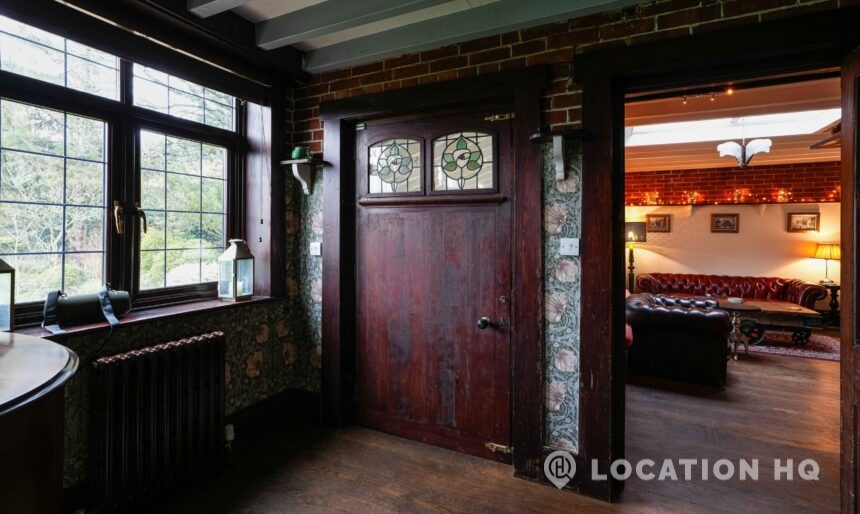 The detached bungalow is an Arts and Crafts style property set on 2 acres, with a separate cottage and useful outbuildings on site. A world first with a Bungalow gatehouse. The layout and grounds make it easy for access, with a large drive and parking big enough for a small unit base. This detached retro bungalow is a good option for productions needing a countryside detached bungalow with clear Arts and Crafts features, plus plenty of space for crew, parking and general setup without complications.