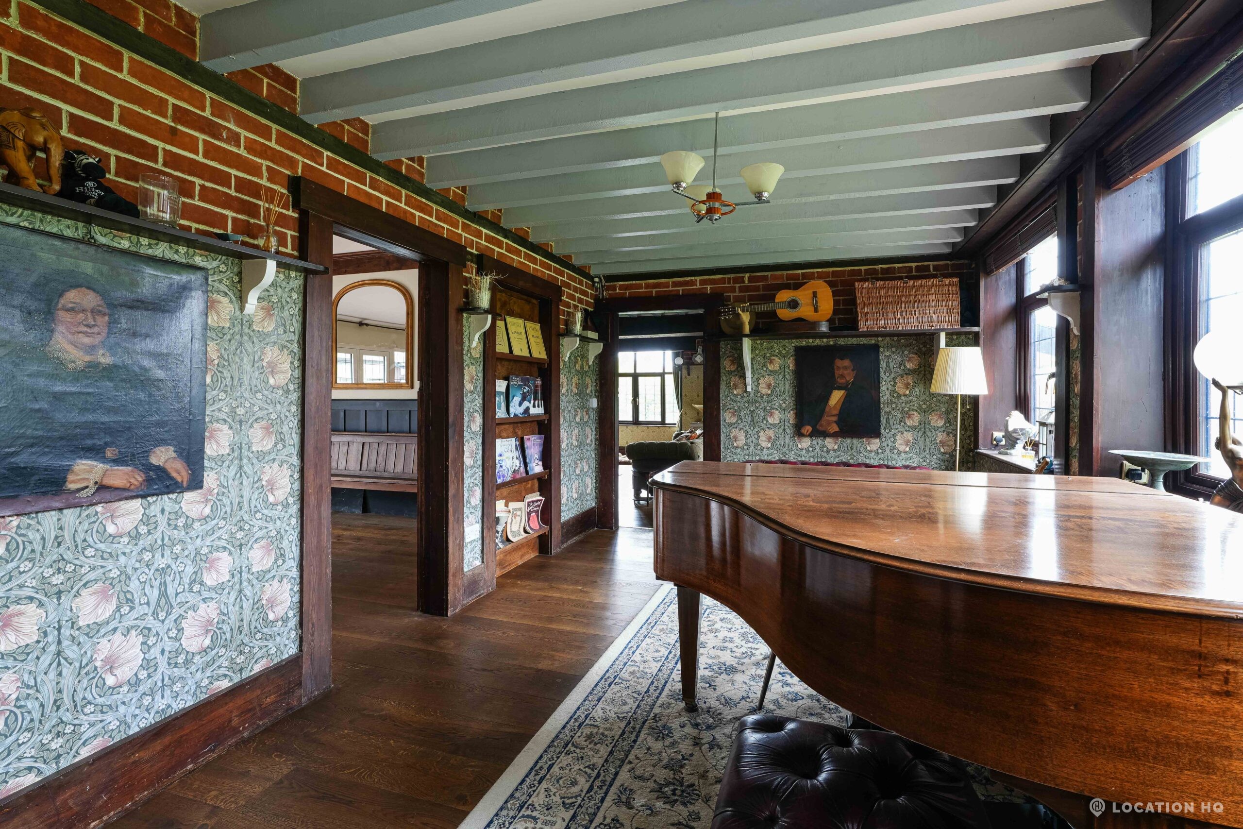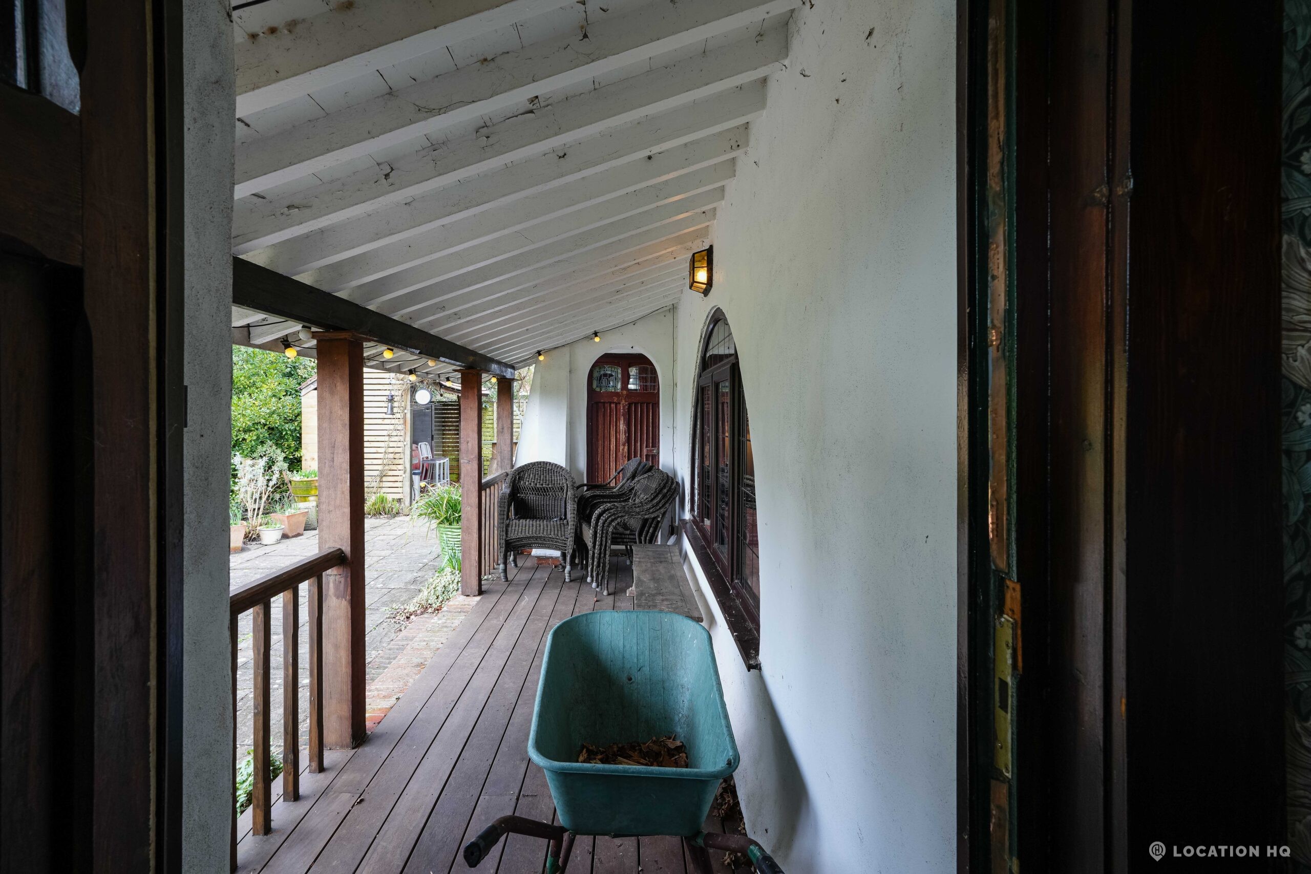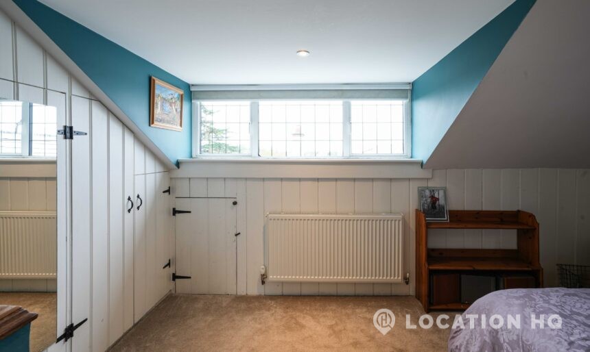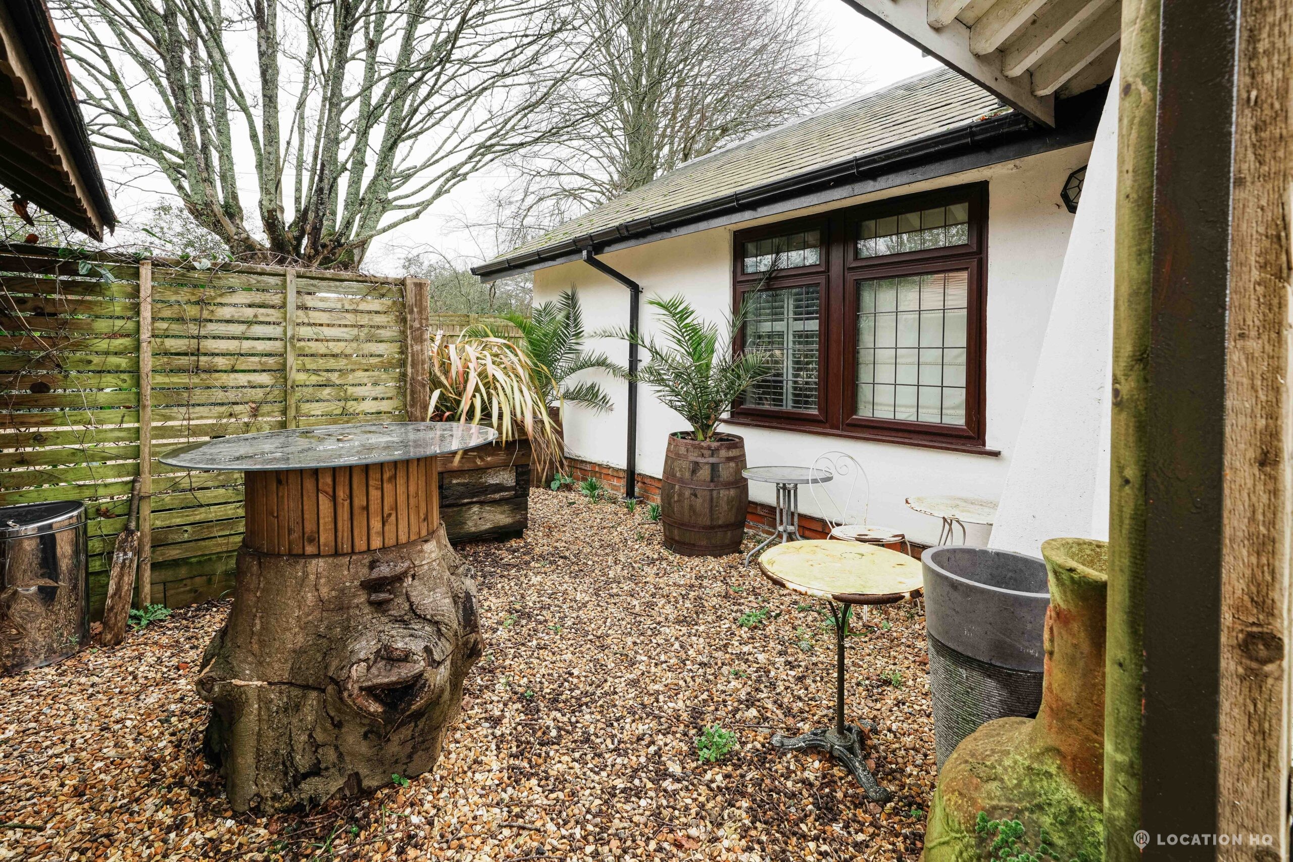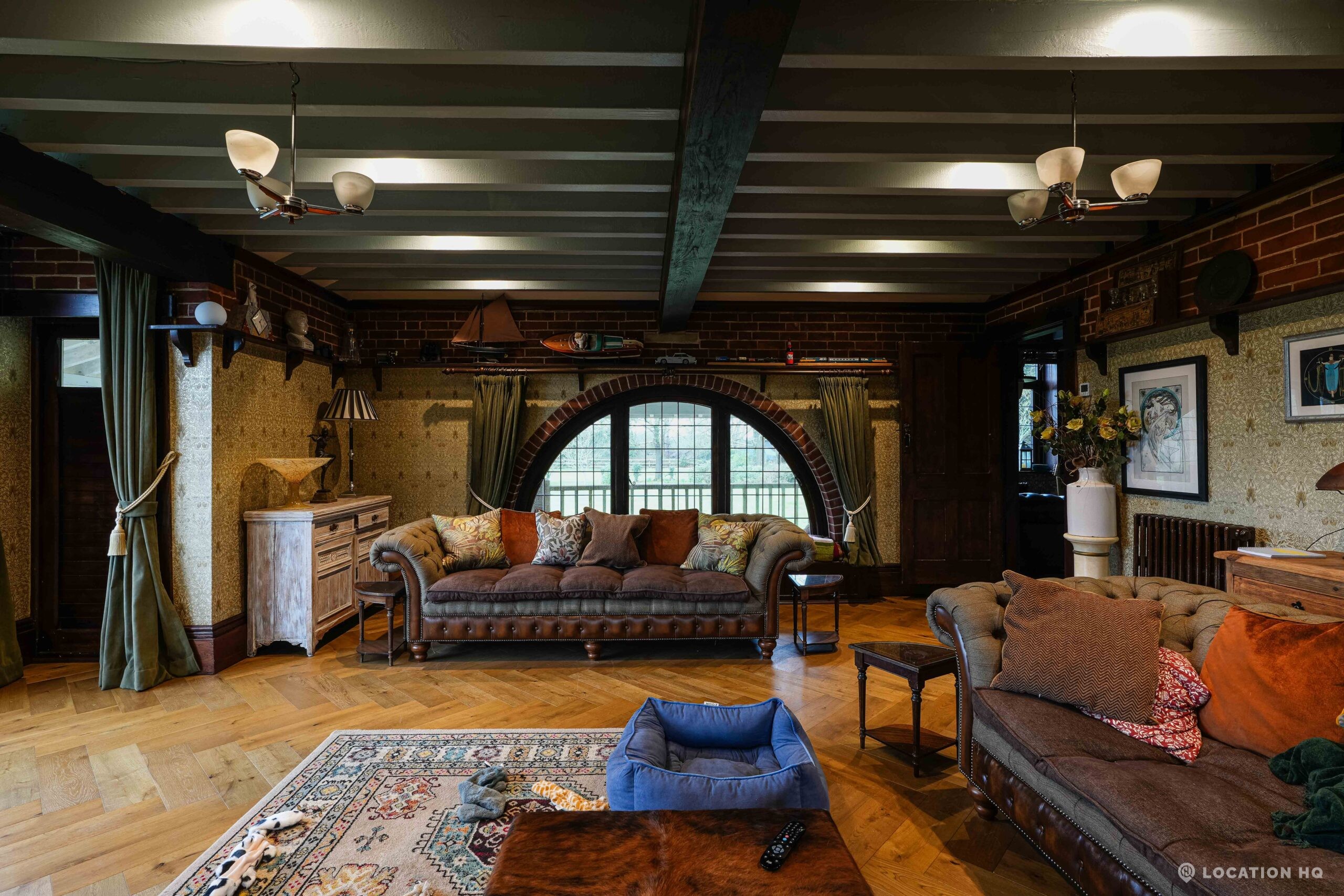 The detached bungalow is an Arts and Crafts style property set on 2 acres, with a separate cottage and useful outbuildings on site. A world first with a Bungalow gatehouse. The layout and grounds make it easy for access, with a large drive and parking big enough for a small unit base. This detached retro bungalow is a good option for productions needing a countryside detached bungalow with clear Arts and Crafts features, plus plenty of space for crew, parking and general setup without complications.