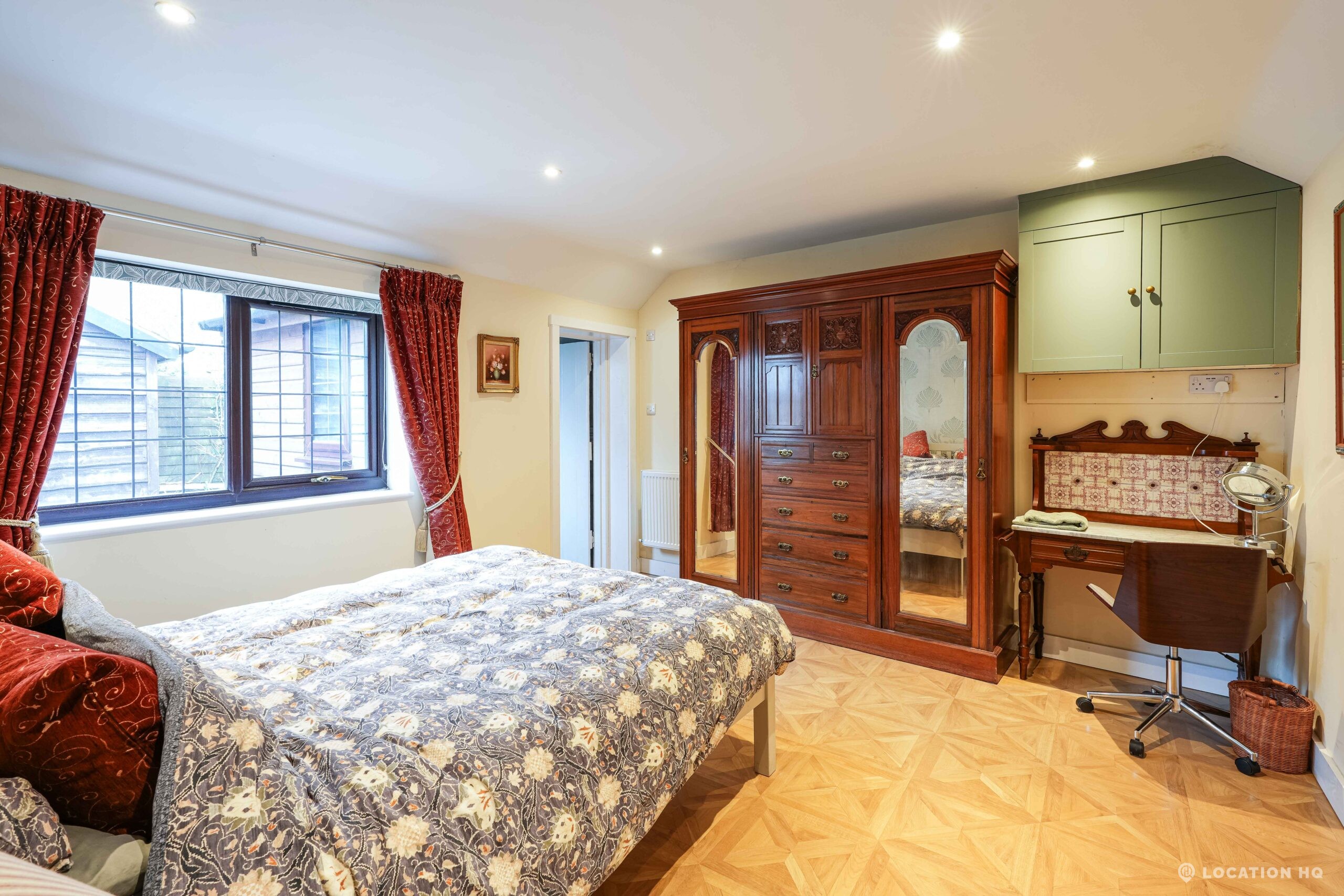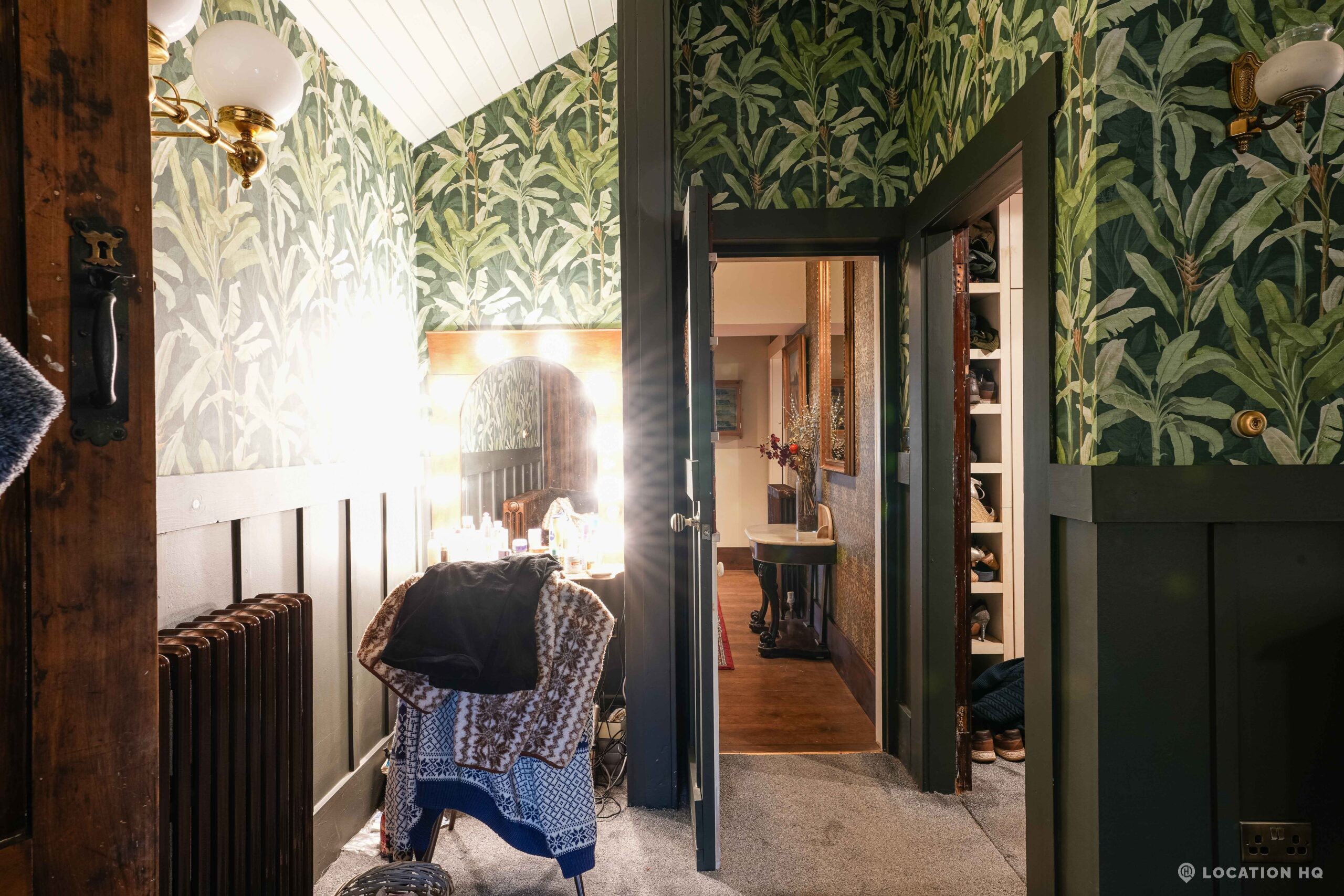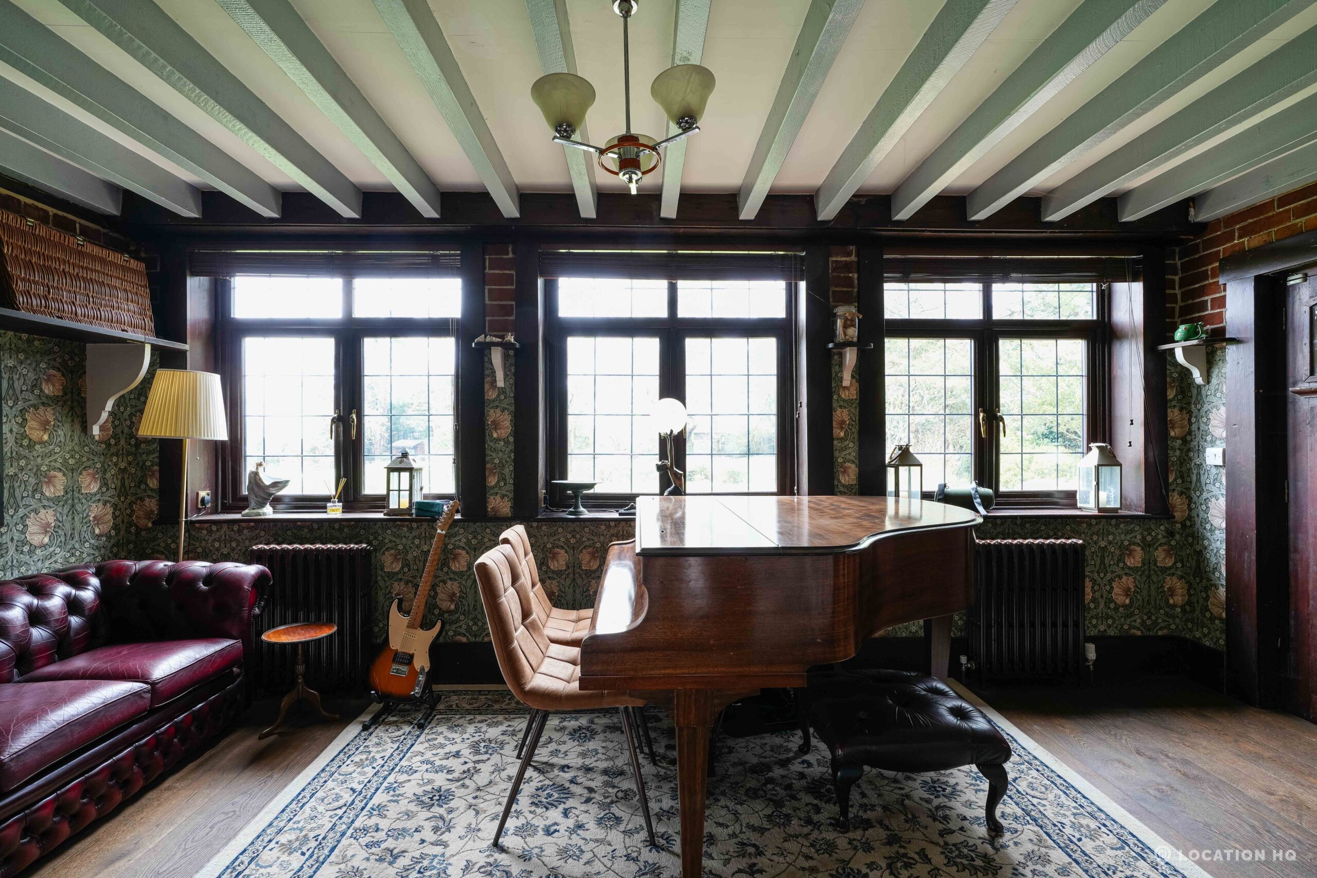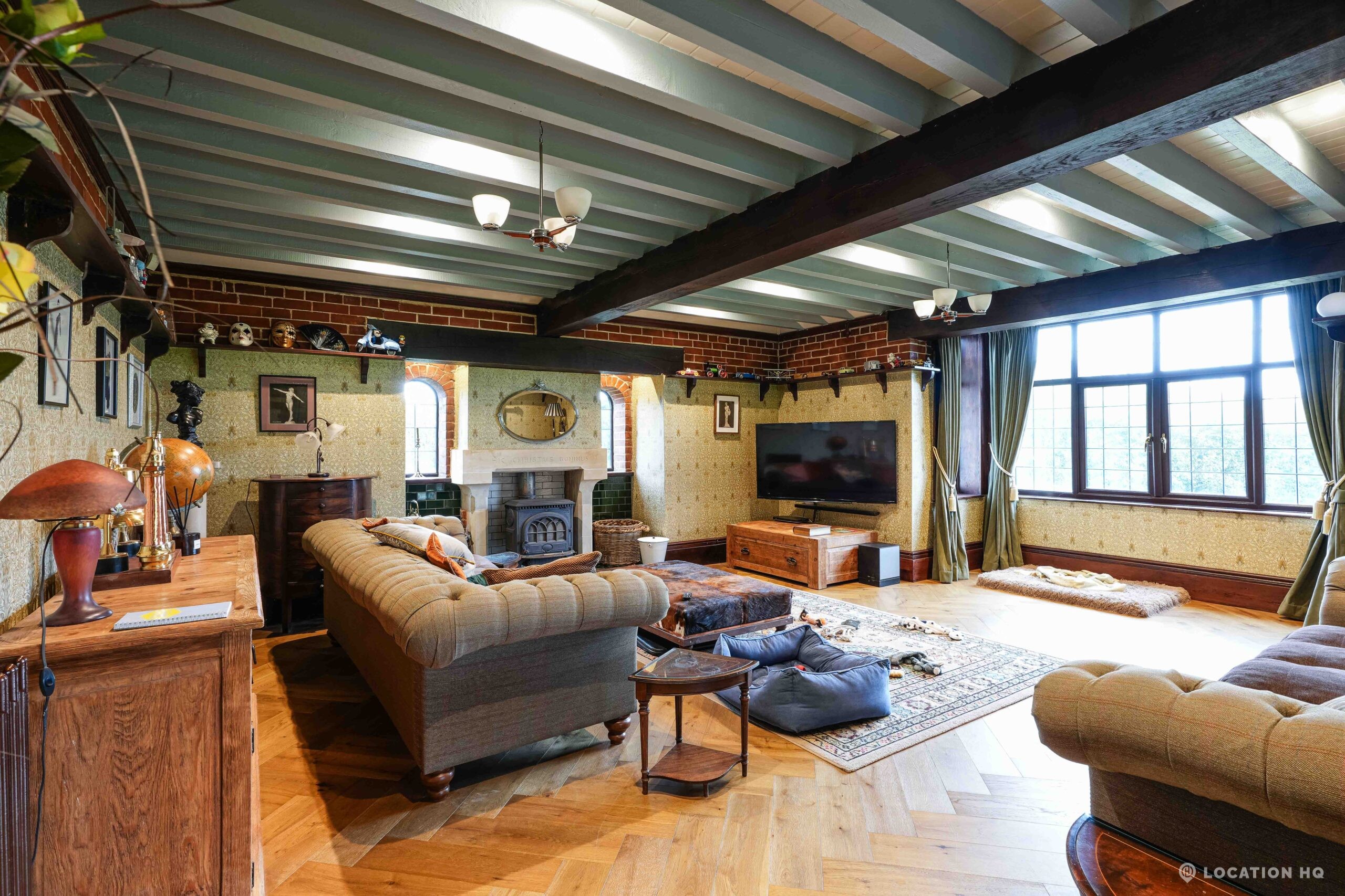 The detached bungalow is an Arts and Crafts style property set on 2 acres, with a separate cottage and useful outbuildings on site. A world first with a Bungalow gatehouse. The layout and grounds make it easy for access, with a large drive and parking big enough for a small unit base. This detached retro bungalow is a good option for productions needing a countryside detached bungalow with clear Arts and Crafts features, plus plenty of space for crew, parking and general setup without complications.