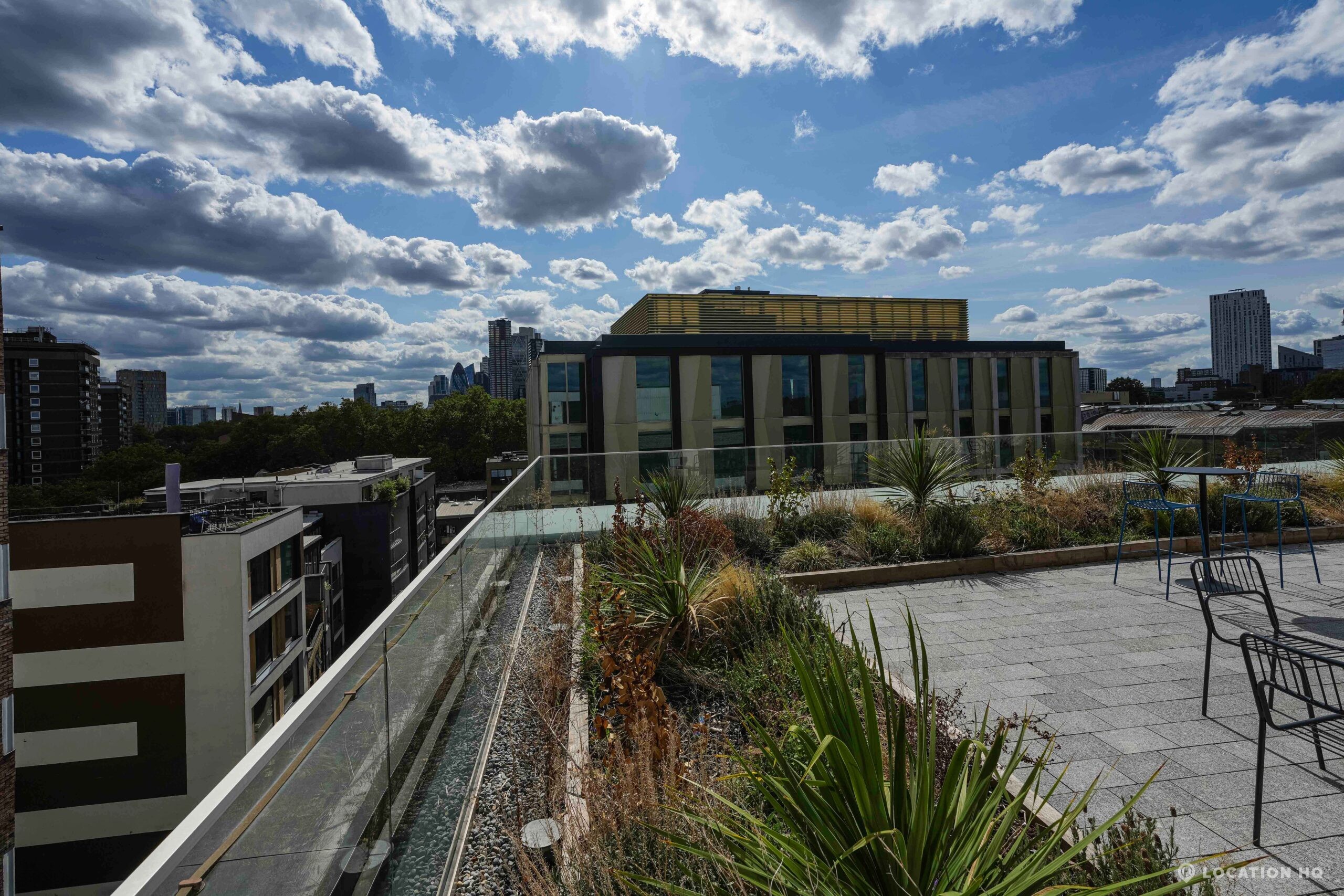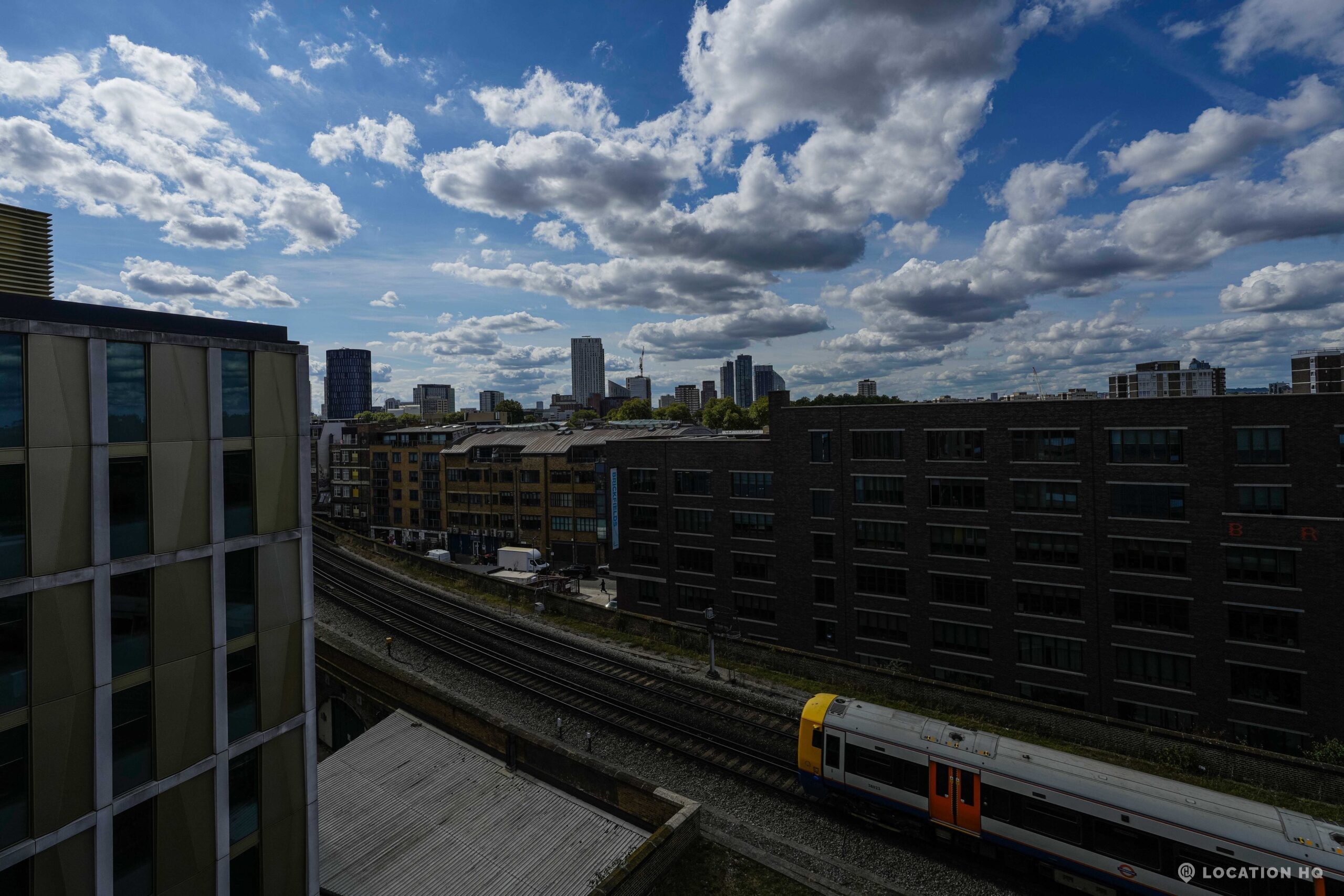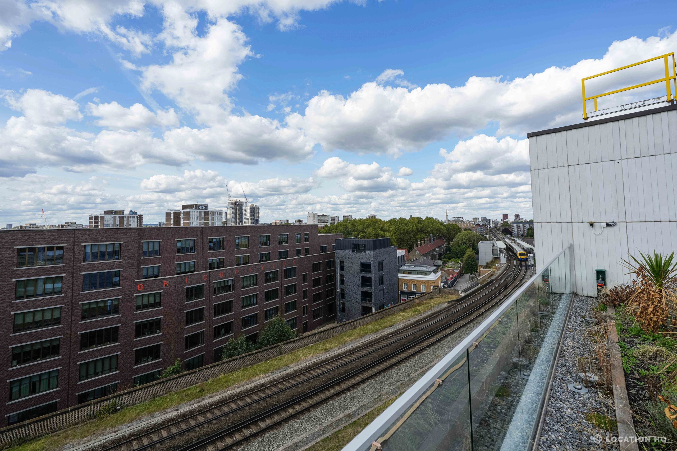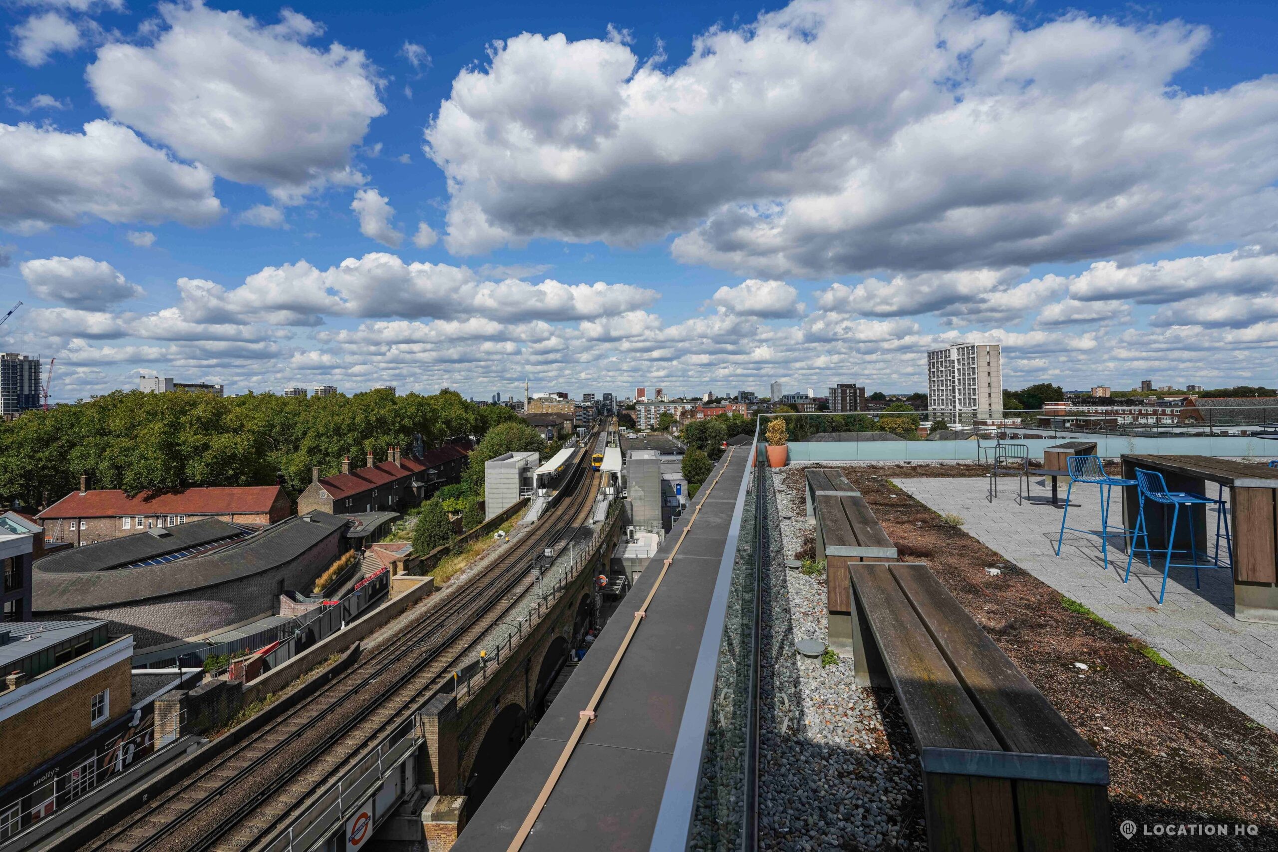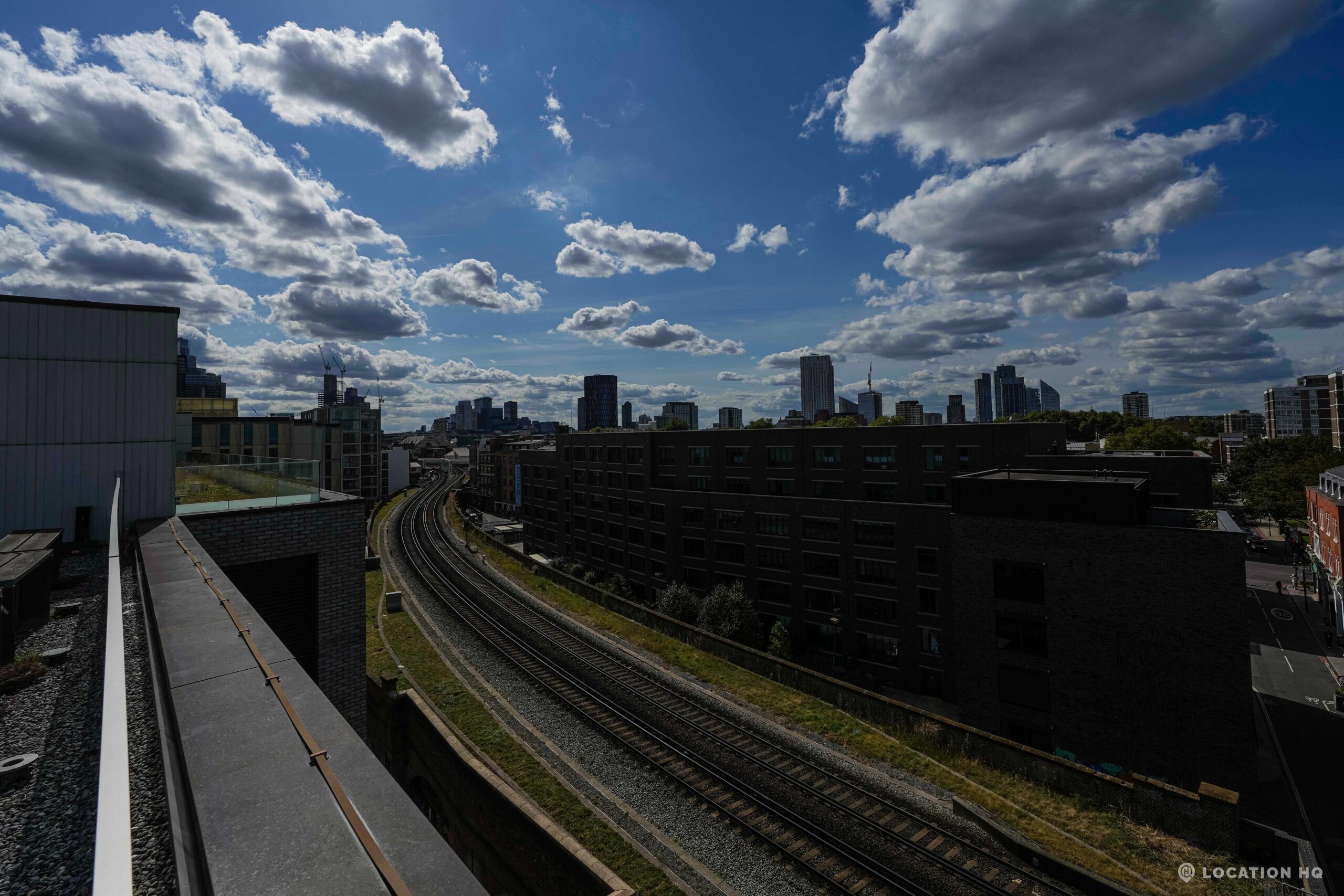 Expansive rooftop location featuring striking views of London’s skyline and adjacent railway tracks, ideal for dramatic urban scenes. The setting combines industrial character with sweeping city vistas, offering filmmakers a versatile backdrop for action sequences, atmospheric shoots, or stylish cityscape photography.